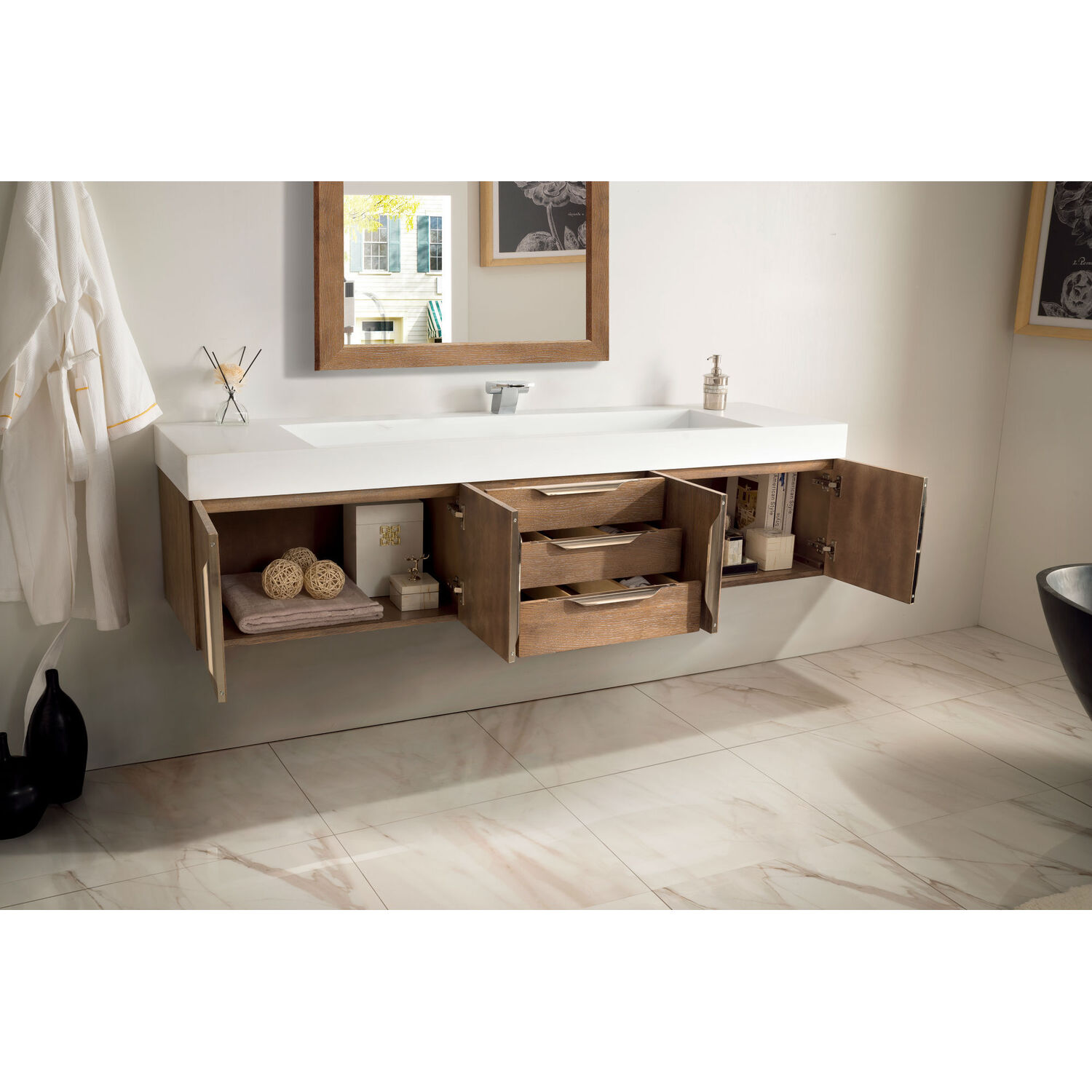 The Columbia 72" Latte Oak Single Vanity offers maximum storage with four soft-closing doors and three soft-closing drawers. This cabinet includes premium features such as one solid bamboo drawer organizer and one 120 Volt UL Rated electrical component with two electrical and two USB outlets. Cabinet includes Brushed Nickel door and drawer pulls. Glossy White Composite Stone countertop with integrated wide, angled trough-style sink. This wall-mounted vanity includes heavy duty mounting brackets to create a modern look.Composite stone integrated sink top in Glossy WhiteSolid plywood with Red Oak Veneers120 Volt UL rated electrical component with two electrical and two USB (2.0) outletsFour doors, three drawersDrawer bottoms are lined with our signature brushed aluminum laminate.Solid bamboo in-drawer organizerStainless Steel Hardware in Brushed NickelThis cabinet can be wall-mounted; mounting hardware includedDiscover elegance redefined with the Columbia Vanity Collection by James Martin Vanities. A testament to modern luxury, this collection brings a transformative touch to your bathroom space. With a choice of three cabinet finishes, each piece in the Columbia collection is a blend of minimalist aesthetics and functional brilliance, featuring sleek, clean lines and sculpted hardware in three metal finish options. Whether you prefer a striking, free-standing statement piece or a sleek, space-saving wall-mounted design, the Columbia collection caters to your unique style. Its innovative installation options, including an optional metal base, ensure a seamless fit into any bathroom layout. The beautiful yet durable composite stone integrated sinktop is impact-resistant with an antibacterial nano-coat surface."1 year warranty against manufacturer's defects. We will repair or replace any defective product, if the product is defective in material or workmanship at our discretion. No warranty is expressed or implied regarding damages resulting from consumer misuse.