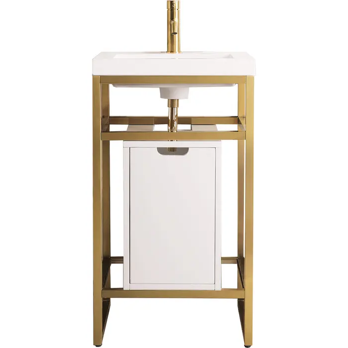 The Boston 20" Stainless Steel Console by James Martin Vanities is a beautiful small space solution that will work well in any powder room. This space-conscious console is crafted with a durable stainless-steel base with a Radiant Gold finish giving you the clean lines and an open view that will work well with a variety of different decors. This versatile cabinet includes a White Glossy composite top with an integrated sink for a modern clean look that is pre-drilled for your convenience for a single hole faucet (faucet not included with purchase). The modern designed storage cabinet below is the perfect place to stow extra towels or any other bathroom essential you may need.Radiant Gold single console vanity with 12" Glossy White storage cabinetSolid kiln-dried Grade A hardwoodStorage cabinet is finished inside and out with a premium undercoat finish for superior moisture and UV resistanceSoft-close door hingesWhite Glossy Composite Stone integrated top and sink includedCountertop is pre-drilled for one single hole faucetFaucet sold separatelyThe Boston Collection by James Martin is an artisan crafted group that pairs the modern texture of stainless steel with the enduring beauty of solid surface tops. This modern collection ranges in sizes from small space solutions at 20-in single console to a 63-in double consoles that can work in any master bathroom. Metal legs allow you to easily clean beneath this piece and as well give giving an open view option which makes the room seem larger. The lower open area of the cabinet can be used for handy storage of your extra towels or bath essentials. This collection is the perfect combination of function and beauty, with it mix of metals and mineral composite tops. The solid surface top is nonporous and scratch resistant. Each piece is pre-drilled for a single faucet (faucet is not sold with set) and sold as a total package.1 year warranty against manufacturer's defects. We will repair or replace any defective product, if the product is defective in material or workmanship at our discretion. No warranty is expressed or implied regarding damages resulting from consumer misuse.