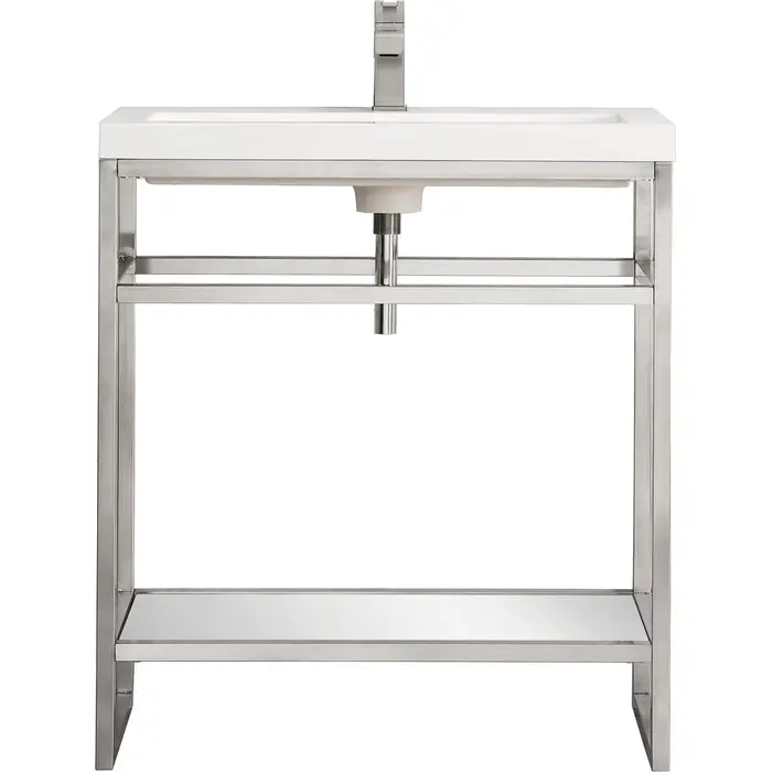 The Boston 31.5" Stainless Steel Console by James Martin Vanities is a beautiful small space solution that will work well in any powder room. This space-conscious console is crafted with a durable stainless-steel base with a Brushed Nickel finish giving you the clean lines and an open view that will work well with a variety of different decors. This versatile cabinet includes a White Glossy composite top with an integrated sink for a modern clean look that is pre-drilled for your convenience for a single hole faucet (faucet not included with purchase). The lower shelf is the perfect place to stow extra towels or any other bathroom essential you may need.Brushed Nickel single console vanityWhite Glossy Composite Stone integrated top and sink includedCountertop is pre-drilled for one single hole faucetFaucet sold separatelyThe Boston Collection by James Martin is an artisan crafted group that pairs the modern texture of stainless steel with the enduring beauty of solid surface tops. This modern collection ranges in sizes from small space solutions at 20-in single console to a 63-in double consoles that can work in any master bathroom. Metal legs allow you to easily clean beneath this piece and as well give giving an open view option which makes the room seem larger. The lower open area of the cabinet can be used for handy storage of your extra towels or bath essentials. This collection is the perfect combination of function and beauty, with it mix of metals and mineral composite tops. The solid surface top is nonporous and scratch resistant. Each piece is pre-drilled for a single faucet (faucet is not sold with set) and sold as a total package.1 year warranty against manufacturer's defects. We will repair or replace any defective product, if the product is defective in material or workmanship at our discretion. No warranty is expressed or implied regarding damages resulting from consumer misuse.