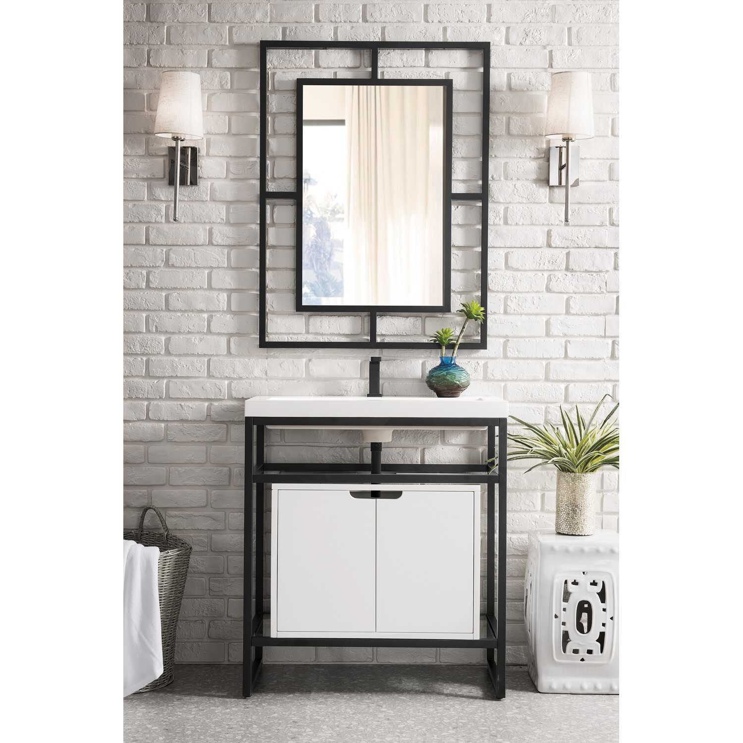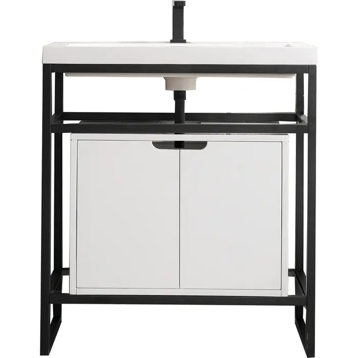 The Boston 31.5" Stainless Steel Console by James Martin Vanities is a beautiful small space solution that will work well in any powder room. This space-conscious console is crafted with a durable stainless-steel base with a Matte Black finish giving you the clean lines and an open view that will work well with a variety of different decors. This versatile cabinet includes a White Glossy composite top with an integrated sink for a modern clean look that is pre-drilled for your convenience for a single hole faucet (faucet not included with purchase). The modern designed storage cabinet below is the perfect place to stow extra towels or any other bathroom essential you may need.Matte Black single console vanity with 25" Glossy White storage cabinetSolid kiln-dried Grade A hardwoodStorage cabinet is finished inside and out with a premium undercoat finish for superior moisture and UV resistanceSoft-close door hingesWhite Glossy Composite Stone integrated top and sink includedCountertop is pre-drilled for one single hole faucetFaucet sold separatelyThe Boston Collection by James Martin is an artisan crafted group that pairs the modern texture of stainless steel with the enduring beauty of solid surface tops. This modern collection ranges in sizes from small space solutions at 20-in single console to a 63-in double consoles that can work in any master bathroom. Metal legs allow you to easily clean beneath this piece and as well give giving an open view option which makes the room seem larger. The lower open area of the cabinet can be used for handy storage of your extra towels or bath essentials. This collection is the perfect combination of function and beauty, with it mix of metals and mineral composite tops. The solid surface top is nonporous and scratch resistant. Each piece is pre-drilled for a single faucet (faucet is not sold with set) and sold as a total package.1 year warranty against manufacturer's defects. We will repair or replace any defective product, if the product is defective in material or workmanship at our discretion. No warranty is expressed or implied regarding damages resulting from consumer misuse.