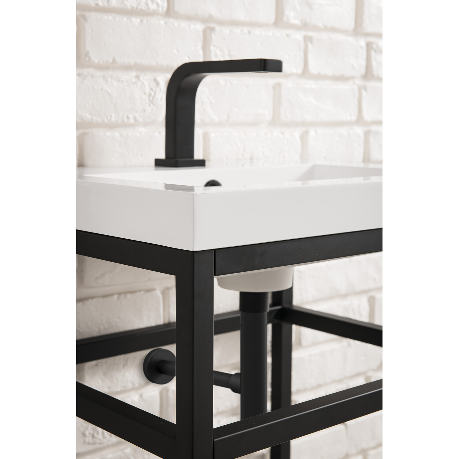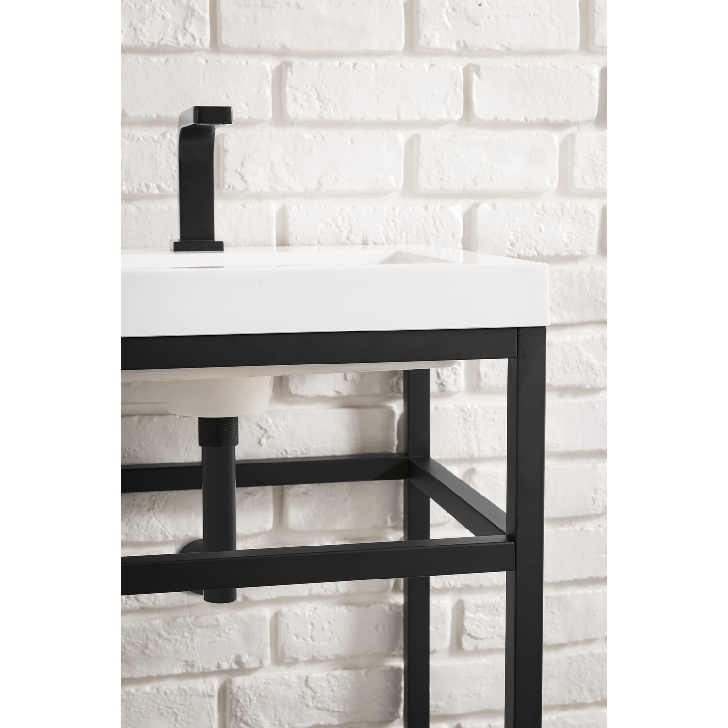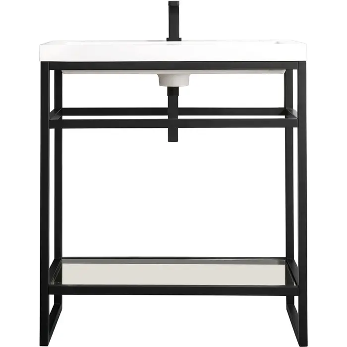 The Boston 31.5" Stainless Steel Console by James Martin Vanities is a beautiful small space solution that will work well in any powder room. This space-conscious console is crafted with a durable stainless-steel base with a Matte Black finish giving you the clean lines and an open view that will work well with a variety of different decors. This versatile cabinet includes a White Glossy composite top with an integrated sink for a modern clean look that is pre-drilled for your convenience for a single hole faucet (faucet not included with purchase). The lower shelf is the perfect place to stow extra towels or any other bathroom essential you may need.Matte Black single console vanityWhite Glossy Composite Stone integrated top and sink includedCountertop is pre-drilled for one single hole faucetFaucet sold separatelyThe Boston Collection by James Martin is an artisan crafted group that pairs the modern texture of stainless steel with the enduring beauty of solid surface tops. This modern collection ranges in sizes from small space solutions at 20-in single console to a 63-in double consoles that can work in any master bathroom. Metal legs allow you to easily clean beneath this piece and as well give giving an open view option which makes the room seem larger. The lower open area of the cabinet can be used for handy storage of your extra towels or bath essentials. This collection is the perfect combination of function and beauty, with it mix of metals and mineral composite tops. The solid surface top is nonporous and scratch resistant. Each piece is pre-drilled for a single faucet (faucet is not sold with set) and sold as a total package.1 year warranty against manufacturer's defects. We will repair or replace any defective product, if the product is defective in material or workmanship at our discretion. No warranty is expressed or implied regarding damages resulting from consumer misuse.