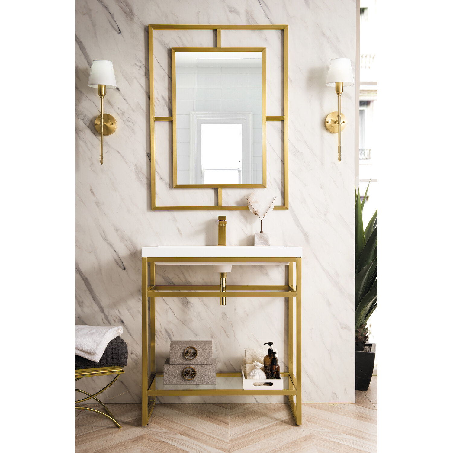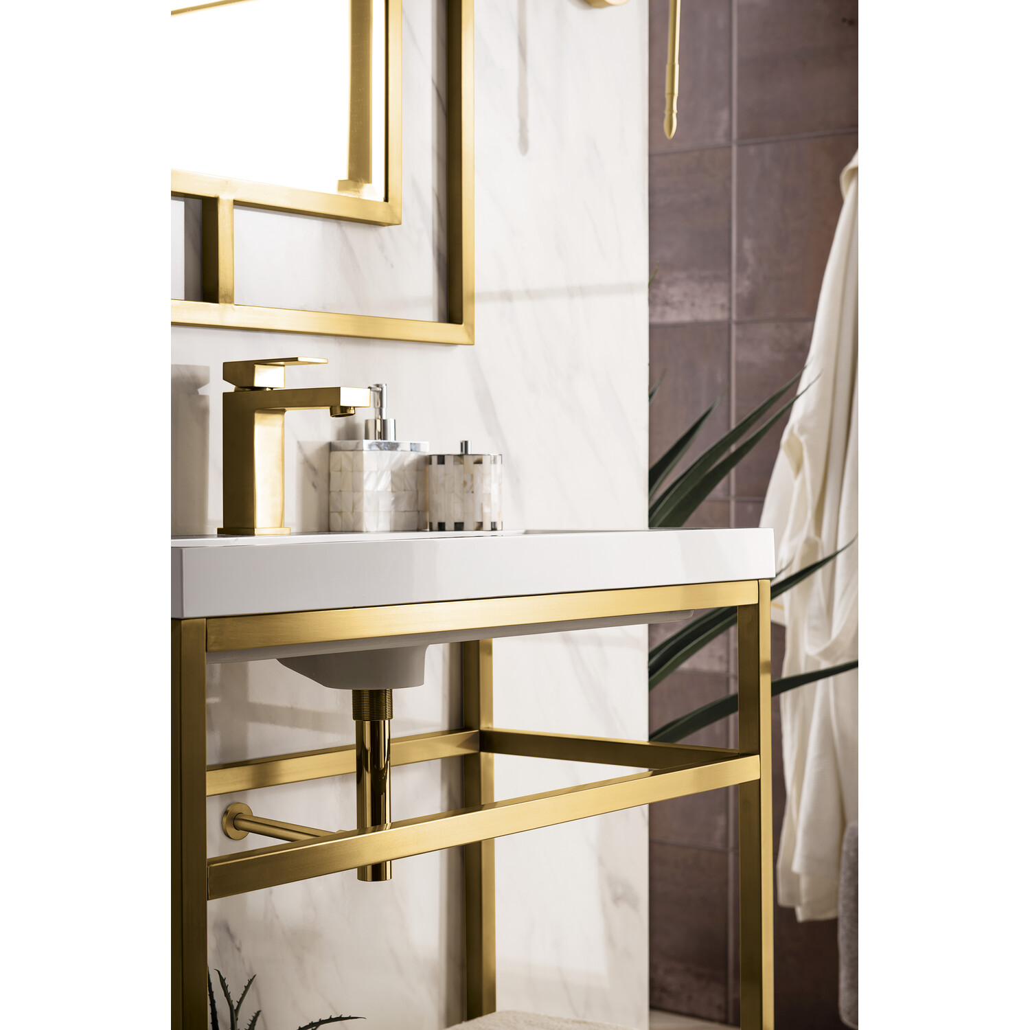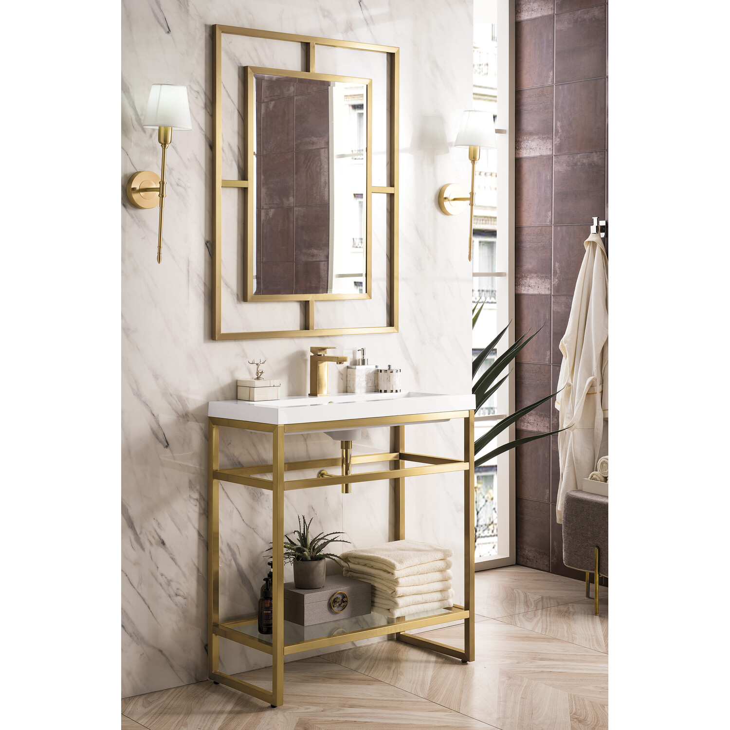 The Boston 31.5" Stainless Steel Console by James Martin Vanities is a beautiful small space solution that will work well in any powder room. This space-conscious console is crafted with a durable stainless-steel base with a Radiant Gold finish giving you the clean lines and an open view that will work well with a variety of different decors. This versatile cabinet includes a White Glossy composite top with an integrated sink for a modern clean look that is pre-drilled for your convenience for a single hole faucet (faucet not included with purchase). The lower shelf is the perfect place to stow extra towels or any other bathroom essential you may need.Radiant Gold single console vanityWhite Glossy Composite Stone integrated top and sink includedCountertop is pre-drilled for one single hole faucetFaucet sold separatelyThe Boston Collection by James Martin is an artisan crafted group that pairs the modern texture of stainless steel with the enduring beauty of solid surface tops. This modern collection ranges in sizes from small space solutions at 20-in single console to a 63-in double consoles that can work in any master bathroom. Metal legs allow you to easily clean beneath this piece and as well give giving an open view option which makes the room seem larger. The lower open area of the cabinet can be used for handy storage of your extra towels or bath essentials. This collection is the perfect combination of function and beauty, with it mix of metals and mineral composite tops. The solid surface top is nonporous and scratch resistant. Each piece is pre-drilled for a single faucet (faucet is not sold with set) and sold as a total package.1 year warranty against manufacturer's defects. We will repair or replace any defective product, if the product is defective in material or workmanship at our discretion. No warranty is expressed or implied regarding damages resulting from consumer misuse.
