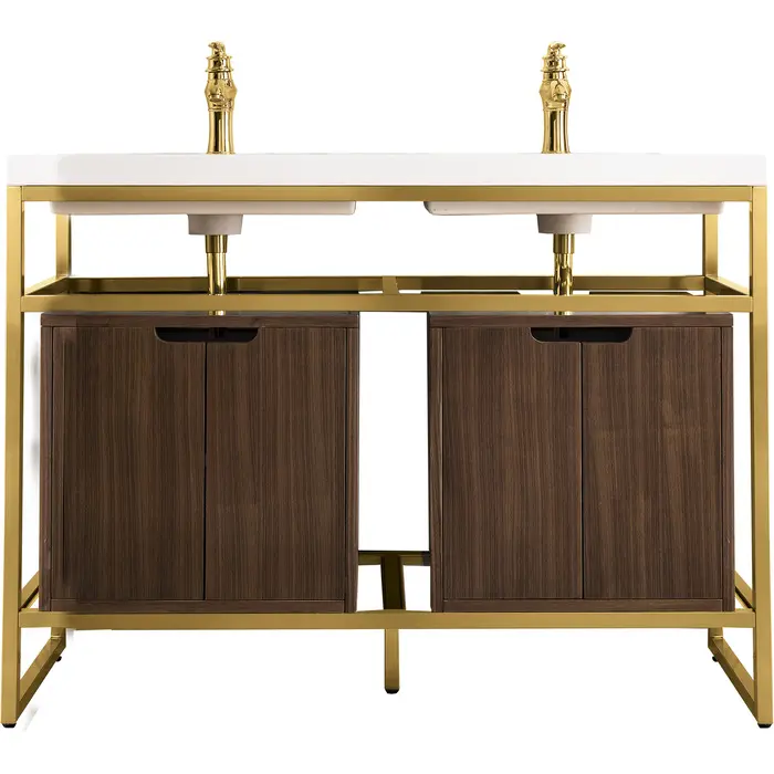 The Boston 47" Stainless Steel Double Basin Console by James Martin Vanities will add a sleek, bold look to any bathroom. This metal framed console is crafted with a durable stainless-steel base with a Radiant Gold finish giving you the clean lines and an open view that will work well with a variety of different decors. This versatile cabinet includes a White Glossy composite top with double sinks for a modern clean look that is pre-drilled for your convenience. The modern designed storage cabinet below provides generous storage for towels and toiletries.Radiant Gold double console vanity with 19" Mid-Century Walnut storage cabinetSolid kiln-dried Grade A hardwoodStorage cabinet is finished inside and out with a premium undercoat finish for superior moisture and UV resistanceSoft-close door hingesWhite Glossy Composite Stone integrated top and sink includedCountertop is pre-drilled for two single hole faucetsFaucets sold separatelyThe Boston Collection by James Martin is an artisan crafted group that pairs the modern texture of stainless steel with the enduring beauty of solid surface tops. This modern collection ranges in sizes from small space solutions at 20-in single console to a 63-in double consoles that can work in any master bathroom. Metal legs allow you to easily clean beneath this piece and as well give giving an open view option which makes the room seem larger. The lower open area of the cabinet can be used for handy storage of your extra towels or bath essentials. This collection is the perfect combination of function and beauty, with it mix of metals and mineral composite tops. The solid surface top is nonporous and scratch resistant. Each piece is pre-drilled for a single faucet (faucet is not sold with set) and sold as a total package.1 year warranty against manufacturer's defects. We will repair or replace any defective product, if the product is defective in material or workmanship at our discretion. No warranty is expressed or implied regarding damages resulting from consumer misuse.