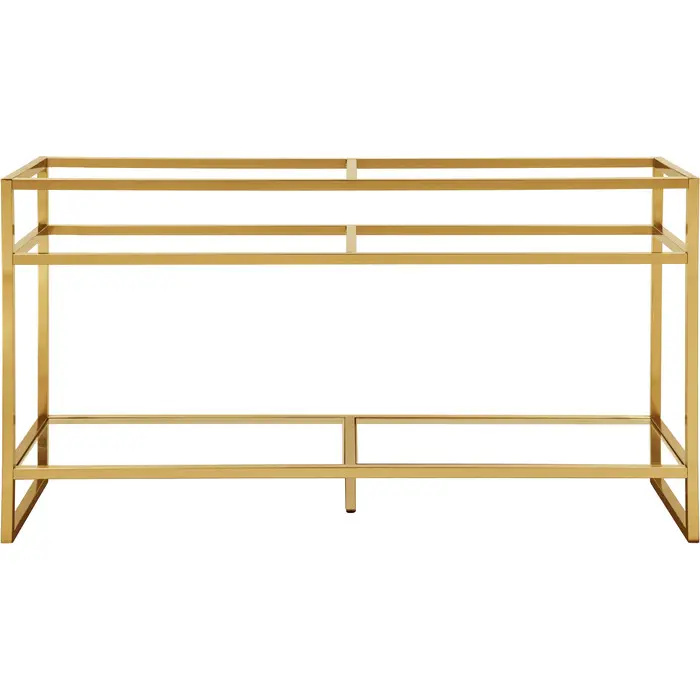 The Boston 63" Stainless Steel Double Basin Console by James Martin Vanities will add a sleek, bold look to any bathroom. This metal framed console is crafted with a durable stainless-steel base with a Radiant Gold finish giving you the clean lines and an open view that will work well with a variety of different decors. This versatile cabinet includes a White Glossy Composite Stone top with double sinks for a modern clean look that is pre-drilled for your convenience. The lower shelf area provides generous storage for towels and toiletries.Radiant Gold double console base onlyPlease note: Console base only, countertop and storage cabinet not includedThe Boston Collection by James Martin is an artisan crafted group that pairs the modern texture of stainless steel with the enduring beauty of solid surface tops. This modern collection ranges in sizes from small space solutions at 20-in single console to a 63-in double consoles that can work in any master bathroom. Metal legs allow you to easily clean beneath this piece and as well give giving an open view option which makes the room seem larger. The lower open area of the cabinet can be used for handy storage of your extra towels or bath essentials. This collection is the perfect combination of function and beauty, with it mix of metals and solid surface tops. The solid surface top is nonporous and scratch resistant. Each piece is pre-drilled for a single faucet (faucet is not sold with set) and sold as a total package.1 year warranty against manufacturer's defects. We will repair or replace any defective product, if the product is defective in material or workmanship at our discretion. No warranty is expressed or implied regarding damages resulting from consumer misuse.