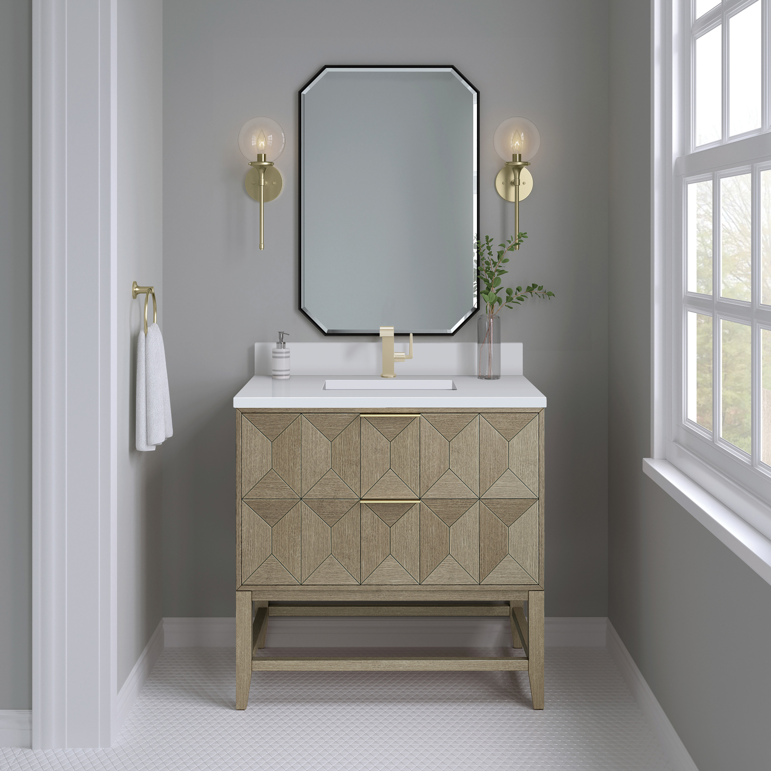 Inspired by today's modern furnishings, characterized by clean lines juxtaposed with unexpected artisan details, the 36" Emmeline creates a bold statement. A solid Ash wood base frame supports a faceted front vanity cabinet featuring two spacious drawers lined with an aluminum laminate surface. The lightly wire-brushed Ash veneer in a Pebble Oak finish adds authentic drama, allowing this vanity to work into any bath space. Adding an elegant contrast is a crisp 3 CM White Zeus Silestone Top and backsplash with undermount sinks.Vanity set includes a 3cm eased edge White Zeus Silestone top with matching backsplash, a white porcelain rectangular sink and mounting brackets for easy installation. Top is pre-drilled for single hole faucet. Faucet not included.Two drawer cabinetConstructed of a solid Ash wood frame with moisture-resistant MDF panels that are covered with solid Ash wood veneers.Drawer boxes are constructed using English Dovetail joinery, feature soft-close undermount glides and a Brushed Aluminum laminate drawer bottom.Tab style door pulls in Champagne Brass finishIncludes one finish-match solid Ash organizer with a Brushed Aluminum laminate bottom.Matching White Zeus 3cm Silestone backsplash included.Faucet sold separatelyThe sculptural Emmeline Collection is a marriage of form and function. Available in three sizes, this collection features dramatic, faceted panel drawers which offer ample storage as well as a removable drawer organizer for added convenience. The Pebble Oak finish highlights the geometric pattern of the wire-brushed grain, while the complex shapes add visual and tactile depth, making Emmeline a functional work of art.1 year warranty against manufacturer's defects. We will repair or replace any defective product, if the product is defective in material or workmanship at our discretion. No warranty is expressed or implied regarding damages resulting from consumer misuse.