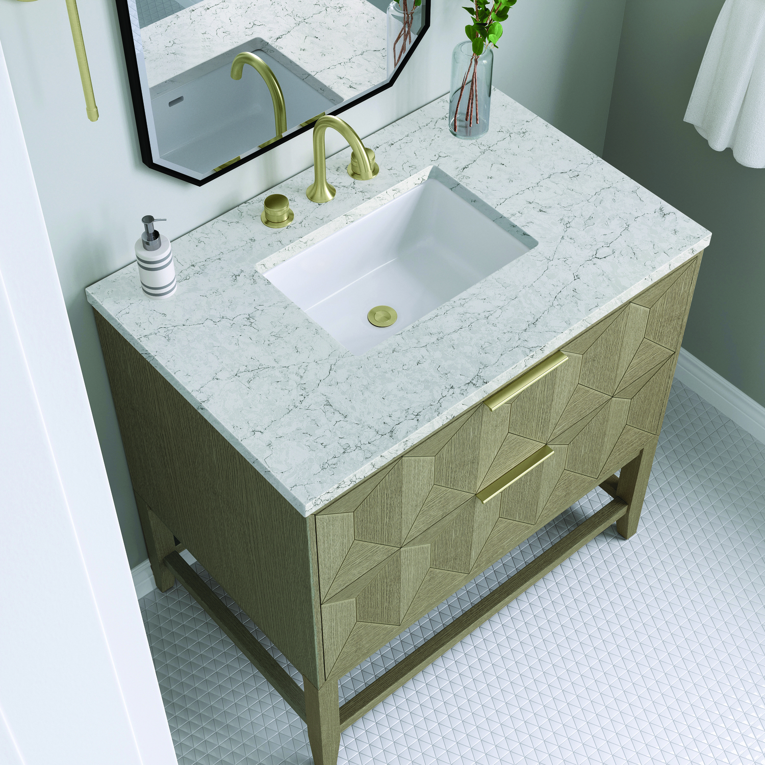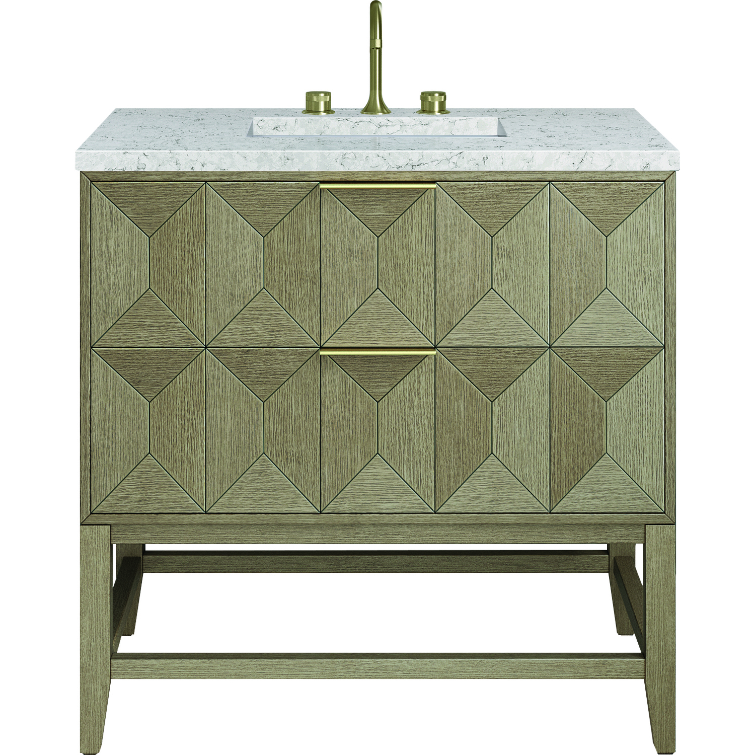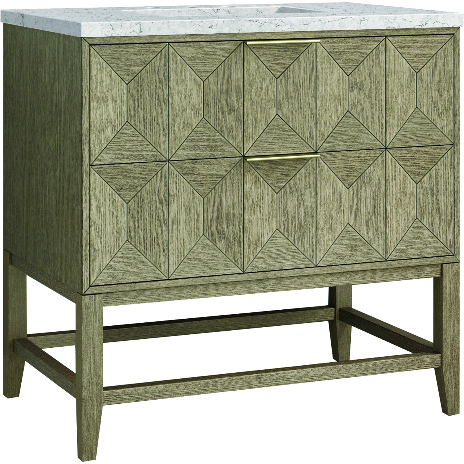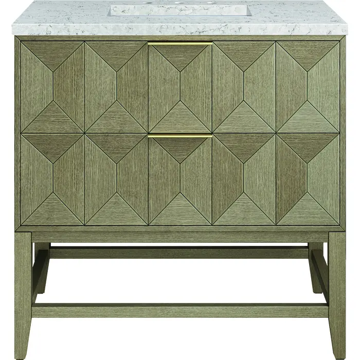 Inspired by today's modern furnishings, characterized by clean lines juxtaposed with unexpected artisan details, the 36" Emmeline creates a bold statement. A solid Ash wood base frame supports a faceted front Vanity Cabinet featuring two spacious drawers lined with an aluminum laminate surface. The lightly wire-brushed Ash veneer in a Pebble Oak finish adds authentic drama, allowing this vanity to work into any bath space. The Eternal Jasmine Pearl Silestone by Cosentino features an elegant white background with beautiful marbleized faint and dark blue-gray veining patterns.3 CM eased edge Eternal Jasmine Pearl Silestone top includes a white porcelain rectangular sink that ships separately and includes mounting brackets for easy installation. Faucet not included.The drawer box features English Dovetail joinery, and our signature brushed aluminum laminate drawer liners for easy cleaningThe drawer boxes feature English Dovetail joinery, and our signature brushed aluminum laminate drawer liners for easy cleaningTwo drawer cabinetIncludes one removable drawer organizer lined with our signature aluminum laminate, located on the right side of the lower drawerTab style door pulls in Champagne Brass finishSoft-close, full extension, undermount drawer glidesThe sculptural Emmeline Collection is a marriage of form and function. Available in three sizes, this collection features dramatic, faceted panel drawers which offer ample storage as well as a removable drawer organizer for added convenience. The Pebble Oak finish highlights the geometric pattern of the wire-brushed grain, while the complex shapes add visual and tactile depth, making Emmeline a functional work of art.1 year warranty against manufacturer's defects. We will repair or replace any defective product, if the product is defective in material or workmanship at our discretion. No warranty is expressed or implied regarding damages resulting from consumer misuse.