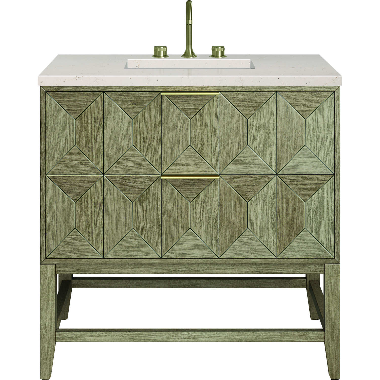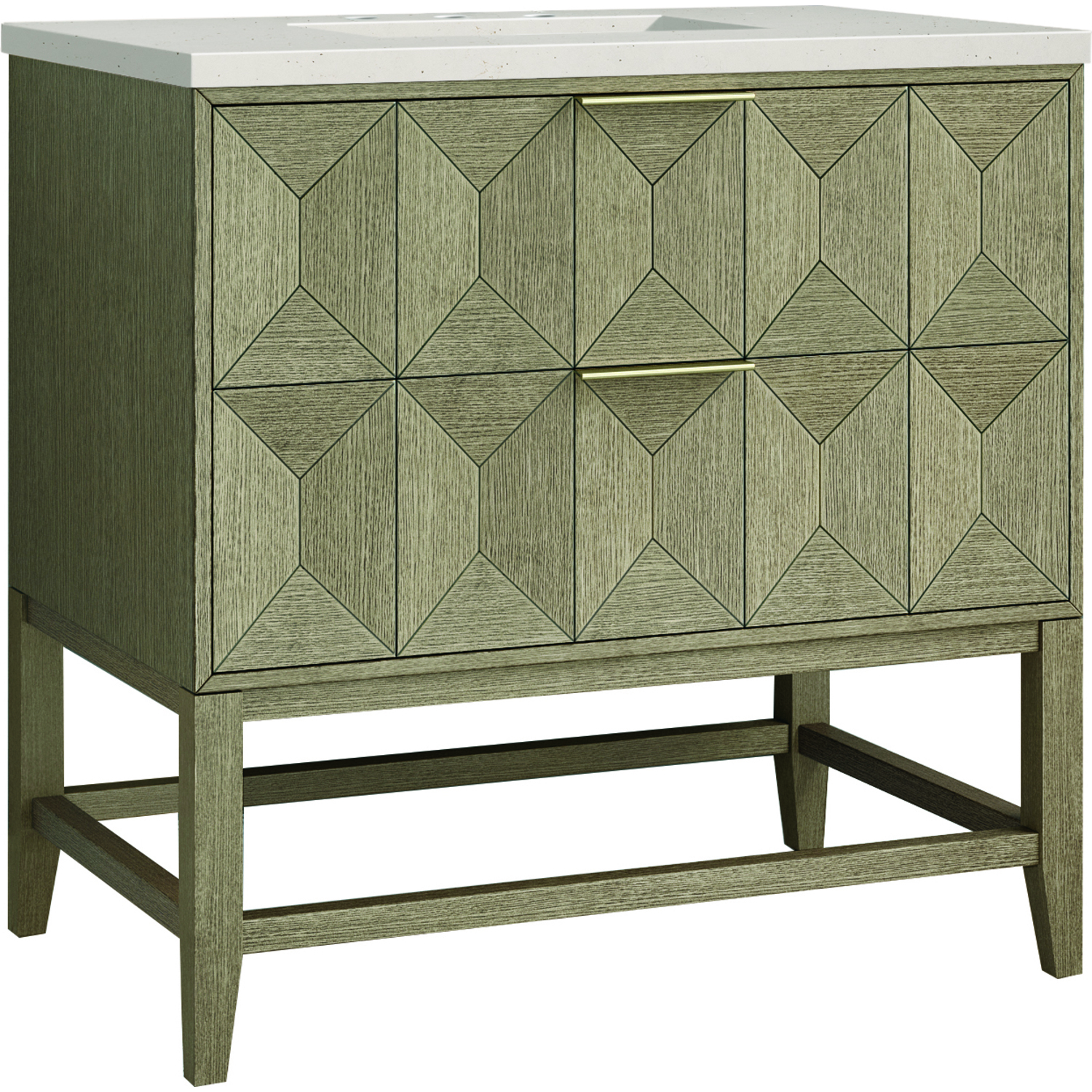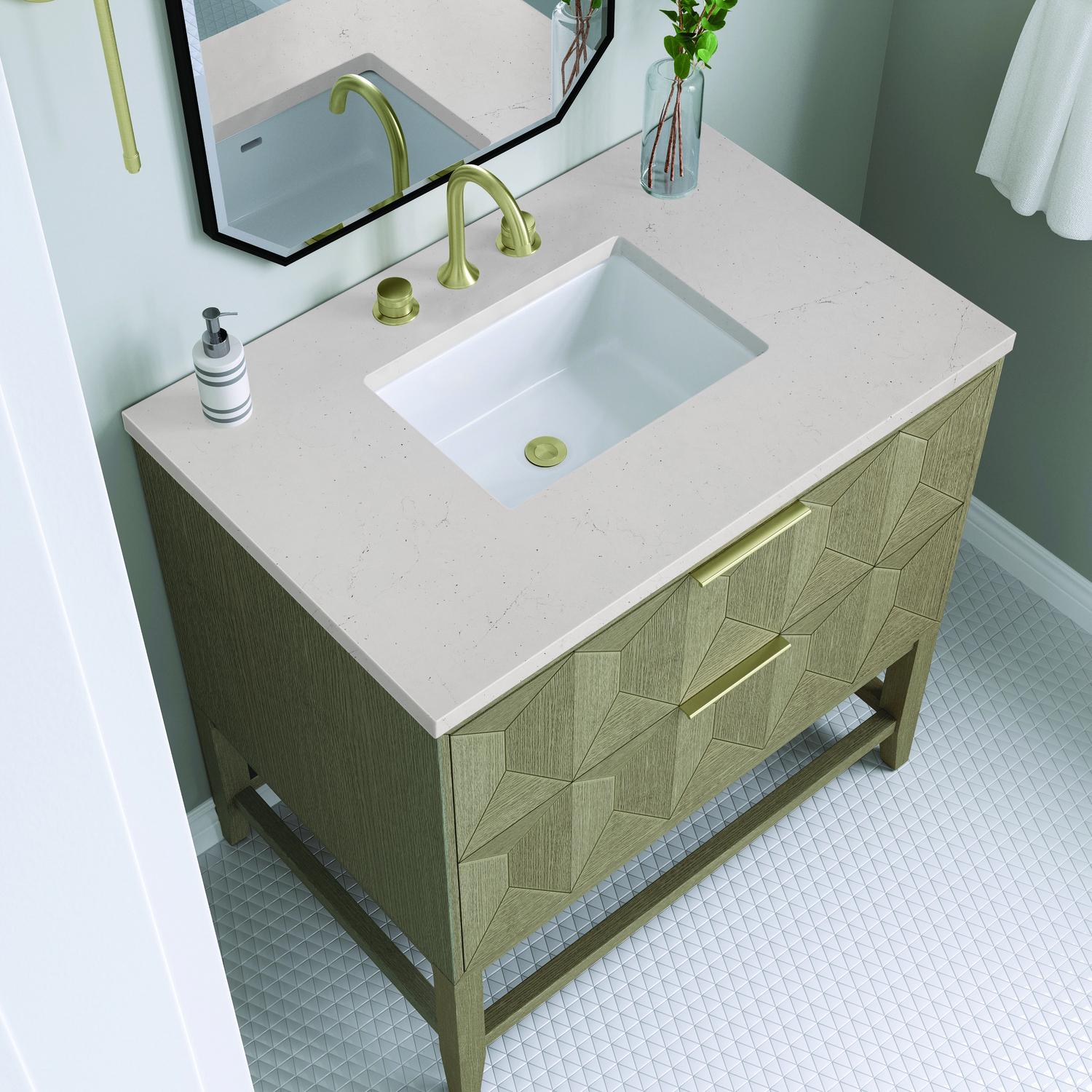 Inspired by today's modern furnishings, characterized by clean lines juxtaposed with unexpected artisan details, the 36" Emmeline creates a bold statement. A solid Ash wood base frame supports a faceted front Vanity Cabinet featuring two spacious drawers lined with an aluminum laminate surface. The lightly wire-brushed Ash veneer in a Pebble Oak finish adds authentic drama, allowing this vanity to work into any bath space. The classic, warm tones of the Eternal Marfil Silestone top by Cosentino provide an elegant, tonal contrast to the modern Chestnut finish.3 CM eased edge Eternal Marfil Silestone top includes a white porcelain rectangular sink that ships separately and includes mounting brackets for easy installation. Faucet not included.The drawer box features English Dovetail joinery, and our signature brushed aluminum laminate drawer liners for easy cleaningThe drawer boxes feature English Dovetail joinery, and our signature brushed aluminum laminate drawer liners for easy cleaningTwo drawer cabinetIncludes one removable drawer organizer lined with our signature aluminum laminate, located on the right side of the lower drawerTab style door pulls in Champagne Brass finishSoft-close, full extension, undermount drawer glidesThe sculptural Emmeline Collection is a marriage of form and function. Available in three sizes, this collection features dramatic, faceted panel drawers which offer ample storage as well as a removable drawer organizer for added convenience. The Pebble Oak finish highlights the geometric pattern of the wire-brushed grain, while the complex shapes add visual and tactile depth, making Emmeline a functional work of art.1 year warranty against manufacturer's defects. We will repair or replace any defective product, if the product is defective in material or workmanship at our discretion. No warranty is expressed or implied regarding damages resulting from consumer misuse.