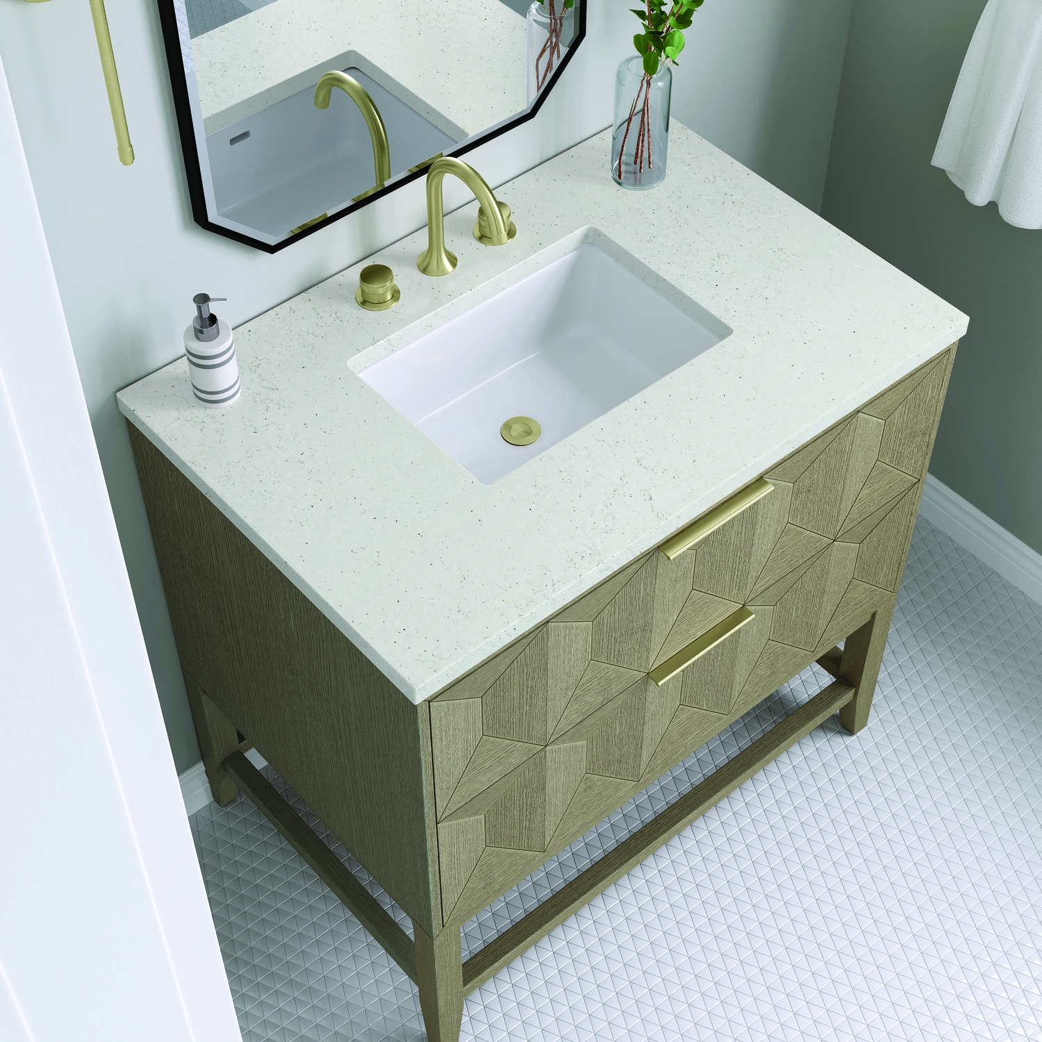 Inspired by today's modern furnishings, characterized by clean lines juxtaposed with unexpected artisan details, the 36" Emmeline creates a bold statement. A solid Ash wood base frame supports a faceted front vanity cabinet featuring two spacious drawers lined with an aluminum laminate surface. The lightly wire-brushed Ash veneer in a Pebble Oak finish adds authentic drama, allowing this vanity to work into any bath space. Adding an elegant complement to the wood finish and Champagne Brass hardware, is the Lime Delight Silestone top which lends warm, textured beige tones to perfectly complete the look.Vanity set includes a 3cm eased edge Limestone Delight Silestone top. Includes a white porcelain rectangular undermount sink that ships separately and mounting brackets for easy installation. Top is pre-drilled for 8" widespread faucet. Faucet not includeTwo drawer cabinetConstructed of a solid Ash wood frame with moisture-resistant MDF panels that are covered with solid Ash wood veneers.Drawer boxes are constructed using English Dovetail joinery, feature soft-close undermount glides and a Brushed Aluminum laminate drawer bottom.Tab style door pulls in Champagne Brass finishIncludes one finish-match solid Ash organizer with a Brushed Aluminum laminate bottom.Faucet sold separatelyCountertop is pre-drilled for one 3-hole 8" spreadThe sculptural Emmeline Collection is a marriage of form and function. Available in three sizes, this collection features dramatic, faceted panel drawers which offer ample storage as well as a removable drawer organizer for added convenience. The Pebble Oak finish highlights the geometric pattern of the wire-brushed grain, while the complex shapes add visual and tactile depth, making Emmeline a functional work of art.1 year warranty against manufacturer's defects. We will repair or replace any defective product, if the product is defective in material or workmanship at our discretion. No warranty is expressed or implied regarding damages resulting from consumer misuse.