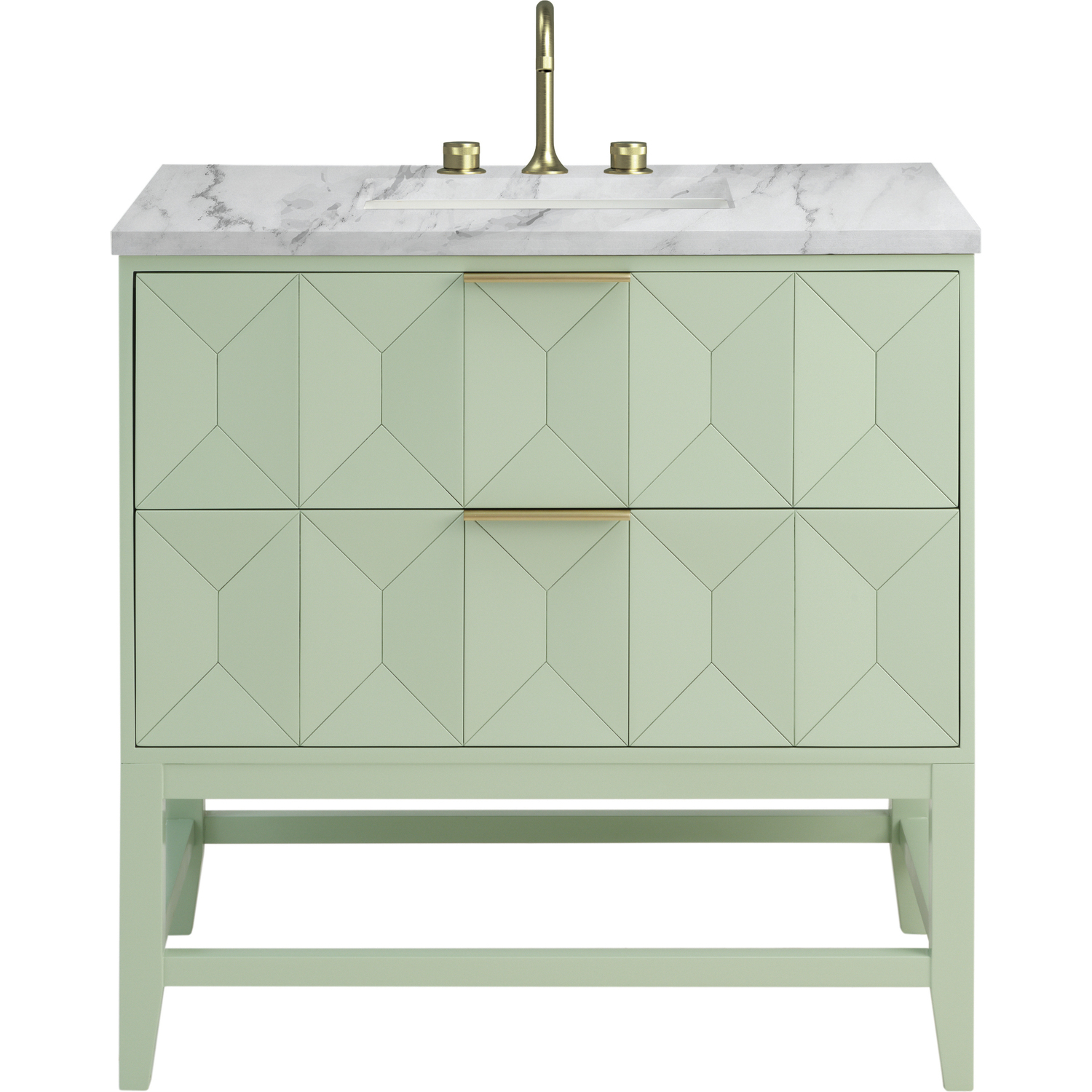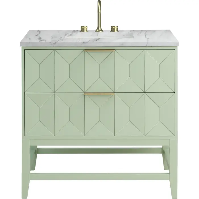The Emmeline 36" Single Vanity by James Martin Vanities makes a bold statement with its charming Pistachio finish and dramatic, faceted drawer fronts. Inspired by modern furnishings and characterized by clean lines juxtaposed with unexpected artisan details, the Emmeline boasts a solid Beech wood frame and two full-extension drawers lined with our signature aluminum laminate for easy cleaning. A finish-matched drawer organizer and tab-style pulls in Champagne Brass add the finishing touches to this vanity. The addition of a beautiful Eternal Jasmine Pearl Silestone® top with undermount sink completes the look.Two drawer cabinetDrawer boxes feature English Dovetail joinery with premium, soft-close undermount drawer slidesCabinet features a multi-stage premium finish coat to offer UV and moisture resistancePistachio finish with Champagne Brass tab-style hardwareCountertop is pre-drilled for 8" widespread faucet(s); our 3cm eased edge countertops come with white porcelain rectangular sink(s) that ship separately and include mounting brackets for easy installationFaucet(s) sold separatelyDrawers lined with our signature brushed aluminum laminate for easy cleaningIncludes one removable drawer organizer, matched to finishFreestanding VanityMatching stone backsplash available as add-on purchaseCrafted with meticulous attention to detail, the sculptural Emmeline Collection seamlessly blends artistry with functionality. Available in three sizes, this collection features dramatic, faceted panel drawers which offer ample storage as well as a removable drawer organizer for added convenience. The geometric design provides both visual intrigue and tactile delight, making Emmeline a functional work of art and the perfect statement piece for any luxurious bathroom.1 year warranty against manufacturer's defects. We will repair or replace any defective product, if the product is defective in material or workmanship at our discretion. No warranty is expressed or implied regarding damages resulting from consumer misuse.