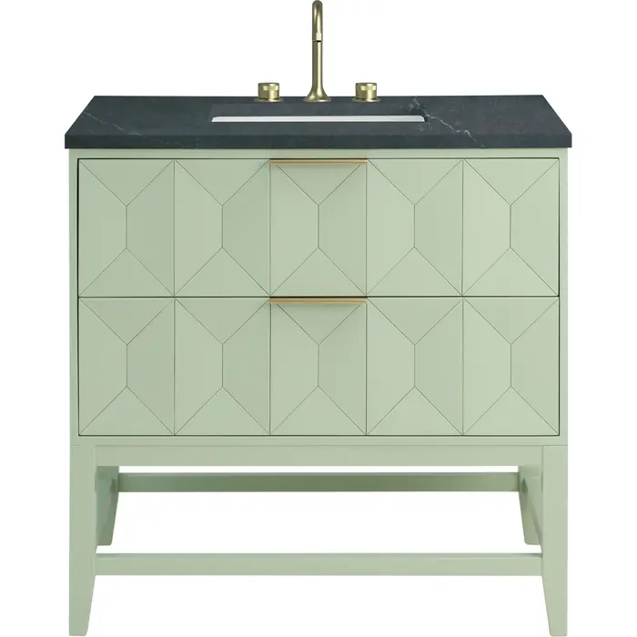 The Emmeline 36" Single Vanity by James Martin Vanities makes a bold statement with its charming Pistachio finish and dramatic, faceted drawer fronts. Inspired by modern furnishings and characterized by clean lines juxtaposed with unexpected artisan details, the Emmeline boasts a solid Beech wood frame and two full-extension drawers lined with our signature aluminum laminate for easy cleaning. A finish-matched drawer organizer and tab-style pulls in Champagne Brass add the finishing touches to this vanity. The addition of a suede-finished Charcoal Soapstone Silestone® top with undermount sink completes the look.Two drawer cabinetDrawer boxes feature English Dovetail joinery with premium, soft-close undermount drawer slidesCabinet features a multi-stage premium finish coat to offer UV and moisture resistancePistachio finish with Champagne Brass tab-style hardwareCountertop is pre-drilled for 8" widespread faucet(s); our 3cm eased edge countertops come with white porcelain rectangular sink(s) that ship separately and include mounting brackets for easy installationFaucet(s) sold separatelyDrawers lined with our signature brushed aluminum laminate for easy cleaningIncludes one removable drawer organizer, matched to finishFreestanding VanityMatching stone backsplash available as add-on purchaseCrafted with meticulous attention to detail, the sculptural Emmeline Collection seamlessly blends artistry with functionality. Available in three sizes, this collection features dramatic, faceted panel drawers which offer ample storage as well as a removable drawer organizer for added convenience. The geometric design provides both visual intrigue and tactile delight, making Emmeline a functional work of art and the perfect statement piece for any luxurious bathroom.1 year warranty against manufacturer's defects. We will repair or replace any defective product, if the product is defective in material or workmanship at our discretion. No warranty is expressed or implied regarding damages resulting from consumer misuse.