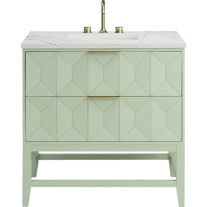 The Emmeline 36" Single Vanity by James Martin Vanities makes a bold statement with its charming Pistachio finish and dramatic, faceted drawer fronts. Inspired by modern furnishings and characterized by clean lines juxtaposed with unexpected artisan details, the Emmeline boasts a solid Beech wood frame and two full-extension drawers lined with our signature aluminum laminate for easy cleaning. A finish-matched drawer organizer and tab-style pulls in Champagne Brass add the finishing touches to this vanity. The addition of a striking Ethereal Noctis Silestone® top with undermount sink completes the look.Two drawer cabinetDrawer boxes feature English Dovetail joinery with premium, soft-close undermount drawer slidesCabinet features a multi-stage premium finish coat to offer UV and moisture resistancePistachio finish with Champagne Brass tab-style hardwareCountertop is pre-drilled for 8" widespread faucet(s); our 3cm eased edge countertops come with white porcelain rectangular sink(s) that ship separately and include mounting brackets for easy installationFaucet(s) sold separatelyDrawers lined with our signature brushed aluminum laminate for easy cleaningIncludes one removable drawer organizer, matched to finishFreestanding VanityMatching stone backsplash available as add-on purchaseCrafted with meticulous attention to detail, the sculptural Emmeline Collection seamlessly blends artistry with functionality. Available in three sizes, this collection features dramatic, faceted panel drawers which offer ample storage as well as a removable drawer organizer for added convenience. The geometric design provides both visual intrigue and tactile delight, making Emmeline a functional work of art and the perfect statement piece for any luxurious bathroom.1 year warranty against manufacturer's defects. We will repair or replace any defective product, if the product is defective in material or workmanship at our discretion. No warranty is expressed or implied regarding damages resulting from consumer misuse.