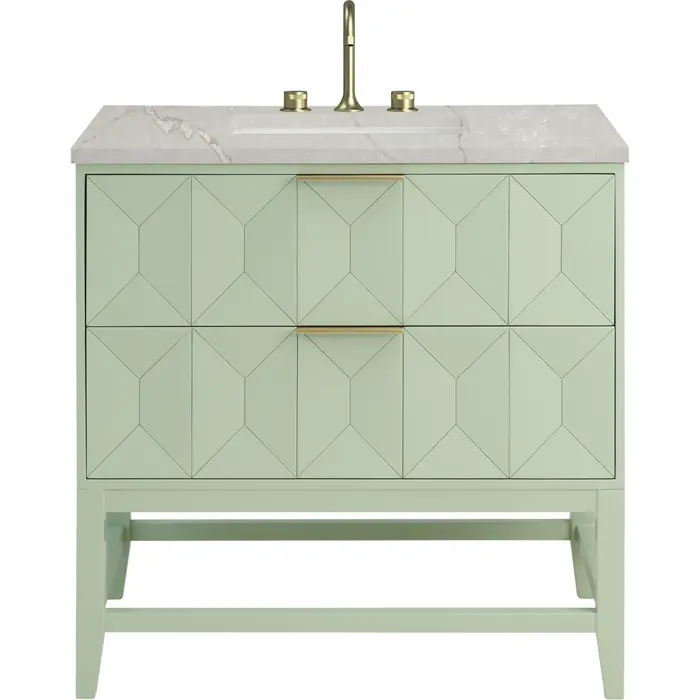 The Emmeline 36" Single Vanity by James Martin Vanities makes a bold statement with its charming Pistachio finish and dramatic, faceted drawer fronts. Inspired by modern furnishings and characterized by clean lines juxtaposed with unexpected artisan details, the Emmeline boasts a solid Beech wood frame and two full-extension drawers lined with our signature aluminum laminate for easy cleaning. A finish-matched drawer organizer and tab-style pulls in Champagne Brass add the finishing touches to this vanity. The addition of a stunning Victorian Silver Silestone® top with undermount sink completes the look.Two drawer cabinetDrawer boxes feature English Dovetail joinery with premium, soft-close undermount drawer slidesCabinet features a multi-stage premium finish coat to offer UV and moisture resistancePistachio finish with Champagne Brass tab-style hardwareCountertop is pre-drilled for 8" widespread faucet(s); our 3cm eased edge countertops come with white porcelain rectangular sink(s) that ship separately and include mounting brackets for easy installationFaucet(s) sold separatelyDrawers lined with our signature brushed aluminum laminate for easy cleaningIncludes one removable drawer organizer, matched to finishFreestanding VanityMatching stone backsplash available as add-on purchaseCrafted with meticulous attention to detail, the sculptural Emmeline Collection seamlessly blends artistry with functionality. Available in three sizes, this collection features dramatic, faceted panel drawers which offer ample storage as well as a removable drawer organizer for added convenience. The geometric design provides both visual intrigue and tactile delight, making Emmeline a functional work of art and the perfect statement piece for any luxurious bathroom.1 year warranty against manufacturer's defects. We will repair or replace any defective product, if the product is defective in material or workmanship at our discretion. No warranty is expressed or implied regarding damages resulting from consumer misuse.