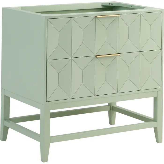 The Emmeline 36" Single Vanity by James Martin Vanities makes a bold statement with its charming Pistachio finish and dramatic, faceted drawer fronts. Inspired by modern furnishings and characterized by clean lines juxtaposed with unexpected artisan details, the Emmeline boasts a solid Beech wood frame and two full-extension drawers lined with our signature aluminum laminate for easy cleaning. A finish-matched drawer organizer and tab-style pulls in Champagne Brass add the finishing touches to this vanity. Complete the look with one of our 3 cm tops.Two drawer cabinetDrawer boxes feature English Dovetail joinery with premium, soft-close undermount drawer slidesCabinet features a multi-stage premium finish coat to offer UV and moisture resistancePistachio finish with Champagne Brass tab-style hardwareCabinet only; select one of our countertops to complete the vanityFaucet(s) sold separatelyDrawers lined with our signature brushed aluminum laminate for easy cleaningIncludes one removable drawer organizer, matched to finishFreestanding VanityMatching stone backsplash available as add-on purchaseCrafted with meticulous attention to detail, the sculptural Emmeline Collection seamlessly blends artistry with functionality. Available in three sizes, this collection features dramatic, faceted panel drawers which offer ample storage as well as a removable drawer organizer for added convenience. The geometric design provides both visual intrigue and tactile delight, making Emmeline a functional work of art and the perfect statement piece for any luxurious bathroom.1 year warranty against manufacturer's defects. We will repair or replace any defective product, if the product is defective in material or workmanship at our discretion. No warranty is expressed or implied regarding damages resulting from consumer misuse.
