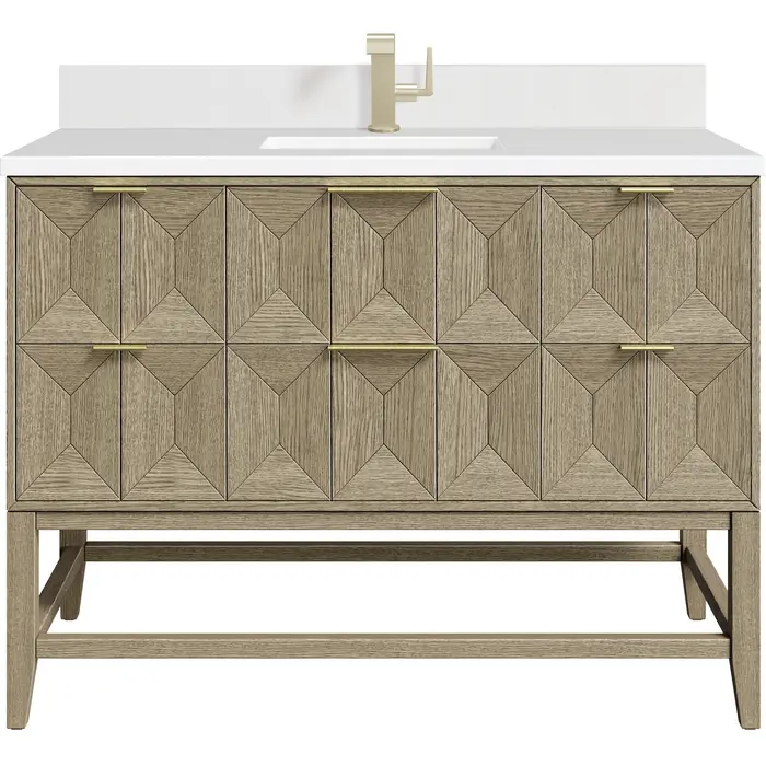 Inspired by today's modern furnishings, characterized by clean lines juxtaposed with unexpected artisan details, the 48" Emmeline creates a bold statement. A solid Ash wood base frame supports a faceted front vanity cabinet featuring five spacious drawers lined with a brushed aluminum laminate. The lightly wire-brushed Ash veneer in a Pebble Oak finish adds authentic drama, allowing this vanity to work into any bath space. The Champagne Brass tab-style hardware adds a layer of sophistication. The White Zeus Silestone top and backsplash by Cosentino is perfect for those who love to innovate without giving up the traditional look and style.Vanity set includes a 3cm eased edge White Zeus Silestone top with matching backsplash, a white porcelain rectangular sink and mounting brackets for easy installation. Top is pre-drilled for single hole faucet. Faucet not included.Drawer boxes feature English dovetail joinery and a brushed aluminum laminate bottom.Includes one finish-match solid Ash wood removable drawer organizer lined with our signature aluminum laminate.Tab-style pulls in Champagne Brass finishDrawers have soft-close, full extension, undermount drawer glides. The top tip-out drawer features soft-closing hinges.Matching White Zeus 3cm Silestone backsplash included.Faucet sold separatelyThe sculptural Emmeline Collection is an marriage of form and function. Available in three sizes, this collection features dramatic, faceted panel drawers, which house ample storage with an removable drawer organizer. The Pebble Oak finish highlights the geometric pattern of the wire-brushed grain, while the complex shapes add both visual and tactile depth, making Emmeline an functional work of art.1 year warranty against manufacturer's defects. We will repair or replace any defective product, if the product is defective in material or workmanship at our discretion. No warranty is expressed or implied regarding damages resulting from consumer misuse.