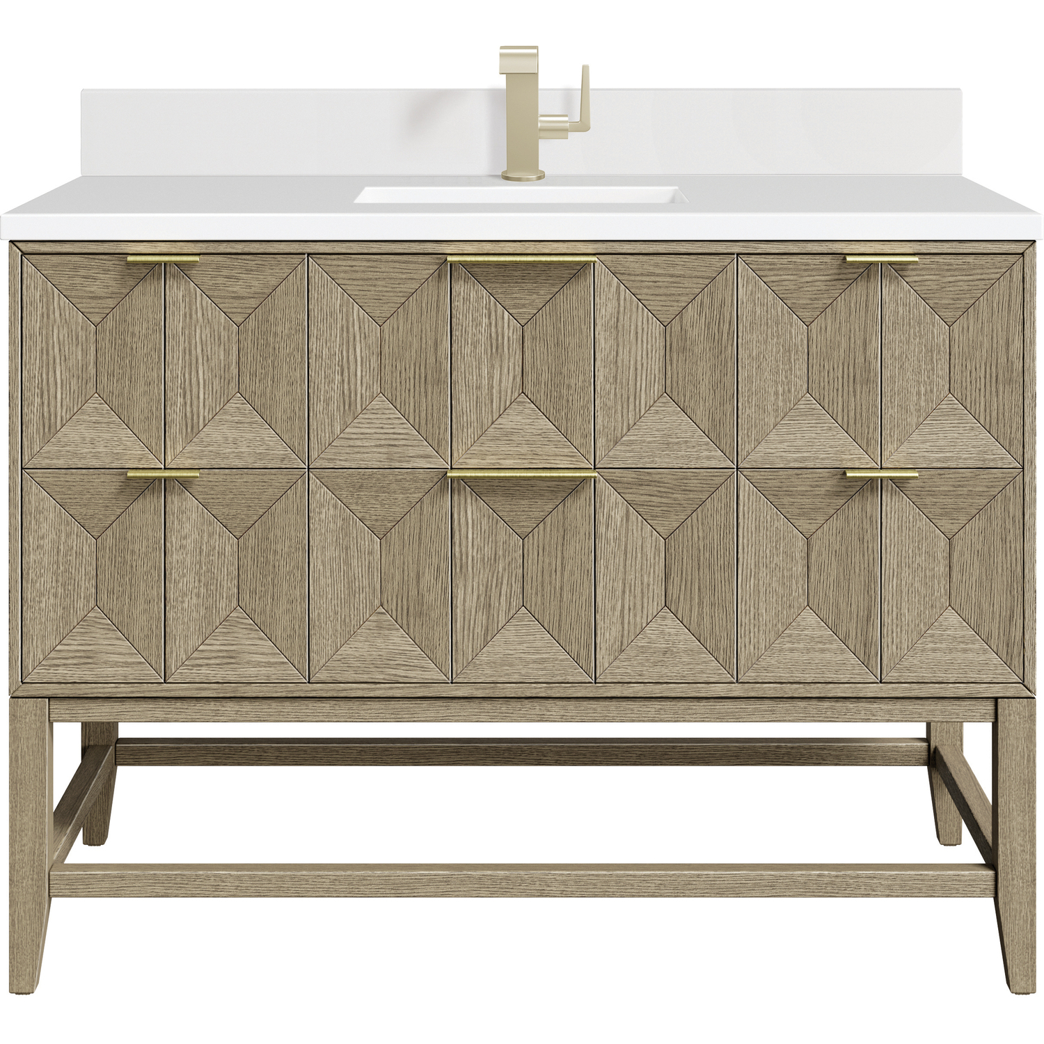 James Martin Emmeline 48 inch Single Vanity, Pebble Oak w/ Single Hole 3 CM White Zeus Quartz Top & Backsplash, 840108974793, D100-V48-PBO-1WZ