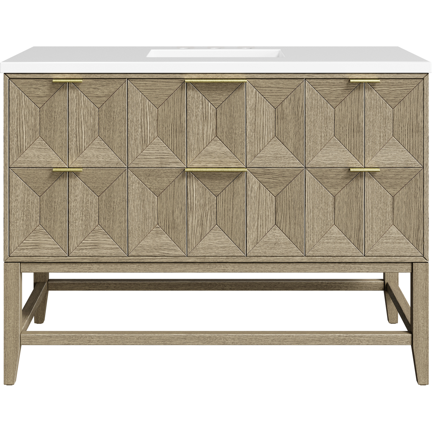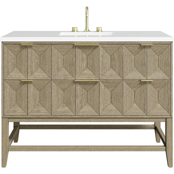 Inspired by today's modern furnishings, characterized by clean lines juxtaposed with unexpected artisan details, the 48" Emmeline creates a bold statement. A solid Ash wood base frame supports a faceted front vanity cabinet featuring five spacious drawers lined with a brushed aluminum laminate. The lightly wire-brushed Ash veneer in a Pebble Oak finish adds authentic drama, allowing this vanity to work into any bath space. The Champagne Brass tab-style hardware adds a layer of sophistication. The White Zeus Silestone top by Cosentino is perfect for those who love to innovate without giving up the traditional look and style.Vanity set includes a 3cm eased edge White Zeus Silestone top, a white porcelain rectangular sink and mounting brackets for easy installation. Top is pre-drilled for an 8" widespread faucet. Faucet not included.Drawer boxes feature English dovetail joinery and a brushed aluminum laminate bottom.Includes one finish-match solid Ash wood removable drawer organizer lined with our signature aluminum laminate.Tab-style pulls in Champagne Brass finishDrawers have soft-close, full extension, undermount drawer glides. The top tip-out drawer features soft-closing hinges.The sculptural Emmeline Collection is an marriage of form and function. Available in three sizes, this collection features dramatic, faceted panel drawers, which house ample storage with an removable drawer organizer. The Pebble Oak finish highlights the geometric pattern of the wire-brushed grain, while the complex shapes add both visual and tactile depth, making Emmeline an functional work of art.1 year warranty against manufacturer's defects. We will repair or replace any defective product, if the product is defective in material or workmanship at our discretion. No warranty is expressed or implied regarding damages resulting from consumer misuse.