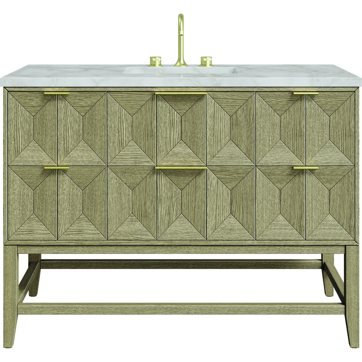 Inspired by today's modern furnishings, and characterized by clean lines juxtaposed with unexpected artisan details, the 48" Emmeline Single Vanity by James Martin Vanities creates a bold statement. A solid Ash wood base frame supports a faceted front vanity cabinet featuring five spacious drawers lined with our signature brushed aluminum laminate lining, and one top-row tip-out drawer. The lightly wire-brushed Ash veneer in a Pebble Oak finish adds drama and intrigue, allowing this vanity to shine in any space. The Champagne Brass tab-style hardware adds a layer of sophistication. The neutral background of the Victorian Silver Silestone® top showcases champagne metallic accents which beautifully accent the hardware and complete the look. This unit is enabled with FreePower wireless charging; featuring a single-device charger seamlessly embedded into the countertop, indicated by a light-up halo to the left of the sink. Designed for modern living, FreePower offers convenient, integrated, wireless charging when and where you need it.Five standard drawers and one top-row tip-out drawerDrawer boxes feature English Dovetail joinery with premium, soft-close undermount drawer slidesCabinet features a multi-stage premium finish coat to offer UV and moisture resistanceWire-brushed Pebble Oak finish with Champagne Brass tab-style hardwareCountertop is pre-drilled for an 8" widespread faucet; our 3cm eased edge countertops come with white porcelain rectangular sink(s) that ship separately and include mounting brackets for easy installationDrawers lined with our signature brushed aluminum laminate for easy cleaningRemovable drawer organizer in Ash wood includedFreestanding vanityFaucet sold separatelyMatching stone backsplash available as add-on purchaseFreePower Wireless Charging; single-device unit left of sinkCrafted with meticulous attention to detail, the sculptural Emmeline Collection seamlessly blends artistry with functionality. Available in three sizes, this collection features dramatic, faceted panel drawers which offer ample storage as well as a removable drawer organizer for added convenience. The sophisticated Pebble Oak finish accentuates the geometric pattern of the wire-brushed wood grain, while the intricate shapes provide both visual intrigue and tactile delight, making Emmeline a functional work of art and the perfect statement piece for any luxurious bathroom.1 year warranty against manufacturer's defects. We will repair or replace any defective product, if the product is defective in material or workmanship at our discretion. No warranty is expressed or implied regarding damages resulting from consumer misuse.