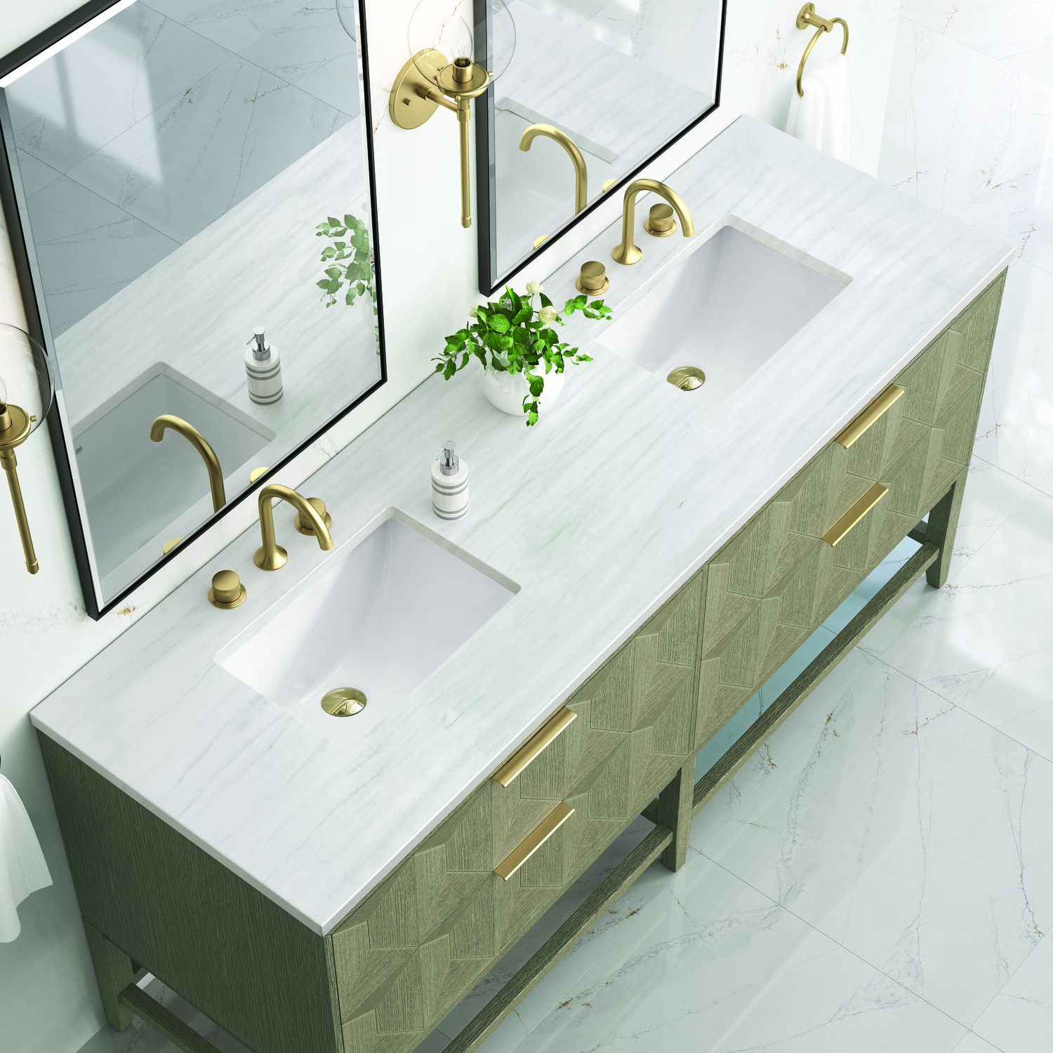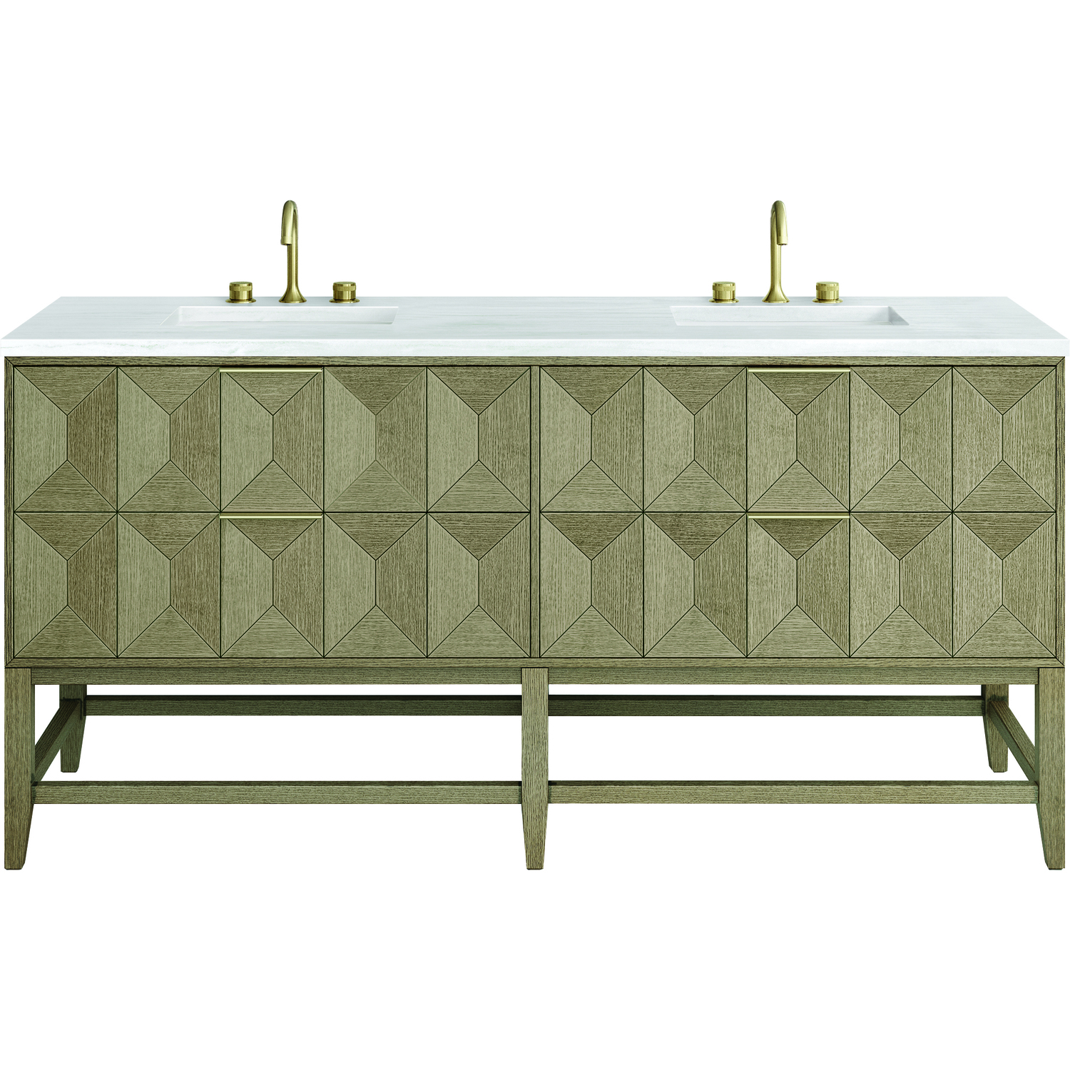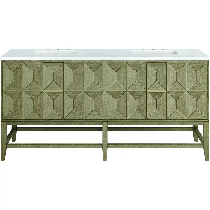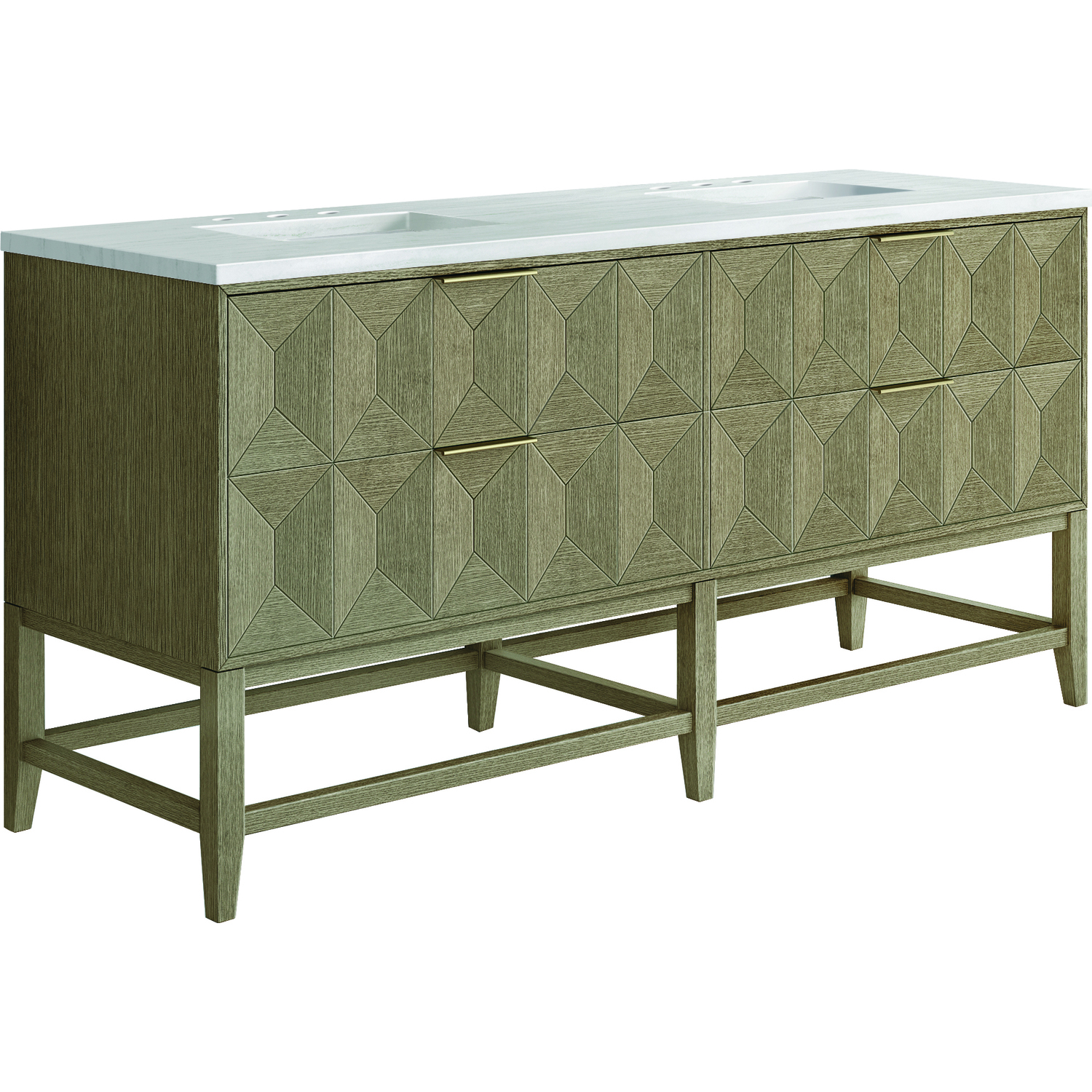 Inspired by today's modern furnishings, characterized by clean lines juxtaposed with unexpected artisan details, the 72" Emmeline creates a bold statement. A solid Ash wood base frame supports a faceted front Vanity Cabinet featuring four spacious drawers lined with an aluminum laminate surface. The lightly wire-brushed Ash veneer in a Pebble Oak finish adds authentic drama, allowing this vanity to work into any bath space. Adding an elegant contrast to the rich wood and Champagne Brass hardware, the 3 cm solid surface Arctic Fall vanity top displays horizontal grey veining giving you the look of expensive marble without the cost.3 CM eased edge Arctic Fall, solid surface top includes a white porcelain rectangular sink that ships separately and includes mounting brackets for easy installation. Faucet not included.The drawer boxes feature English Dovetail joinery, and our signature brushed aluminum laminate drawer liners for easy cleaningThe drawer boxes feature English Dovetail joinery, and our signature brushed aluminum laminate drawer liners for easy cleaningTwo drawer cabinetIncludes one removable drawer organizer lined with our signature aluminum laminate, located on the right side of the right,lower drawerTab style door pulls in Champagne Brass finishSoft-close, full extension, undermount drawer glidesThe sculptural Emmeline Collection is a marriage of form and function. Available in three sizes, this collection features dramatic, faceted panel drawers which offer ample storage as well as a removable drawer organizer for added convenience. The Pebble Oak finish highlights the geometric pattern of the wire-brushed grain, while the complex shapes add visual and tactile depth, making Emmeline a functional work of art.1 year warranty against manufacturer's defects. We will repair or replace any defective product, if the product is defective in material or workmanship at our discretion. No warranty is expressed or implied regarding damages resulting from consumer misuse.