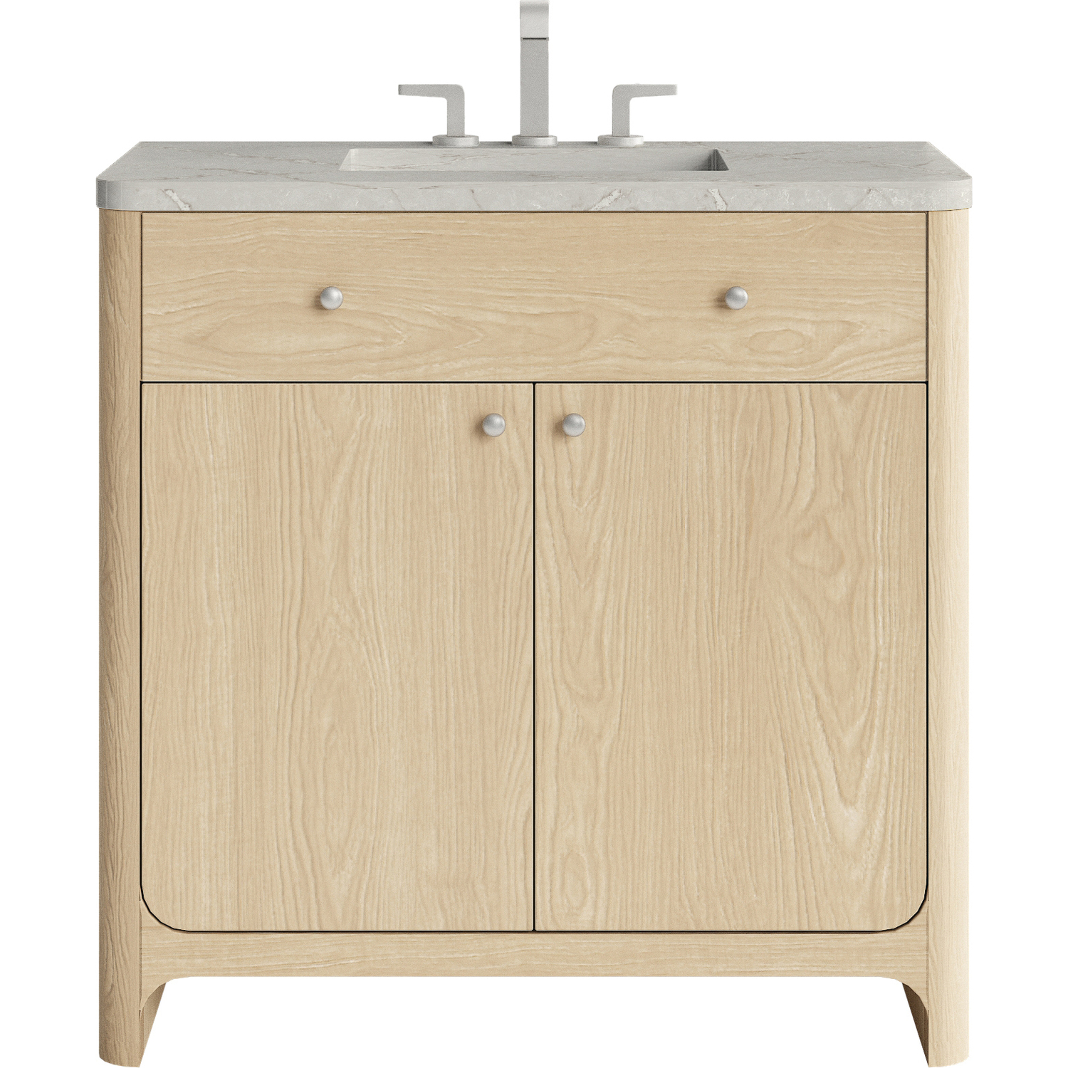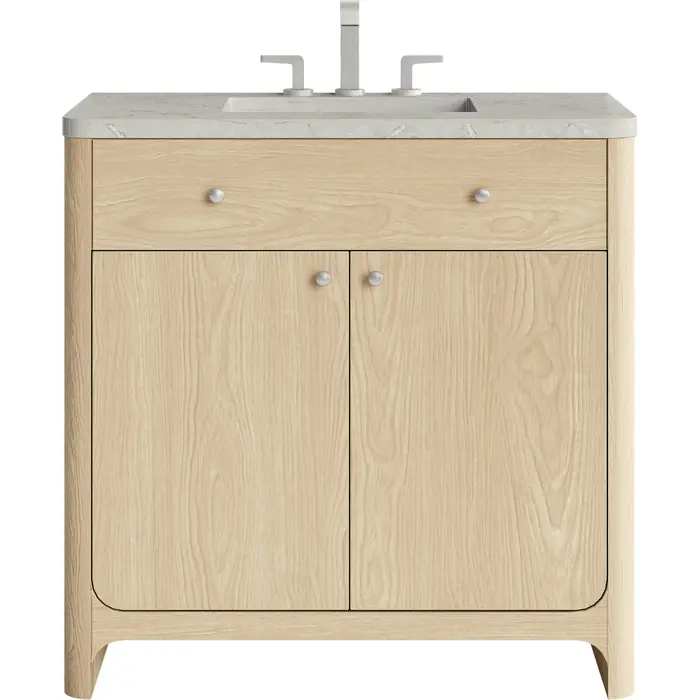 The Gracyn 36" Single Vanity by James Martin Vanities is a tactile and visual delight, boasting soft curves and a fresh Coastal Driftwood finish that brings character to your space. The sand-blasted finish on natural Ash gives textural and visual definition to the wood grain, truly bringing this piece to life. Featuring an integrated USB/120V power unit and smooth radius edges, the Gracyn is complemented by elegant Satin Nickel hardware. The two-door cabinet features ample storage with one exterior drawer, interior shelving, and one internal drawer. With the addition of a gorgeous Victorian Silver Silestone® top and undermount sink, this vanity is a seamless integration of modern design and functionality.Two-door cabinet with one external drawer, one interior shelf, and one internal drawerDrawer boxes feature English Dovetail joinery with premium, soft-close undermount drawer slides; doors feature soft-close, adjustable door hingesCabinet features a multi-stage premium finish coat to offer UV and moisture resistanceSand-blasted Ash wood in Coastal Driftwood finish with Satin Nickel hardwareCountertop is pre-drilled for an 8" widespread faucet; our 3cm eased edge countertops come with white porcelain rectangular sink(s) that ship separately and include mounting brackets for easy installationIntegrated 120V outlet with USB portsDrawers lined with our signature brushed aluminum laminate for easy cleaningRemovable drawer organizer in Ash wood includedFreestanding vanityMatching stone backsplash available as add-on purchaseFaucet sold separatelyFeaturing a modern silhouette and beaming with texture, the Gracyn Collection by James Martin Vanities brings a natural elegance to any space. The Gracyn features soft curves and a sand-blasted finish on natural Ash, which gives textural and visual definition to the grain, truly bringing this piece to life. Offered in three sizes and two beautiful finishes - each paired with complimentary hardware - this vanity offers generous storage with its internal and external drawers and removable drawer organizer. Let Gracyn transform your bathroom into an elegant and serene retreat.1 year warranty against manufacturer's defects. We will repair or replace any defective product, if the product is defective in material or workmanship at our discretion. No warranty is expressed or implied regarding damages resulting from consumer misuse.