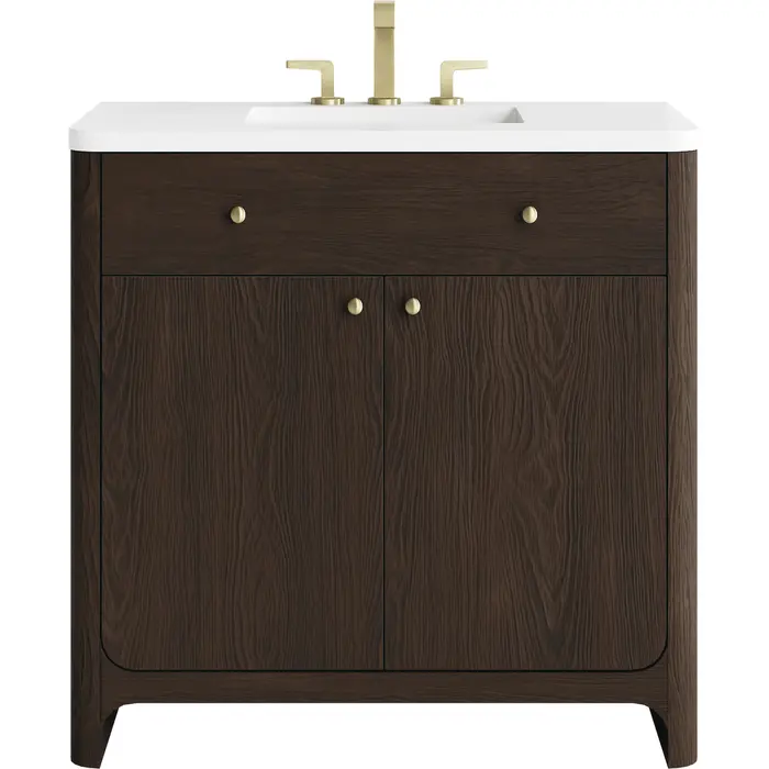 The Gracyn 36" Single Vanity by James Martin Vanities is a tactile and visual delight, boasting soft curves and a rich Sable finish that brings character to your space. The sand-blasted finish on natural Ash gives textural and visual definition to the wood grain, truly bringing this piece to life. Featuring an integrated USB/120V power unit and smooth radius edges, the Gracyn is complemented by elegant Champagne Brass hardware. The two-door cabinet features ample storage with one exterior drawer, interior shelving, and one internal drawer. With the addition of a classic White Zeus Silestone® top and undermount sink, this vanity is a seamless integration of modern design and functionality.Two-door cabinet with one external drawer, one interior shelf, and one internal drawerDrawer boxes feature English Dovetail joinery with premium, soft-close undermount drawer slides; doors feature soft-close, adjustable door hingesCabinet features a multi-stage premium finish coat to offer UV and moisture resistanceSand-blasted Ash wood in Sable finish with Champagne Brass hardwareCountertop is pre-drilled for an 8" widespread faucet; our 3cm eased edge countertops come with white porcelain rectangular sink(s) that ship separately and include mounting brackets for easy installationIntegrated 120V outlet with USB portsDrawers lined with our signature brushed aluminum laminate for easy cleaningRemovable drawer organizer in Ash wood includedFreestanding vanityMatching stone backsplash available as add-on purchaseFaucet sold separatelyFeaturing a modern silhouette and beaming with texture, the Gracyn Collection by James Martin Vanities brings a natural elegance to any space. The Gracyn features soft curves and a sand-blasted finish on natural Ash, which gives textural and visual definition to the grain, truly bringing this piece to life. Offered in three sizes and two beautiful finishes - each paired with complimentary hardware - this vanity offers generous storage with its internal and external drawers and removable drawer organizer. Let Gracyn transform your bathroom into an elegant and serene retreat.1 year warranty against manufacturer's defects. We will repair or replace any defective product, if the product is defective in material or workmanship at our discretion. No warranty is expressed or implied regarding damages resulting from consumer misuse.