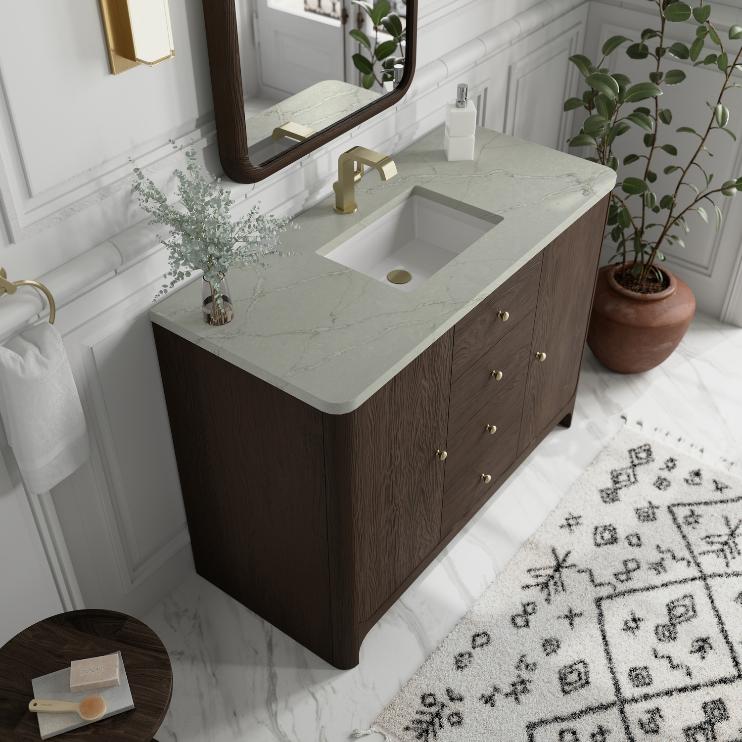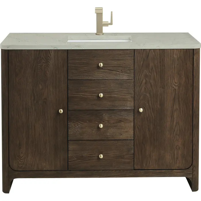 The Gracyn 48" Single Vanity is a tactile and visual delight, boasting soft curves and a rich Sable finish that brings character to your space. The sand-blasted finish on natural Ash gives textural and visual definition to the wood grain, truly bringing this piece to life. Featuring an integrated USB/120V power unit and smooth radius edges, the Gracyn is complemented by elegant Champagne Brass hardware. The two single-door cabinet features ample storage with three full-extension exterior drawers and one top-row tip-out drawer, interior shelving, and two internal drawers. With the addition of a gorgeous Victorian Silver Silestone top and undermount sink, this vanity is a seamless integration of modern design and functionality.Three full-extension exterior drawers with one top-row tip-out drawer; two single cabinet doors with interior shelving and two internal drawersDrawer boxes feature English Dovetail joinery with premium, soft-close undermount drawer slides; doors feature soft-close, adjustable door hingesCabinet features a multi-stage premium finish coat to offer UV and moisture resistanceSand-blasted Ash wood in Sable finish with Champagne Brass hardwareCountertop is pre-drilled for a single hole faucet; our 3cm eased edge countertops come with white porcelain rectangular sink(s) that ship separately and include mounting brackets for easy installationIntegrated 120V Outlet with USB PortsDrawers lined with our signature brushed aluminum laminate for easy cleaningRemovable drawer organizer in Ash wood includedFreestanding vanityMatching stone backsplash available as add-on purchaseFaucet sold separatelyFeaturing a modern silhouette and beaming with texture, the Gracyn Collection by James Martin Vanities brings a natural elegance to any space. The Gracyn features soft curves and a sand-blasted finish on natural Ash, which gives textural and visual definition to the grain, truly bringing this piece to life. Offered in three sizes and two beautiful finishes - each paired with complimentary hardware - this vanity offers generous storage with its internal and external drawers and removable drawer organizer. Let Gracyn transform your bathroom into an elegant and serene retreat.1 year warranty against manufacturer's defects. We will repair or replace any defective product, if the product is defective in material or workmanship at our discretion. No warranty is expressed or implied regarding damages resulting from consumer misuse.