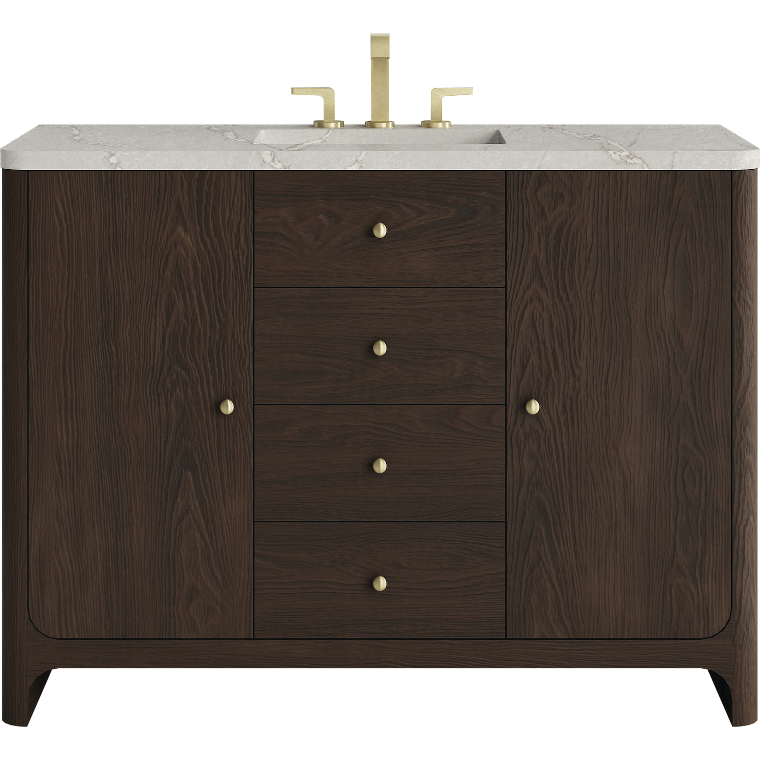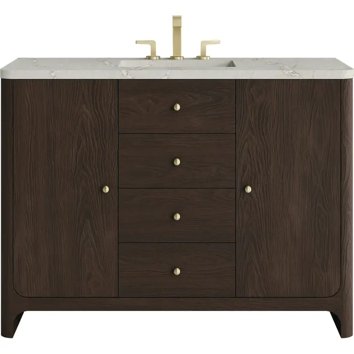The Gracyn 48" Single Vanity by James Martin Vanities is a tactile and visual delight, boasting soft curves and a rich Sable finish that brings character to your space. The sand-blasted finish on natural Ash gives textural and visual definition to the wood grain, truly bringing this piece to life. Featuring an integrated USB/120V power unit and smooth radius edges, the Gracyn is complemented by elegant Champagne Brass hardware. The two single-door cabinet features ample storage with three full-extension exterior drawers and one top-row tip-out drawer, interior shelving, and two internal drawers. With the addition of a gorgeous Victorian Silver Silestone® top and undermount sink, this vanity is a seamless integration of modern design and functionality.Three full-extension exterior drawers with one top-row tip-out drawer; two single cabinet doors with interior shelving and two internal drawersDrawer boxes feature English Dovetail joinery with premium, soft-close undermount drawer slides; doors feature soft-close, adjustable door hingesCabinet features a multi-stage premium finish coat to offer UV and moisture resistanceSand-blasted Ash wood in Sable finish with Champagne Brass hardwareCountertop is pre-drilled for an 8" widespread faucet; our 3cm eased edge countertops come with white porcelain rectangular sink(s) that ship separately and include mounting brackets for easy installationIntegrated 120V outlet with USB portsDrawers lined with our signature brushed aluminum laminate for easy cleaningRemovable drawer organizer in Ash wood includedFreestanding vanityMatching stone backsplash available as add-on purchaseFaucet sold separatelyFeaturing a modern silhouette and beaming with texture, the Gracyn Collection by James Martin Vanities brings a natural elegance to any space. The Gracyn features soft curves and a sand-blasted finish on natural Ash, which gives textural and visual definition to the grain, truly bringing this piece to life. Offered in three sizes and two beautiful finishes - each paired with complimentary hardware - this vanity offers generous storage with its internal and external drawers and removable drawer organizer. Let Gracyn transform your bathroom into an elegant and serene retreat.1 year warranty against manufacturer's defects. We will repair or replace any defective product, if the product is defective in material or workmanship at our discretion. No warranty is expressed or implied regarding damages resulting from consumer misuse.