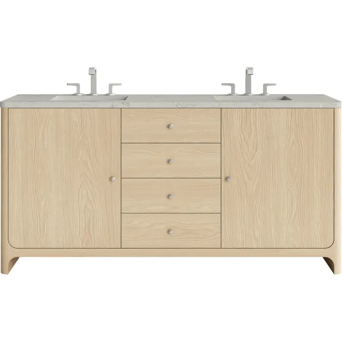 The Gracyn 72" Double Vanity by James Martin Vanities is a tactile and visual delight, boasting soft curves and a fresh Coastal Driftwood finish that brings character to your space. The sand-blasted finish on natural Ash gives textural and visual definition to the wood grain, truly bringing this piece to life. Featuring two integrated USB/120V power units and smooth radius edges, the Gracyn is complemented by elegant Satin Nickel hardware. The two single-door cabinet features ample storage with four full-extension drawers, interior shelving, and two internal drawers. With the addition of a gorgeous Victorian Silver Silestone® top and undermount sinks, this vanity is a seamless integration of modern design and functionality.Four full-extension drawers and two cabinet doors with interior shelving and two internal drawersDrawer boxes feature English Dovetail joinery with premium, soft-close undermount drawer slides; doors feature soft-close, adjustable door hingesCabinet features a multi-stage premium finish coat to offer UV and moisture resistanceSand-blasted Ash wood in Coastal Driftwood finish with Satin Nickel hardwareCountertop is pre-drilled for 8" widespread faucets; our 3cm eased edge countertops come with white porcelain rectangular sinks that ship separately and include mounting brackets for easy installationTwo integrated 120V outlets with USB portsDrawers lined with our signature brushed aluminum laminate for easy cleaningRemovable drawer organizer in Ash wood includedFreestanding vanityMatching stone backsplash available as add-on purchaseFaucets sold separatelyFeaturing a modern silhouette and beaming with texture, the Gracyn Collection by James Martin Vanities brings a natural elegance to any space. The Gracyn features soft curves and a sand-blasted finish on natural Ash, which gives textural and visual definition to the grain, truly bringing this piece to life. Offered in three sizes and two beautiful finishes - each paired with complimentary hardware - this vanity offers generous storage with its internal and external drawers and removable drawer organizer. Let Gracyn transform your bathroom into an elegant and serene retreat.1 year warranty against manufacturer's defects. We will repair or replace any defective product, if the product is defective in material or workmanship at our discretion. No warranty is expressed or implied regarding damages resulting from consumer misuse.