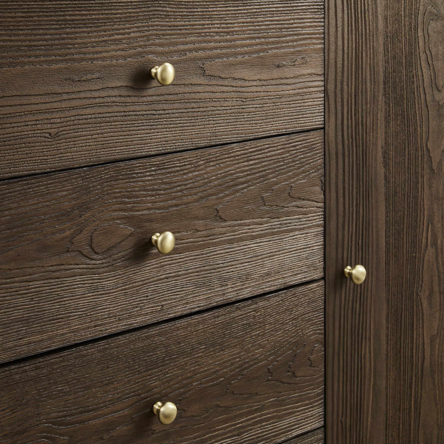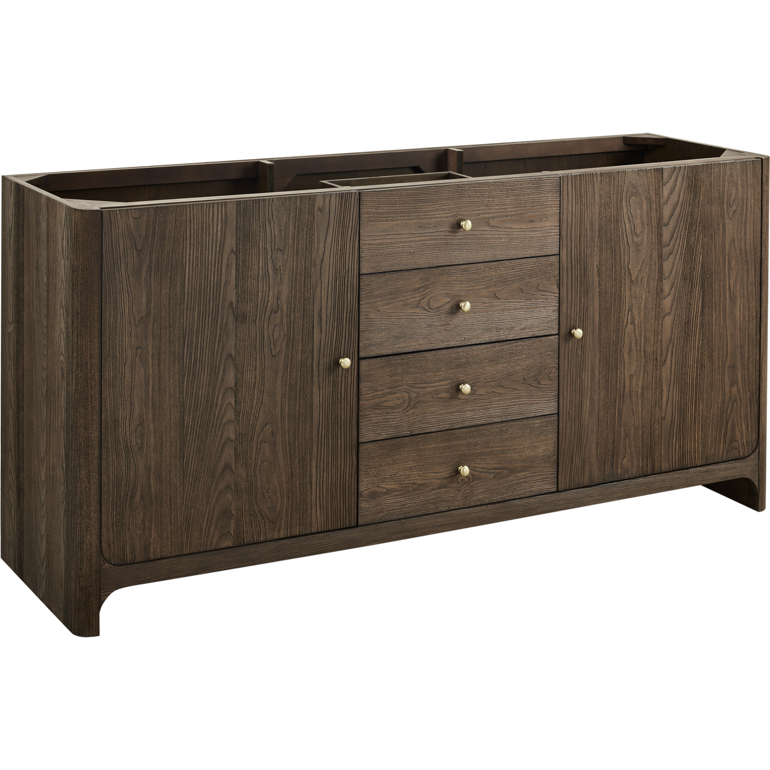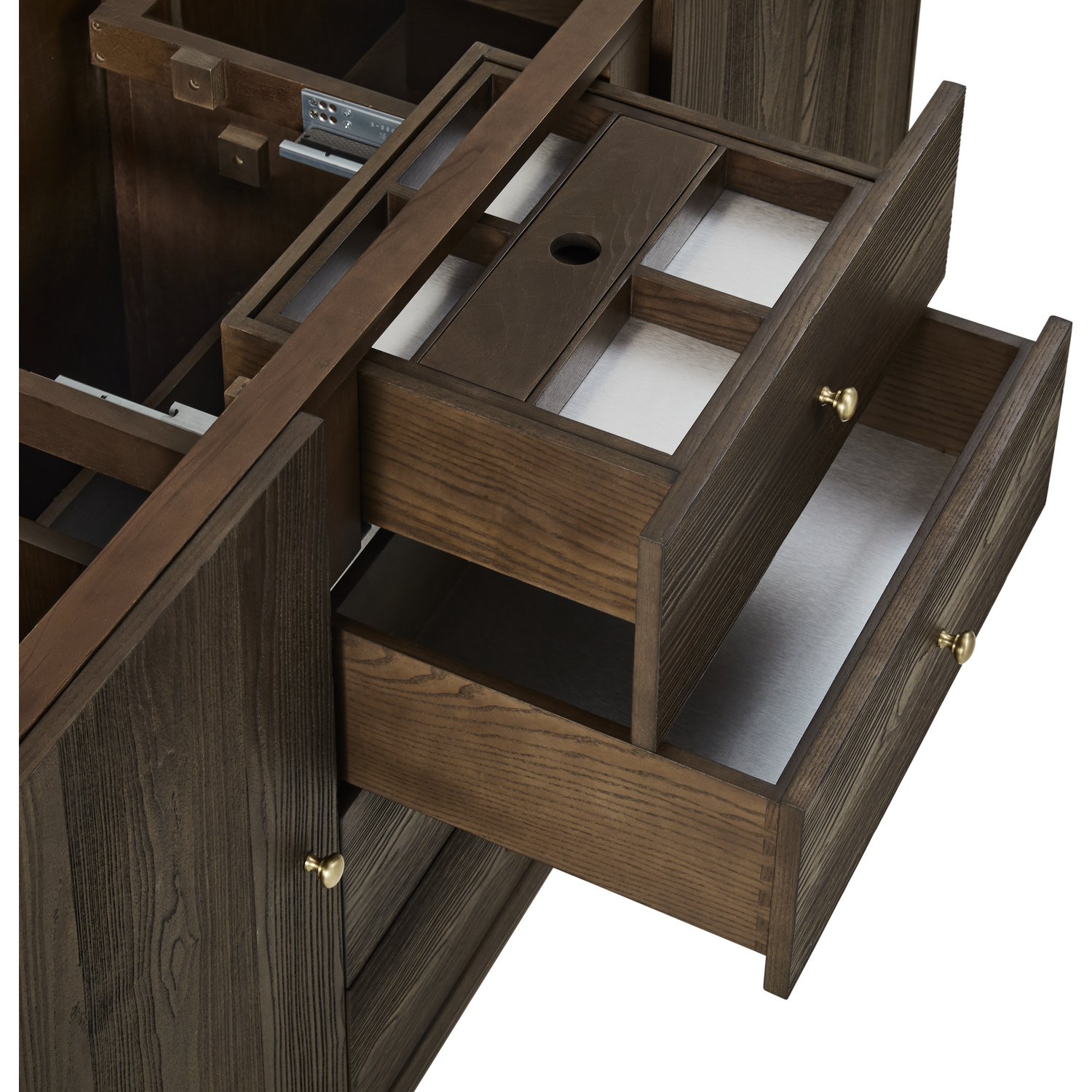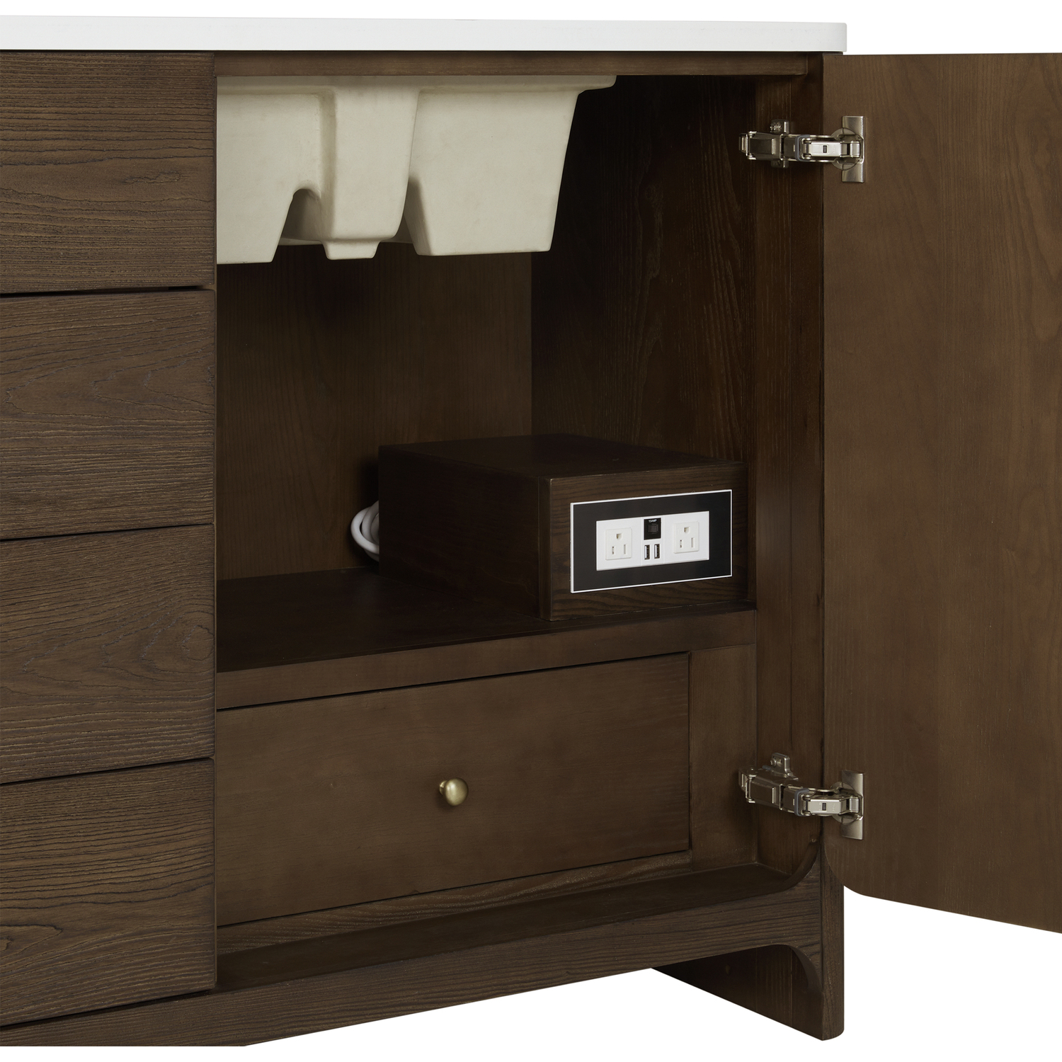 The Gracyn 72" Double Vanity is a tactile and visual delight, boasting soft curves and a rich Sable finish that brings character to your space. The sand-blasted finish on natural Ash gives textural and visual definition to the wood grain, truly bringing this piece to life. Featuring two integrated USB/120V power units and smooth radius edges, the Gracyn is complemented by elegant Champagne Brass hardware. The two single-door cabinet features ample storage with four full-extension drawers, interior shelving, and two internal drawers. Complete the look with one of our 3 cm tops.Four full-extension drawers and two cabinet doors with interior shelving and two internal drawersDrawer boxes feature English Dovetail joinery with premium, soft-close undermount drawer slides; doors feature soft-close, adjustable door hingesCabinet features a multi-stage premium finish coat to offer UV and moisture resistanceSand-blasted Ash wood in Sable finish with Champagne Brass hardwareCabinet only; select one of our countertops to complete the vanityTwo integrated 120V Outlets with USB PortsDrawers lined with our signature brushed aluminum laminate for easy cleaningRemovable drawer organizer in Ash wood includedFreestanding vanityFaucets sold separatelyFeaturing a modern silhouette and beaming with texture, the Gracyn Collection by James Martin Vanities brings a natural elegance to any space. The Gracyn features soft curves and a sand-blasted finish on natural Ash, which gives textural and visual definition to the grain, truly bringing this piece to life. Offered in three sizes and two beautiful finishes - each paired with complimentary hardware - this vanity offers generous storage with its internal and external drawers and removable drawer organizer. Let Gracyn transform your bathroom into an elegant and serene retreat.1 year warranty against manufacturer's defects. We will repair or replace any defective product, if the product is defective in material or workmanship at our discretion. No warranty is expressed or implied regarding damages resulting from consumer misuse.