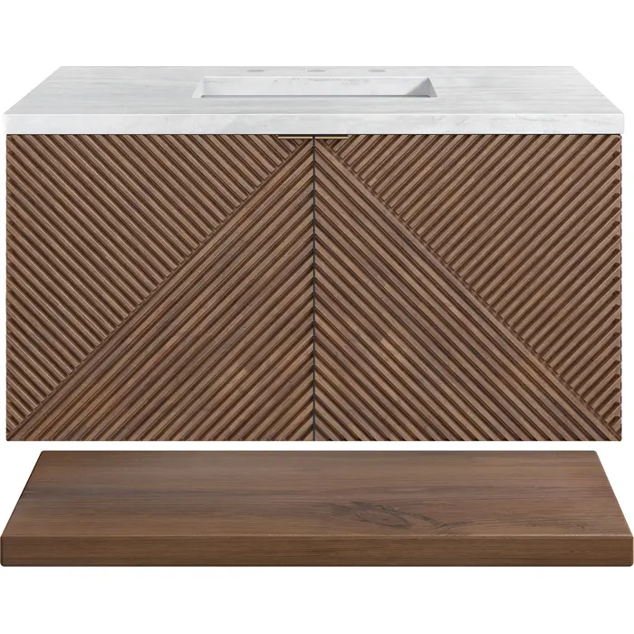 The 36" Marcello wall-mounted vanity adds a touch of mid-century modern charm to your bathroom, while the warm Chestnut finish provides timeless elegance. The reeded, patterned detail on the door fronts continues around the sides in geometric perfection. Crafted from solid Acacia, with rich, resawn Acacia veneer over Marine MDF, accented by sleek, tab-style door pulls in Champagne Brass. The wide, spacious interior drawer is framed on the top by a generous shelf and features our signature aluminum laminate liners and full extension, soft-close undermount glides. A floating shelf, mounted separately, adds a modern and visually balanced storage solution. The wall-hanging feature contemporizes the look with an easy-to"stall bracket system included. The 3 CM countertop, pre-drilled for an 8" widespread faucet, includes mounting hardware for the porcelain undermount sink. Adding an elegant contrast to the rich wood with Champagne Brass hardware, the 3 cm solid surface Arctic Fall vanity top displays horizontal grey veining giving you the look of expensive marble without the cost.3 CM eased edge Arctic Fall, solid surface top includes a white porcelain rectangular sink that ships separately and includes mounting brackets for easy installation. Faucet not included.Crafted from solid Acacia, with rich, resawn Acacia veneer over Marine MDFThe drawer box features English Dovetail joinery, and our signature brushed aluminum laminate drawer liners for easy cleaningTwo Door cabinet with interior drawerOne floating shelf, includedFloating vanity with mounting hardware. Designed to be 36" height including optional 3 cm top.Tab style door pulls in Champagne Brass finishSoft-close, full extension undermount drawer glides and soft-close door hingesOur Marcello wall-mounted vanity collection's clean lines and geometric design will add a touch of mid-century modern charm to your bathroom. The warm Chestnut finish adds timeless elegance, while the pattern play detail of the reeded front adds visual interest to this masterpiece. The wall-hanging feature contemporizes the look with an easy-to-install bracket system included. Available in 36" and 72", the Marcello collection features pairs of doors accented in Champagne Brass finish tab-style door pulls that reveal internal drawer storage and a generous internal shelf. A floating shelf, perfect for folded towels, adds a spa feel.1 year warranty against manufacturer's defects. We will repair or replace any defective product, if the product is defective in material or workmanship at our discretion. No warranty is expressed or implied regarding damages resulting from consumer misuse.