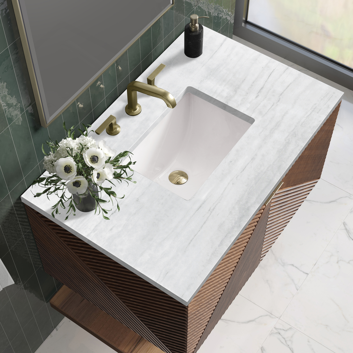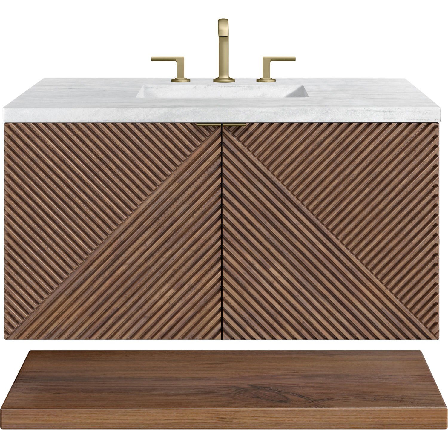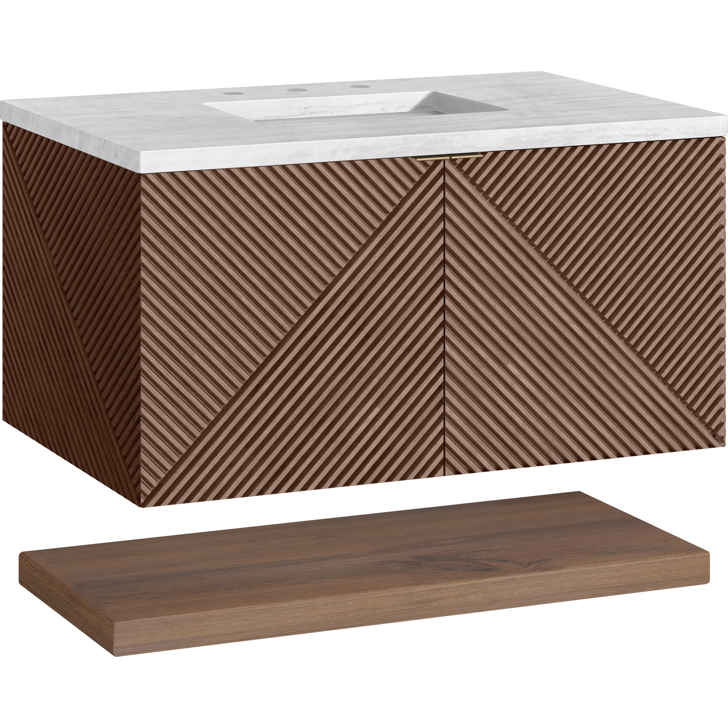 - Our Marcello wall-mounted vanity collection's clean lines and geometric design will add a touch of mid-century modern charm to your bathroom. The warm Chestnut finish adds timeless elegance, while the pattern play detail of the reeded front adds visual interest to this masterpiece. The wall-hanging feature contemporizes the look with an easy-to-install bracket system included. Available in 36" and 72", the Marcello collection features pairs of doors accented in Champagne Brass finish tab-style door pulls that reveal internal drawer storage and a generous internal shelf. A floating shelf, perfect for folded towels, adds a spa feel.
