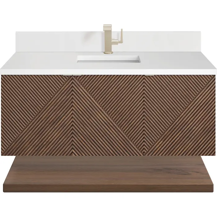 The 48" Marcello wall-mounted vanity adds a touch of mid-century modern charm to your bathroom, while the warm Chestnut finish provides timeless elegance. The reeded, patterned detail on the door fronts continues around the sides in geometric perfection. Crafted from solid Acacia, with rich, resawn Acacia veneer over Marine MDF, accented by sleek, tab-style door pulls in Champagne Brass. The wide, spacious interior drawers are framed on the top by a generous shelf and features our signature aluminum laminate liners and full extension, soft-close undermount glides. Adding an elegant contrast to the rich wood and Champagne Brass hardware, the 3 cm White Zeus Silestone top and backsplash by Cosentino is perfect for those who love to innovate without giving up the traditional look and style. The wall-hanging feature contemporizes the look with an easy-to install bracket system included.Vanity set includes a 3cm eased edge White Zeus Silestone top with matching backsplash, a white porcelain rectangular sink and mounting brackets for easy installation. Top is pre-drilled for single hole faucet. Faucet not included.48” W x 23-1/2” D x 19” HLower shelf and mounting hardware includedThree doors open to internal shelfChampagne Brass tab-style pullsDrawer boxes feature English Dovetail joinery, premium undermount glides, and brushed aluminum laminate drawer liners for easy cleaning.Crafted from solid Acacia, with rich, resawn Acacia veneer over Marine MDFSoft-close, full extension undermount drawer glides and soft-close door hingesMatching White Zeus 3cm Silestone backsplash included.Faucet sold separatelyThe Marcello Collection offers modern visual drama that boasts practical sensibility. The fluted panels, finished in a warm Chestnut stain over re-sawn Acacia veneers, are accentuated by the precisely mirrored geometrical pattern, which meticulously wraps around to the side panels. Discreetly designed doors with tabbed style Champagne Brass pulls open to an internal drawer and shelf. A coordinating, floating shelf adds visual balance while adding extra storage and a spa-like feel.1 year warranty against manufacturer's defects. We will repair or replace any defective product, if the product is defective in material or workmanship at our discretion. No warranty is expressed or implied regarding damages resulting from consumer misuse.