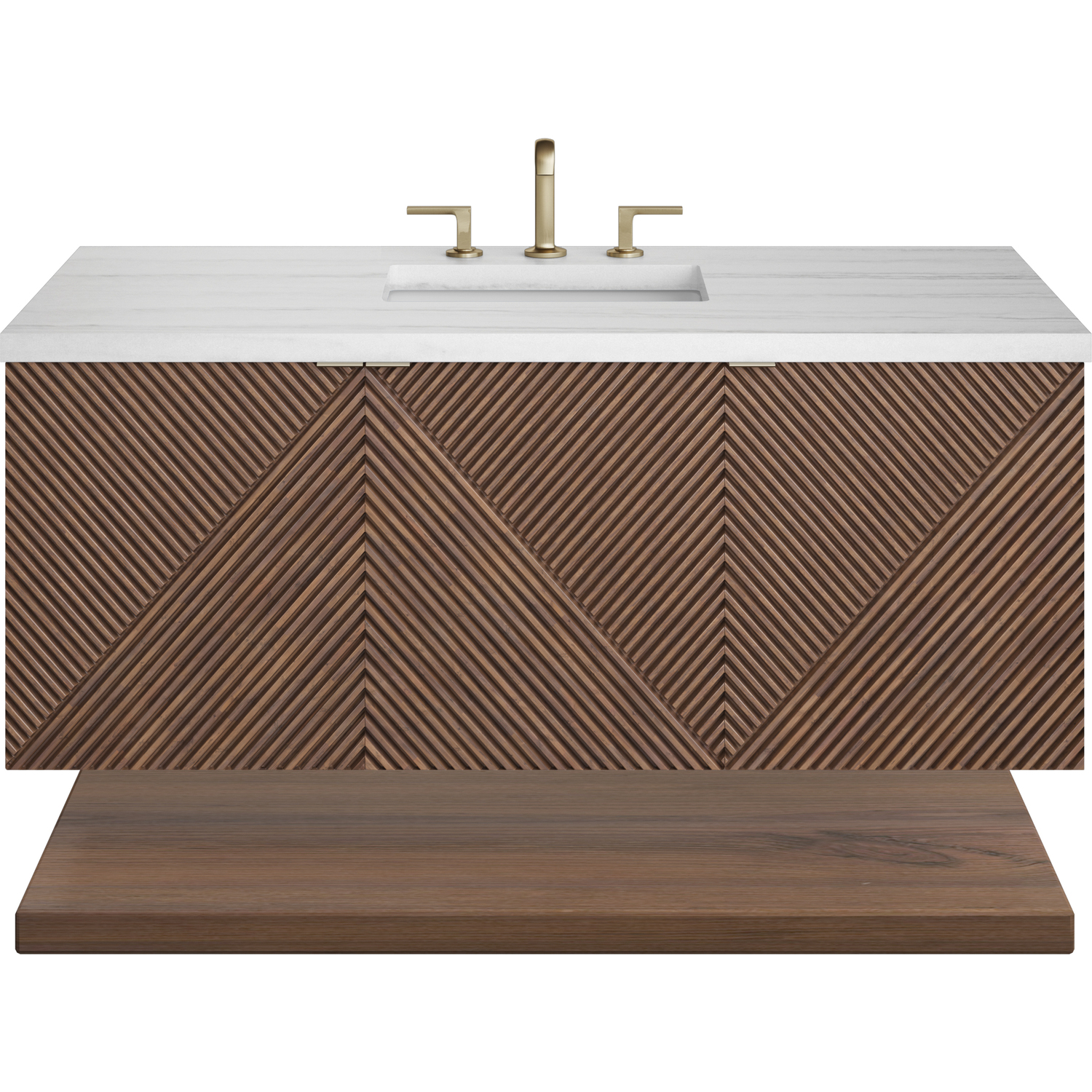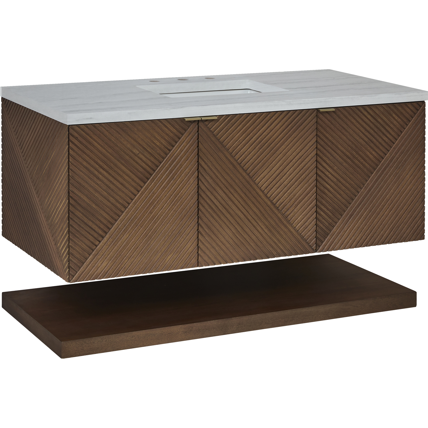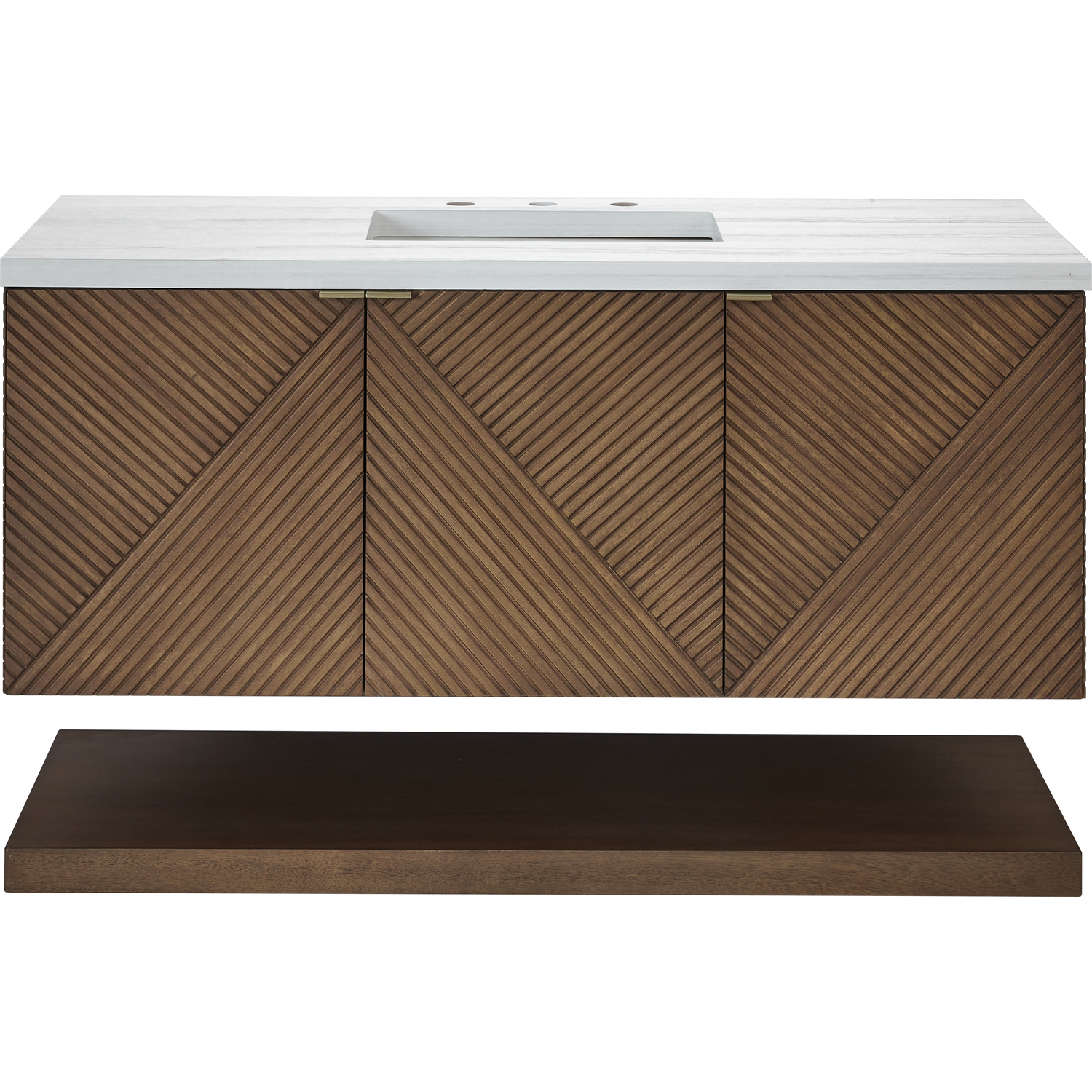 The 48" Marcello wall-mounted vanity adds a touch of mid-century modern charm to your bathroom, while the warm Chestnut finish provides timeless elegance. The reeded, patterned detail on the door fronts continues around the sides in geometric perfection. Crafted from solid Acacia, with rich, resawn Acacia veneer over Marine MDF, accented by sleek, tab-style door pulls in Champagne Brass. The wide, spacious interior drawers are framed on the top by a generous shelf and features our signature aluminum laminate liners and full extension, soft-close undermount glides. Perfectly completing the look is 3 cm solid surface Arctic Fall vanity top, which displays horizontal grey veining, giving you the look of traditional marble - with the benefit of modern technology. The wall-hanging feature contemporizes the look with an easy-to install bracket system included.Vanity set includes a 3cm eased edge Arctic Fall Solid Surface top with an undermount white porcelain rectangular sink uninstalled and includes mounting brackets for easy installation. Solid Surface tops are beautifully consistent and have low porosity th48” W x 23-1/2” D x 19” HLower shelf and mounting hardware includedThree doors open to internal shelfChampagne Brass tab-style pullsDrawer boxes feature English Dovetail joinery, premium undermount glides, and brushed aluminum laminate drawer liners for easy cleaning.Crafted from solid Acacia, with rich, resawn Acacia veneer over Marine MDFSoft-close, full extension undermount drawer glides and soft-close door hingesThe Marcello Collection offers modern visual drama that boasts practical sensibility. The fluted panels, finished in a warm Chestnut stain over re-sawn Acacia veneers, are accentuated by the precisely mirrored geometrical pattern, which meticulously wraps around to the side panels. Discreetly designed doors with tabbed style Champagne Brass pulls open to an internal drawer and shelf. A coordinating, floating shelf adds visual balance while adding extra storage and a spa-like feel.1 year warranty against manufacturer's defects. We will repair or replace any defective product, if the product is defective in material or workmanship at our discretion. No warranty is expressed or implied regarding damages resulting from consumer misuse.