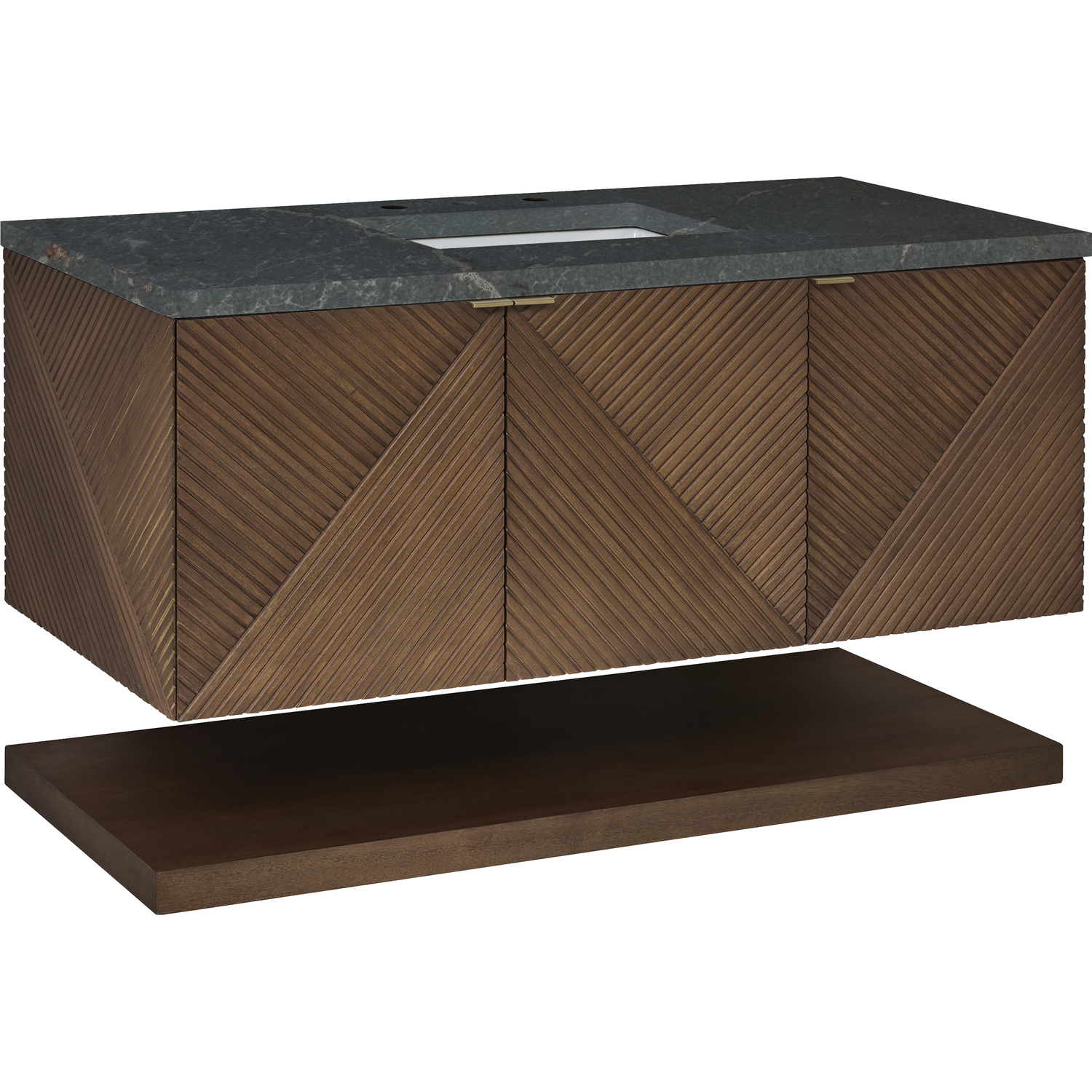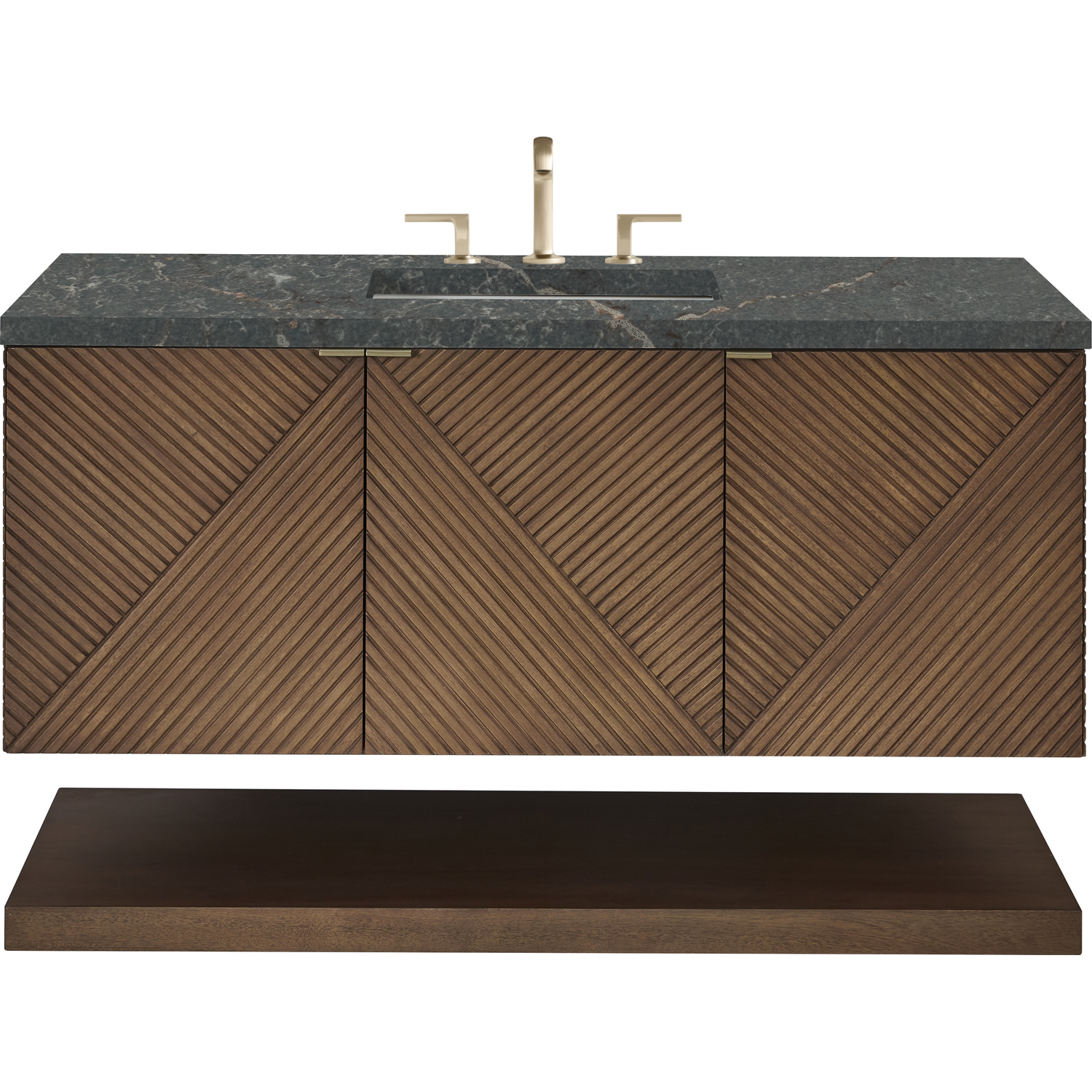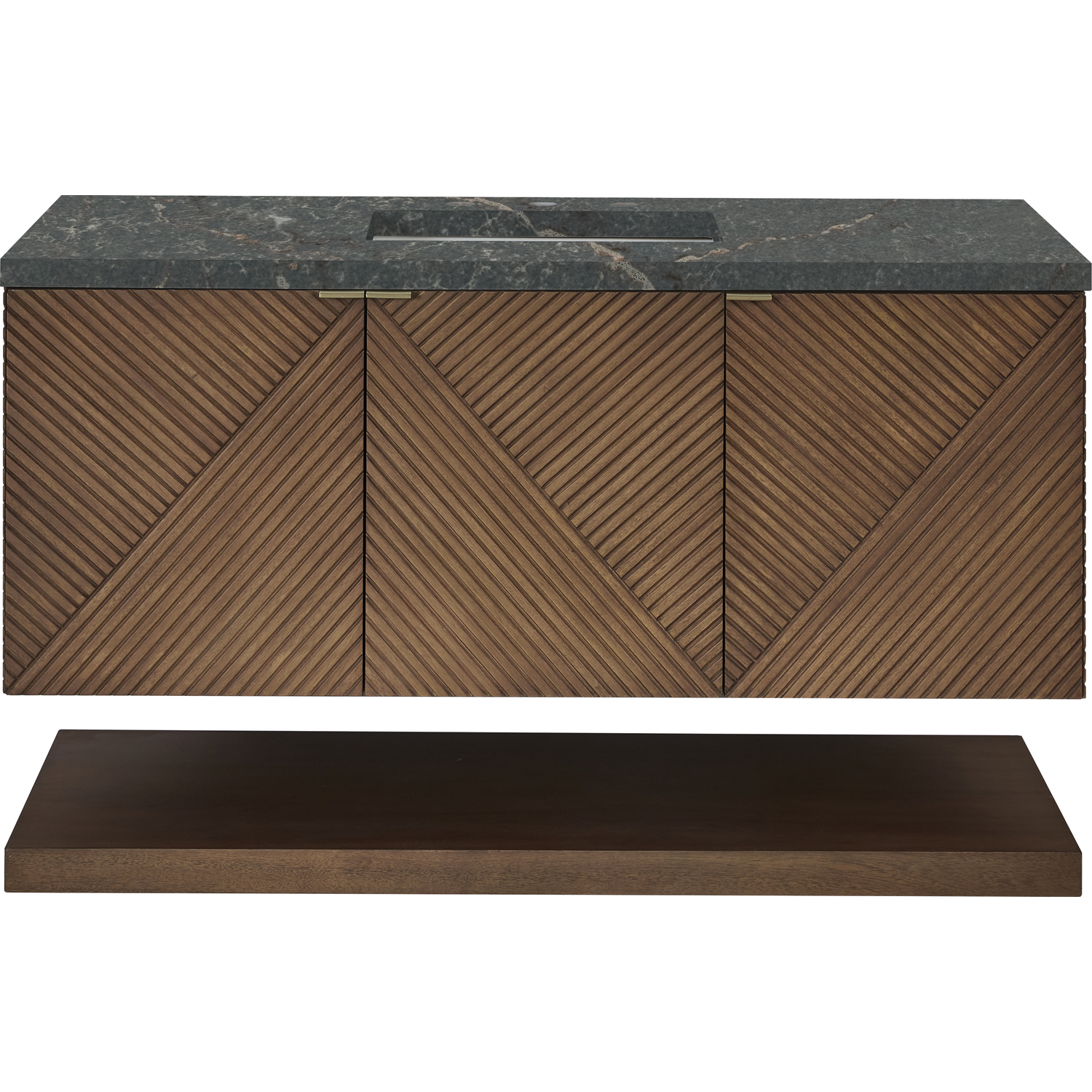 The 48" Marcello wall-mounted vanity adds a touch of mid-century modern charm to your bathroom, while the warm Chestnut finish provides timeless elegance. The reeded, patterned detail on the door fronts continues around the sides in geometric perfection. Crafted from solid Acacia, with rich, resawn Acacia veneer over Marine MDF, accented by sleek, tab-style door pulls in Champagne Brass. The wide, spacious interior drawers are framed on the top by a generous shelf and features our signature aluminum laminate liners and full extension, soft-close undermount glides. The sophisticated Parisien Blue Silestone top features a deep bluish hue with broad and intricate neutral veins highlighted by fine coppery accents, perfectly accenting the rich finish and hardware.Vanity set includes a 3cm eased edge Parisien Blue Silestone top, which includes one white porcelain rectangular undermount sink that ships separately, as well as mounting brackets for easy installation. The top is pre-drilled for an 8" widespread faucet.48” W x 23-1/2” D x 19” HLower shelf and mounting hardware includedThree doors open to internal shelfChampagne Brass tab-style pullsDrawer boxes feature English Dovetail joinery, premium undermount glides, and brushed aluminum laminate drawer liners for easy cleaning.Crafted from solid Acacia, with rich, resawn Acacia veneer over Marine MDFSoft-close, full extension undermount drawer glides and soft-close door hingesThe Marcello Collection offers modern visual drama that boasts practical sensibility. The fluted panels, finished in a warm Chestnut stain over re-sawn Acacia veneers, are accentuated by the precisely mirrored geometrical pattern, which meticulously wraps around to the side panels. Discreetly designed doors with tabbed style Champagne Brass pulls open to an internal drawer and shelf. A coordinating, floating shelf adds visual balance while adding extra storage and a spa-like feel.1 year warranty against manufacturer's defects. We will repair or replace any defective product, if the product is defective in material or workmanship at our discretion. No warranty is expressed or implied regarding damages resulting from consumer misuse.
