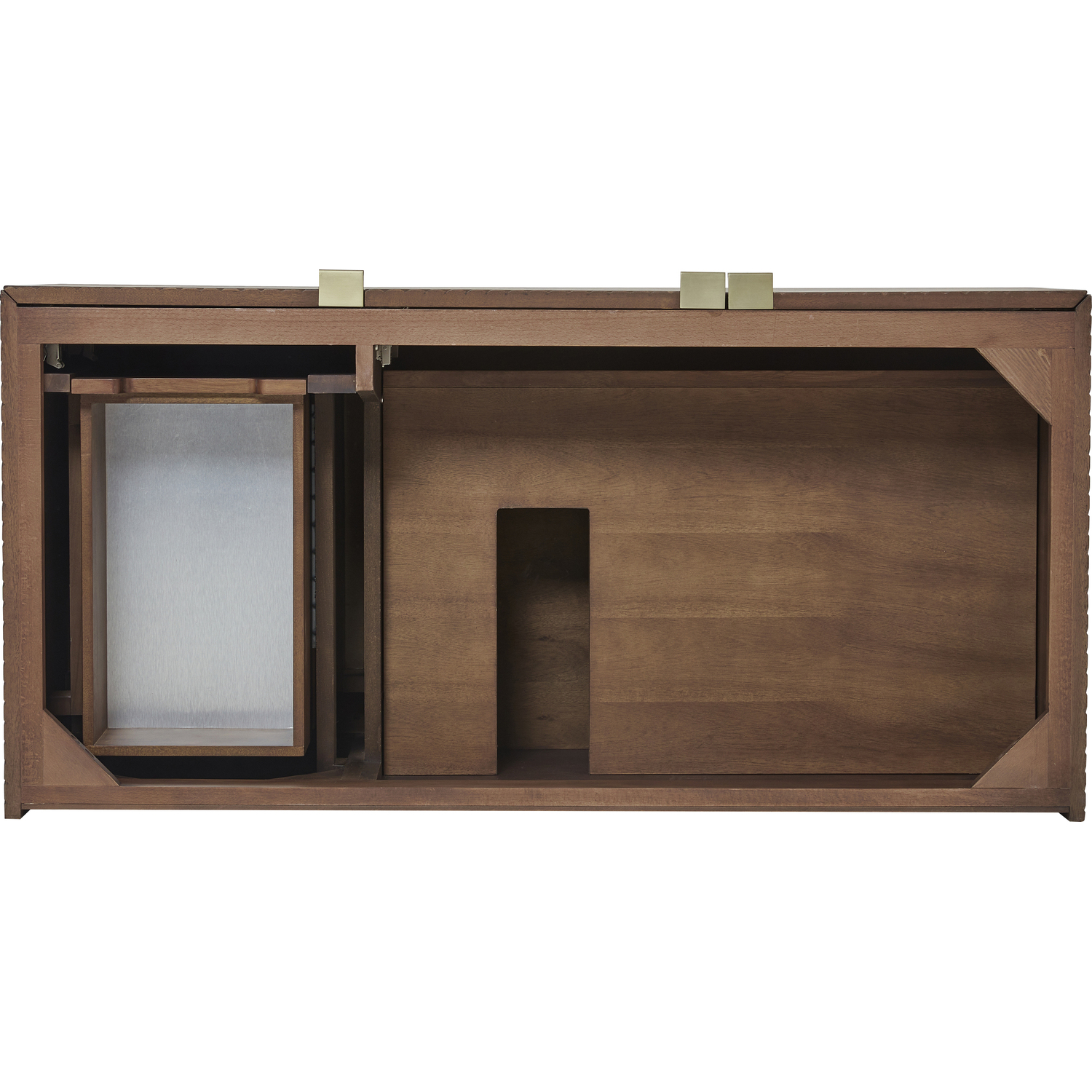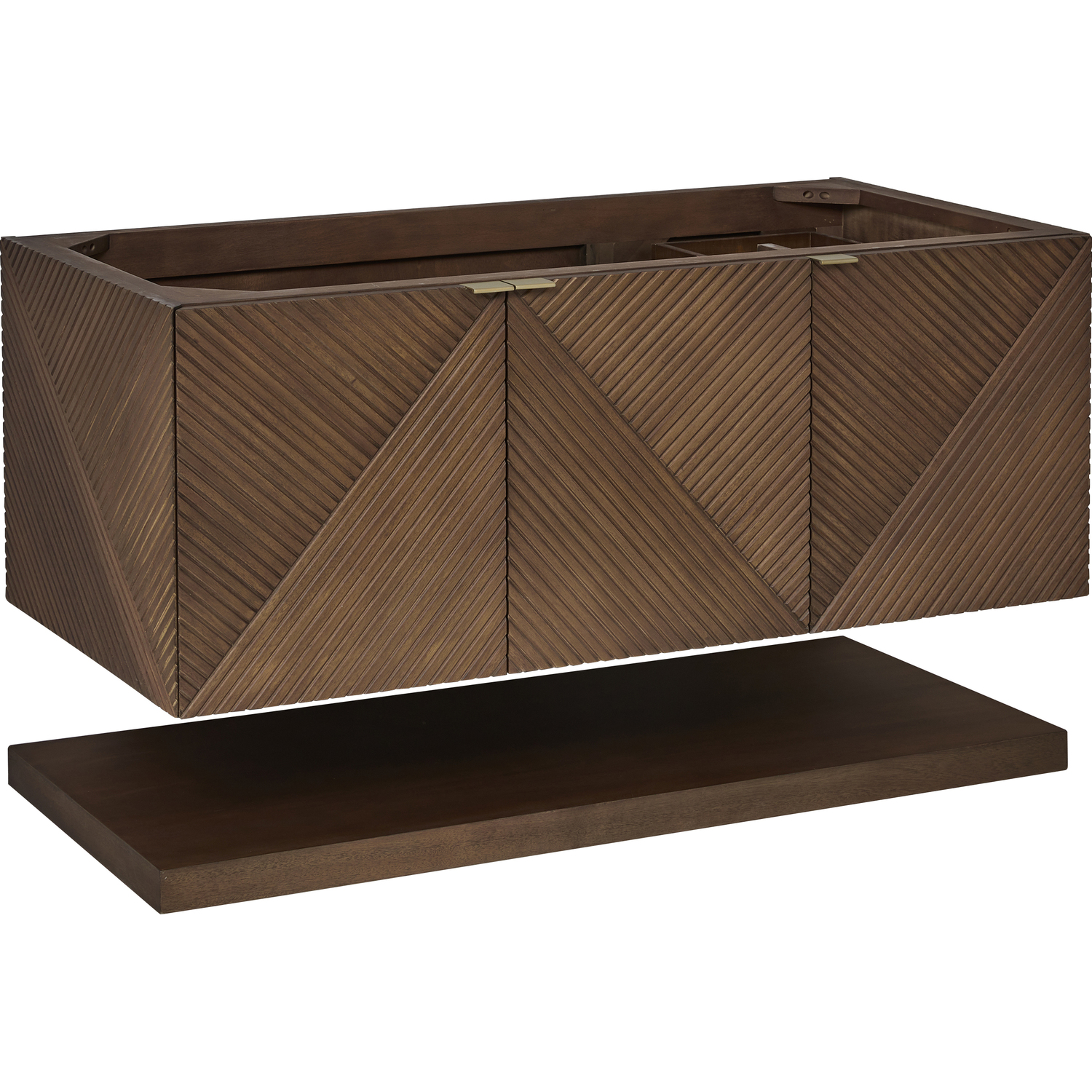 The 48" Marcello wall-mounted vanity adds a touch of mid-century modern charm to your bathroom, while the warm Chestnut finish provides timeless elegance. The reeded, patterned detail on the door fronts continues around the sides in geometric perfection. Crafted from solid Acacia, with rich, resawn Acacia veneer over Marine MDF, accented by sleek, tab-style door pulls in Champagne Brass. The wide, spacious interior drawers are framed on the top by a generous shelf and features our signature aluminum laminate liners and full extension, soft-close undermount glides. A floating shelf, mounted separately, adds a modern and visually balanced storage solution. The wall-hanging feature contemporizes the look with an easy-to install bracket system included.Cabinet only - select one of our coordinating 3cm tops, which includes an undermount, white porcelain sink48” W x 23-1/2” D x 17-7/8” HLower shelf and mounting hardware includedThree doors open to internal shelfChampagne Brass tab-style pullsDrawer boxes feature English Dovetail joinery, premium undermount glides, and brushed aluminum laminate drawer liners for easy cleaning.Crafted from solid Acacia, with rich, resawn Acacia veneer over Marine MDFSoft-close, full extension undermount drawer glides and soft-close door hingesThe Marcello Collection offers modern visual drama that boasts practical sensibility. The fluted panels, finished in a warm Chestnut stain over re-sawn Acacia veneers, are accentuated by the precisely mirrored geometrical pattern, which meticulously wraps around to the side panels. Discreetly designed doors with tabbed style Champagne Brass pulls open to an internal drawer and shelf. A coordinating, floating shelf adds visual balance while adding extra storage and a spa-like feel.1 year warranty against manufacturer's defects. We will repair or replace any defective product, if the product is defective in material or workmanship at our discretion. No warranty is expressed or implied regarding damages resulting from consumer misuse.