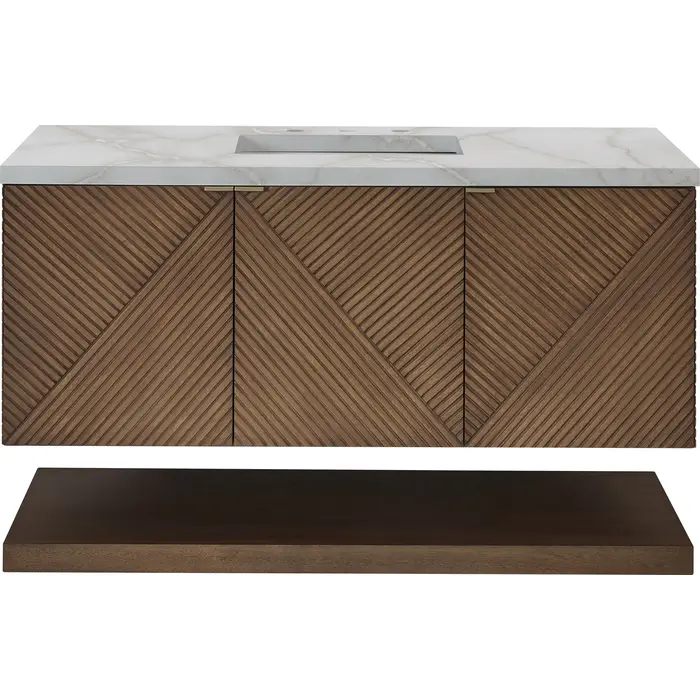 The 48" Marcello wall-mounted vanity adds a touch of mid-century modern charm to your bathroom, while the warm Chestnut finish provides timeless elegance. The reeded, patterned detail on the door fronts continues around the sides in geometric perfection. Crafted from solid Acacia, with rich, resawn Acacia veneers over Marine MDF, Marcello is accented by sleek, tab-style door pulls in Champagne Brass. Three cabinet doors open to reveal a wide, spacious shelf and two interior drawers featuring our signature aluminum laminate liners and full extension, soft-close undermount slides. This vanity is completed with a Victorian Silver Silestone top, showcasing a neutral background with champagne metallic accents which beautifully accent the rich finish and hardware of the vanity. This unit is enabled with FreePower wireless charging; featuring a single-device charger seamlessly embedded into the countertop, indicated by a light-up halo to the left of the sink. Designed for modern living, FreePower offers convenient, integrated, wireless charging when and where you need it.Three cabinet doors that open to reveal an adjustable interior shelf and two interior drawersDrawer boxes feature English Dovetail joinery with premium, soft-close undermount drawer slides; doors feature soft-close, adjustable door hingesCabinet features a multi-stage premium finish coat to offer UV and moisture resistanceChestnut finish with Champagne Brass tab-style hardwareCountertop is pre-drilled for an 8" widespread faucet; our 3cm eased edge countertops come with white porcelain rectangular sink(s) that ship separately and include mounting brackets for easy installationLower floating shelf and mounting hardware includedDrawers lined with our signature brushed aluminum laminate for easy cleaningFloating Vanity (wall-mounted with included French Cleat hardware)Faucet sold separatelyMatching stone backsplash available as add-on purchaseFreePower Wireless Charging; single-device unit left of sinkThe wall-mounted Marcello Collection offers stunning visual drama with its ribbed panel doors and geometric patterned design. Crafted from solid Acacia and finished with a warm Chestnut stain over resawn Acacia veneers, the Marcello's striking diagonal ribs meticulously align from every angle. Discreetly designed doors with tab finger pulls in Champagne Brass open to reveal internal shelves and drawers. A coordinating, floating bottom shelf adds visual balance while adding additional storage and a spa-like ambiance.1 year warranty against manufacturer's defects. We will repair or replace any defective product, if the product is defective in material or workmanship at our discretion. No warranty is expressed or implied regarding damages resulting from consumer misuse.