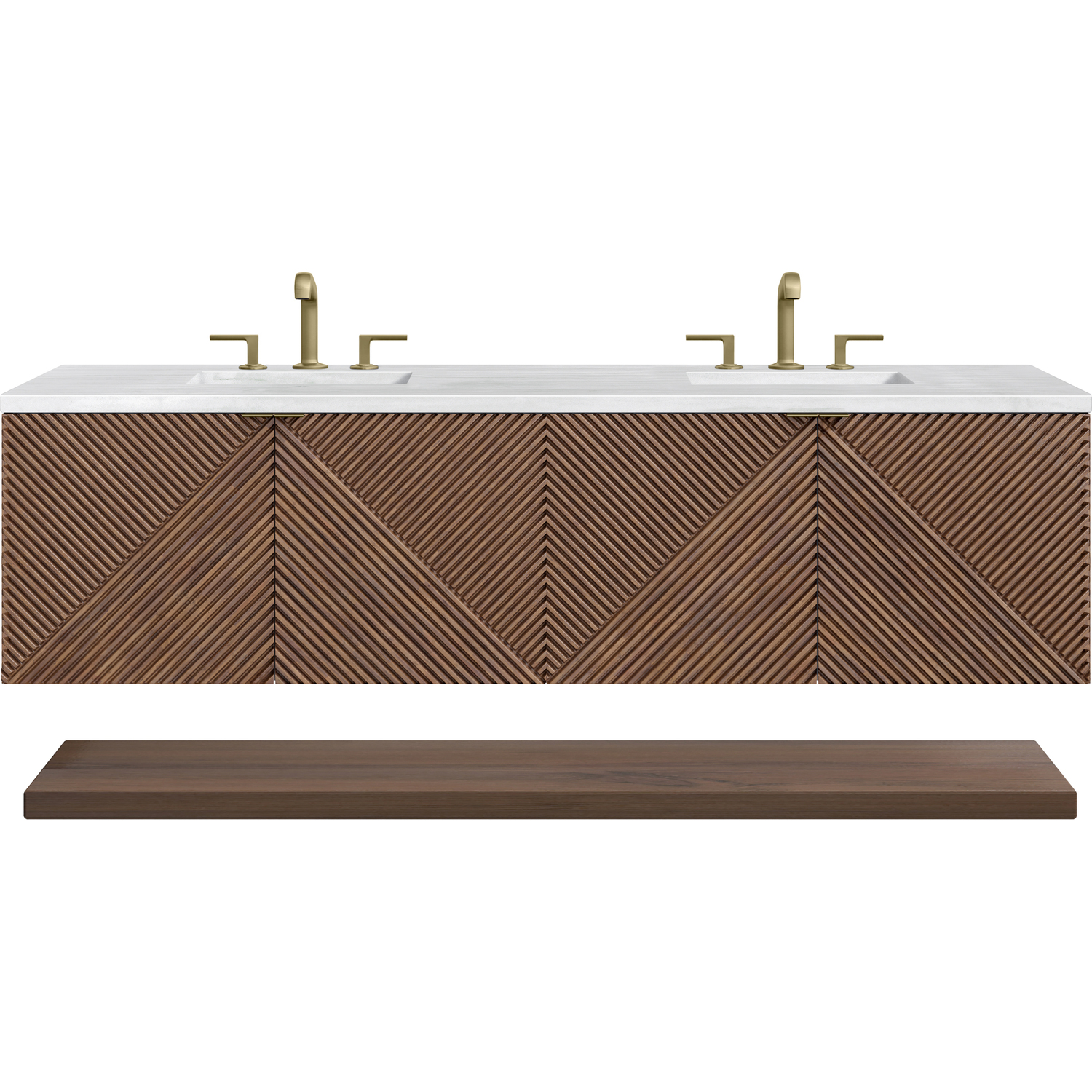 The 72" Marcello wall-mounted vanity adds a touch of mid-century modern charm to your bathroom, while the warm Chestnut finish gives it a timeless elegance. The reeded, patterned detail on the door fronts continues around the sides in geometric perfection. Crafted from solid Acacia, with rich, resawn Acacia veneer over Marine MDF, accented by sleek, tab-style door pulls in Champagne Brass. Two spacious interior drawers are framed on the top by a generous shelf and feature our signature aluminum laminate liners and full extension, soft-close undermount glides. A floating shelf, mounted separately, adds a modern and visually balanced storage solution. The wall-hanging feature contemporizes the look with an easy-to"stall bracket system included. The 3 CM countertop, pre-drilled for an 8" widespread faucet, includes mounting hardware for the porcelain undermount sink. Adding an elegant contrast to the rich wood with Champagne Brass hardware, the 3 cm solid surface Arctic Fall vanity top displays horizontal grey veining giving you the look of expensive marble without the cost.3 CM eased edge Arctic Fall, solid surface top includes a white porcelain rectangular sink that ships separately and includes mounting brackets for easy installation. Faucet not included.Crafted from solid Acacia, with rich, resawn Acacia veneer over Marine MDFThe drawer boxes feature English Dovetail joinery and our signature brushed aluminum laminate drawer liners for easy cleaningFour Door cabinet with interior drawerOne floating shelf, includedFloating vanity with mounting hardware. Designed to be 36" height including optional 3 cm top.Tab style door pulls in Champagne Brass finishSoft-close, full extension undermount drawer glides and soft-close door hingesOur Marcello wall-mounted vanity collection's clean lines and geometric design will add a touch of mid-century modern charm to your bathroom. The warm Chestnut finish adds timeless elegance, while the pattern play detail of the reeded front adds visual interest to this masterpiece. The wall-hanging feature contemporizes the look with an easy-to-install bracket system included. Available in 36" and 72", the Marcello collection features pairs of doors accented in Champagne Brass finish tab-style door pulls that reveal internal drawer storage and a generous internal shelf. A floating shelf, perfect for folded towels, adds a spa feel.1 year warranty against manufacturer's defects. We will repair or replace any defective product, if the product is defective in material or workmanship at our discretion. No warranty is expressed or implied regarding damages resulting from consumer misuse.
