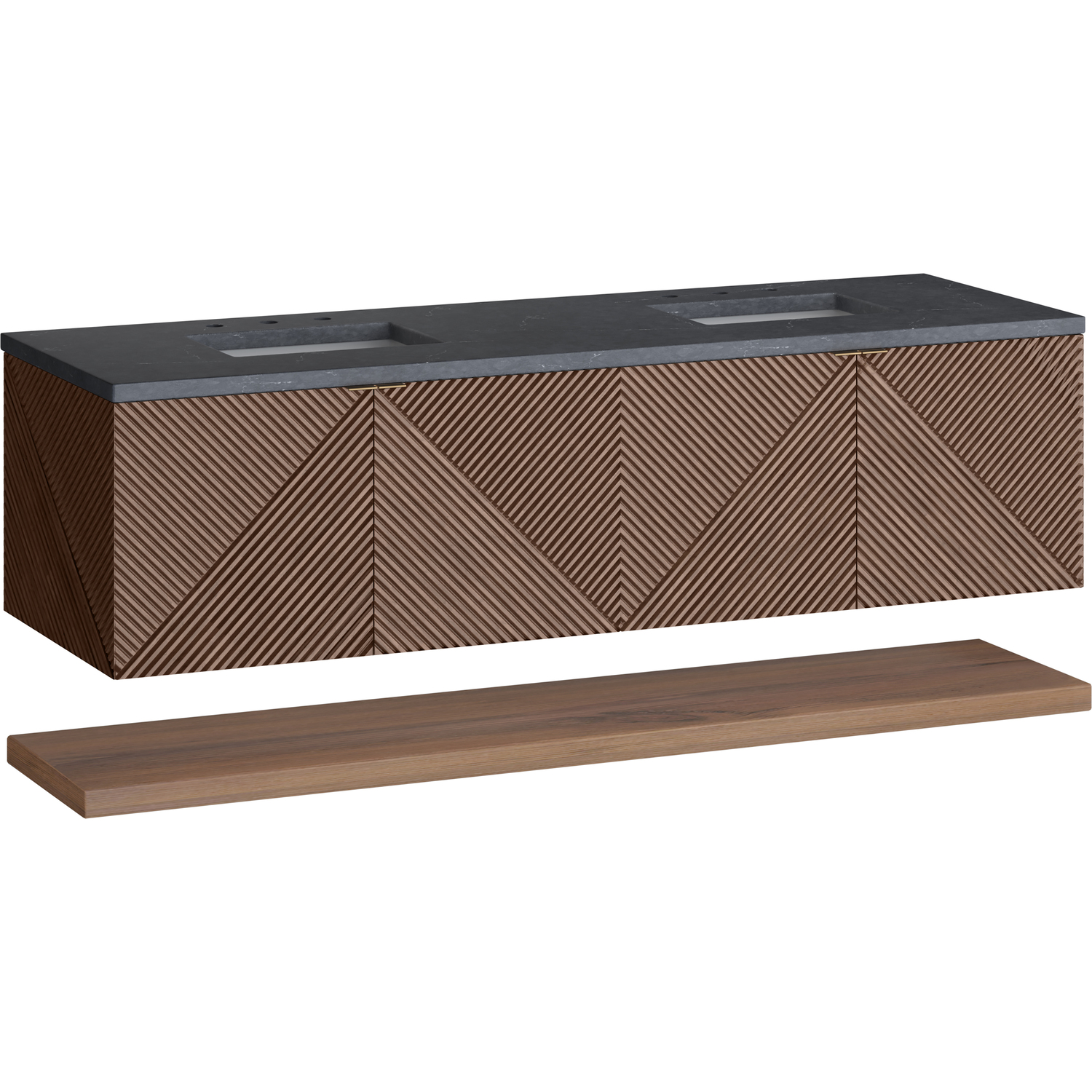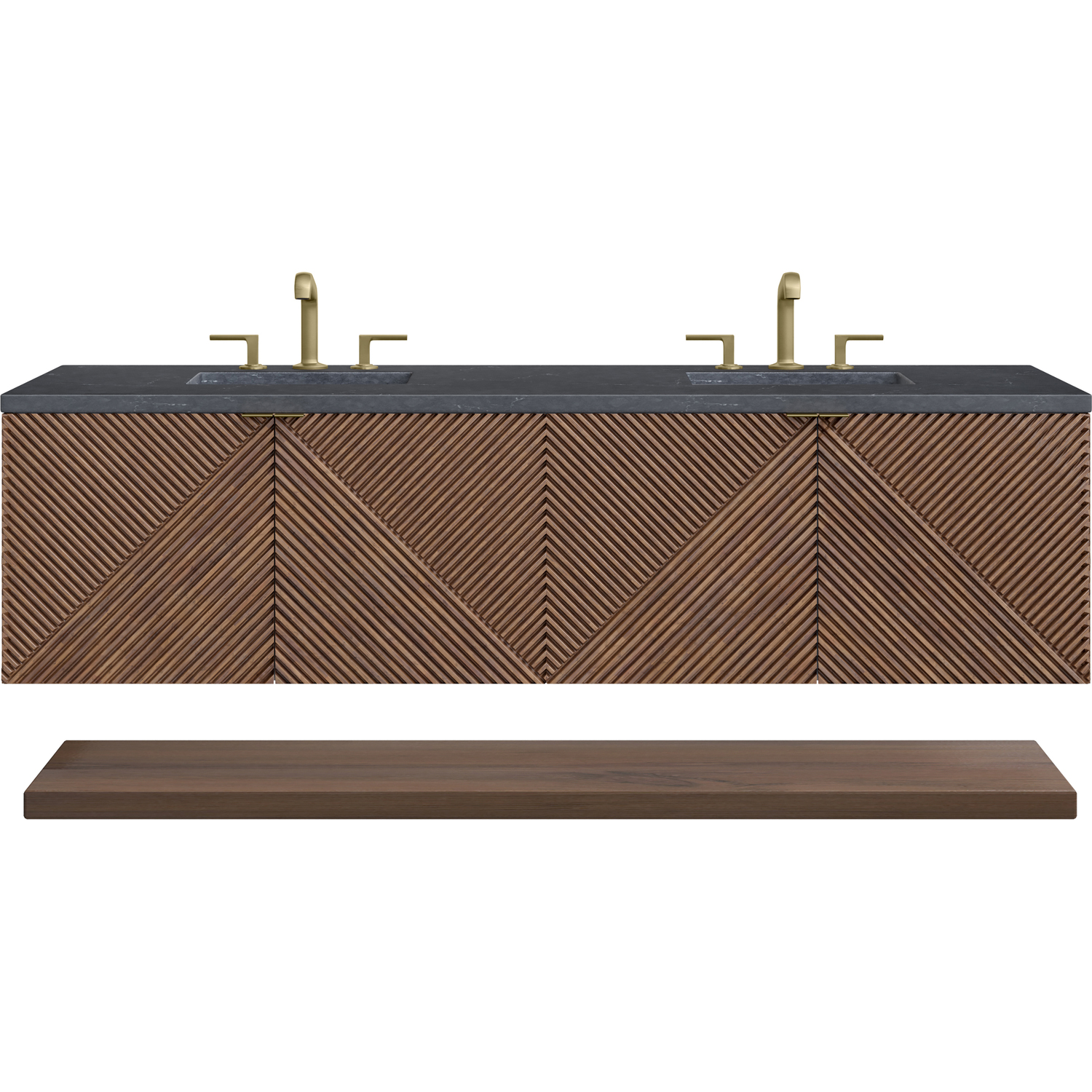 The 72" Marcello wall-mounted vanity adds a touch of mid-century modern charm to your bathroom, while the warm Chestnut finish gives it a timeless elegance. The reeded, patterned detail on the door fronts continues around the sides in geometric perfection. Crafted from solid Acacia, with rich, resawn Acacia veneer over Marine MDF, accented by sleek, tab-style door pulls in Champagne Brass. Two spacious interior drawers are framed on the top by a generous shelf and feature our signature aluminum laminate liners and full extension, soft-close undermount glides. A floating shelf, mounted separately, adds a modern and visually balanced storage solution. The wall-hanging feature contemporizes the look with an easy-to"stall bracket system included. The 3 CM countertop, pre-drilled for an 8" widespread faucet, includes mounting hardware for the porcelain undermount sink. A spectacular top characterized by depth and a sense of movement with a suede finish, the Charcoal Soapstone Silestone top by Cosentino has the new n-boost technology, which helps prevent the adhesion of liquids, enhances shine, and intensifies the color of this top.3 CM eased edge Charcoal Soapstone Silestone top includes a white porcelain rectangular sink that ships separately and includes mounting brackets for easy installation. Faucet not included.Crafted from solid Acacia, with rich, resawn Acacia veneer over Marine MDFThe drawer boxes feature English Dovetail joinery and our signature brushed aluminum laminate drawer liners for easy cleaningFour Door cabinet with interior drawerOne floating shelf, includedFloating vanity with mounting hardware. Designed to be 36" height including optional 3 cm top.Tab style door pulls in Champagne Brass finishSoft-close, full extension undermount drawer glides and soft-close door hingesOur Marcello wall-mounted vanity collection's clean lines and geometric design will add a touch of mid-century modern charm to your bathroom. The warm Chestnut finish adds timeless elegance, while the pattern play detail of the reeded front adds visual interest to this masterpiece. The wall-hanging feature contemporizes the look with an easy-to-install bracket system included. Available in 36" and 72", the Marcello collection features pairs of doors accented in Champagne Brass finish tab-style door pulls that reveal internal drawer storage and a generous internal shelf. A floating shelf, perfect for folded towels, adds a spa feel.1 year warranty against manufacturer's defects. We will repair or replace any defective product, if the product is defective in material or workmanship at our discretion. No warranty is expressed or implied regarding damages resulting from consumer misuse.
