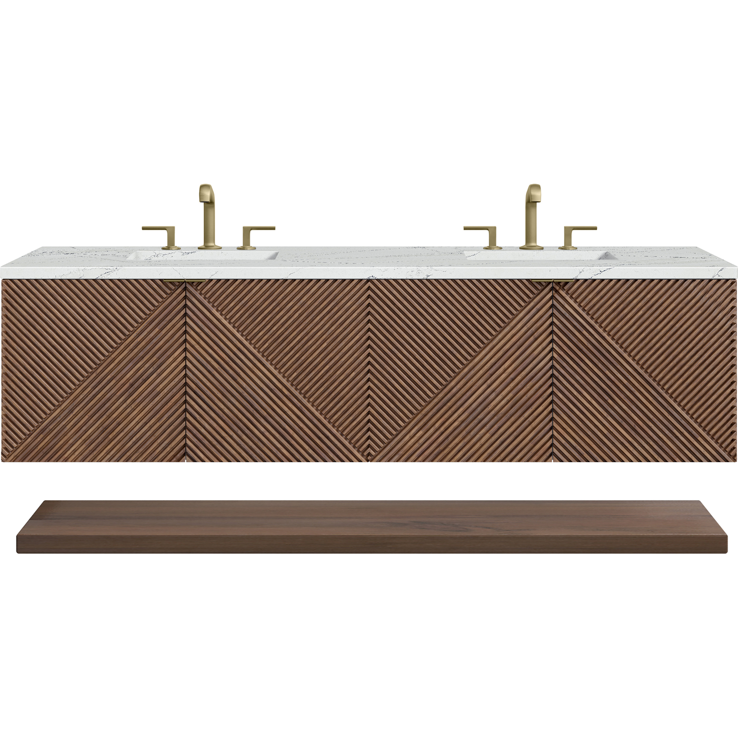 - Our Marcello wall-mounted vanity collection's clean lines and geometric design will add a touch of mid-century modern charm to your bathroom. The warm Chestnut finish adds timeless elegance, while the pattern play detail of the reeded front adds visual interest to this masterpiece. The wall-hanging feature contemporizes the look with an easy-to-install bracket system included. Available in 36" and 72", the Marcello collection features pairs of doors accented in Champagne Brass finish tab-style door pulls that reveal internal drawer storage and a generous internal shelf. A floating shelf, perfect for folded towels, adds a spa feel.