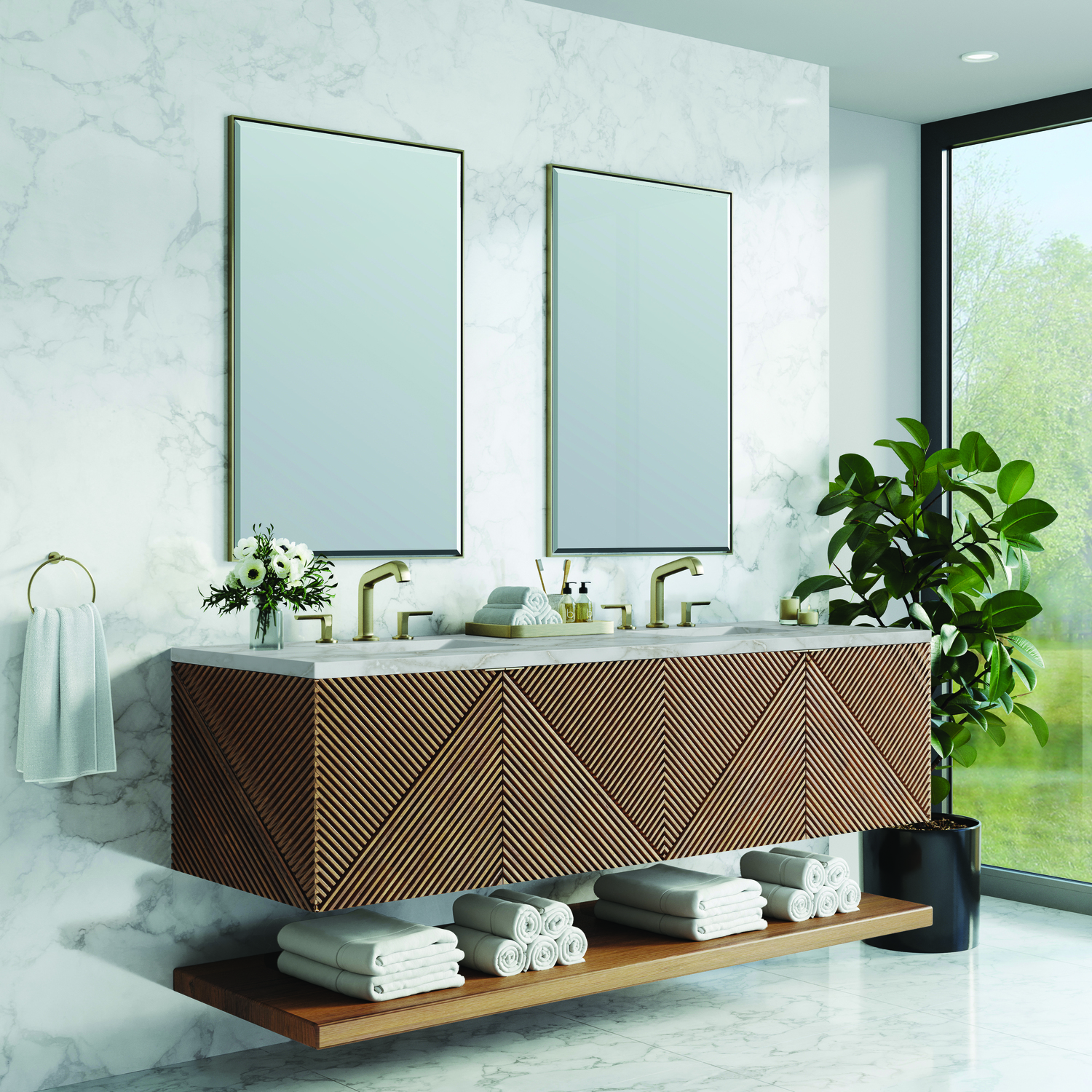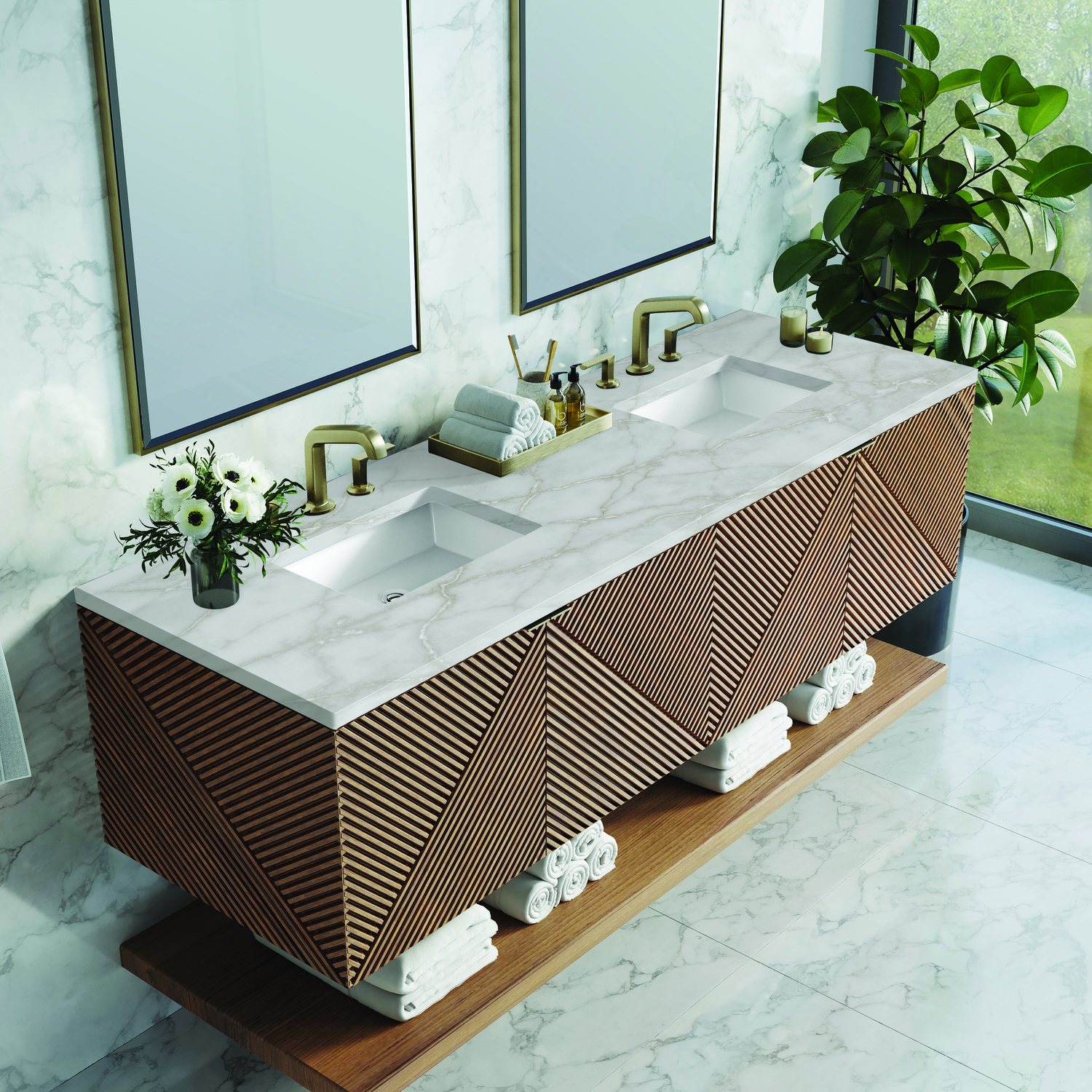 The 72" Marcello wall-mounted vanity adds a touch of mid-century modern charm to your bathroom, while the warm Chestnut finish gives it a timeless elegance. The reeded, patterned detail on the door fronts continues around the sides in geometric perfection. Crafted from solid Acacia, with rich, resawn Acacia veneer over Marine MDF, accented by sleek, tab-style door pulls in Champagne Brass. Two spacious interior drawers are framed on the Silestone Top by a generous shelf and feature our signature aluminum laminate liners and full extension, soft-close undermount glides. A floating shelf, mounted separately, adds a modern and visually balanced storage solution. The wall-hanging feature contemporizes the look with an easy-to install bracket system included. Adding an sophisticated contrast to the rich Chestnut finish and Champagne Brass hardware is the neutral background of the Victorian Silver Silestone top, boasting champagne metallic accents which subtly complements the wood and metal on the vanity.Vanity set includes a 3cm eased edge Victorian Silver Silestone top and backsplash includes white porcelain rectangular sinks that ship separately and includes mounting brackets for easy installation. Top is pre-drilled for 8-inch widespread faucets. FaucCrafted from solid Acacia, with rich, resawn Acacia veneer over Marine MDFThe drawer boxes feature English Dovetail joinery and our signature brushed aluminum laminate drawer liners for easy cleaningFour Door cabinet with interior drawerOne floating shelf, includedFloating vanity with mounting hardware. Designed to be 36" height including optional 3 cm top.Tab style door pulls in Champagne Brass finishSoft-close, full extension undermount drawer glides and soft-close door hingesFaucets sold separatelyCountertop is pre-drilled for two 3-hole 8" spreadsOur Marcello wall-mounted vanity collection's clean lines and geometric design will add a touch of mid-century modern charm to your bathroom. The warm Chestnut finish adds timeless elegance, while the pattern play detail of the reeded front adds visual interest to this masterpiece. The wall-hanging feature contemporizes the look with an easy-to-install bracket system included. Available in 36" and 72", the Marcello collection features pairs of doors accented in Champagne Brass finish tab-style door pulls that reveal internal drawer storage and a generous internal shelf. A floating shelf, perfect for folded towels, adds a spa feel.1 year warranty against manufacturer's defects. We will repair or replace any defective product, if the product is defective in material or workmanship at our discretion. No warranty is expressed or implied regarding damages resulting from consumer misuse.