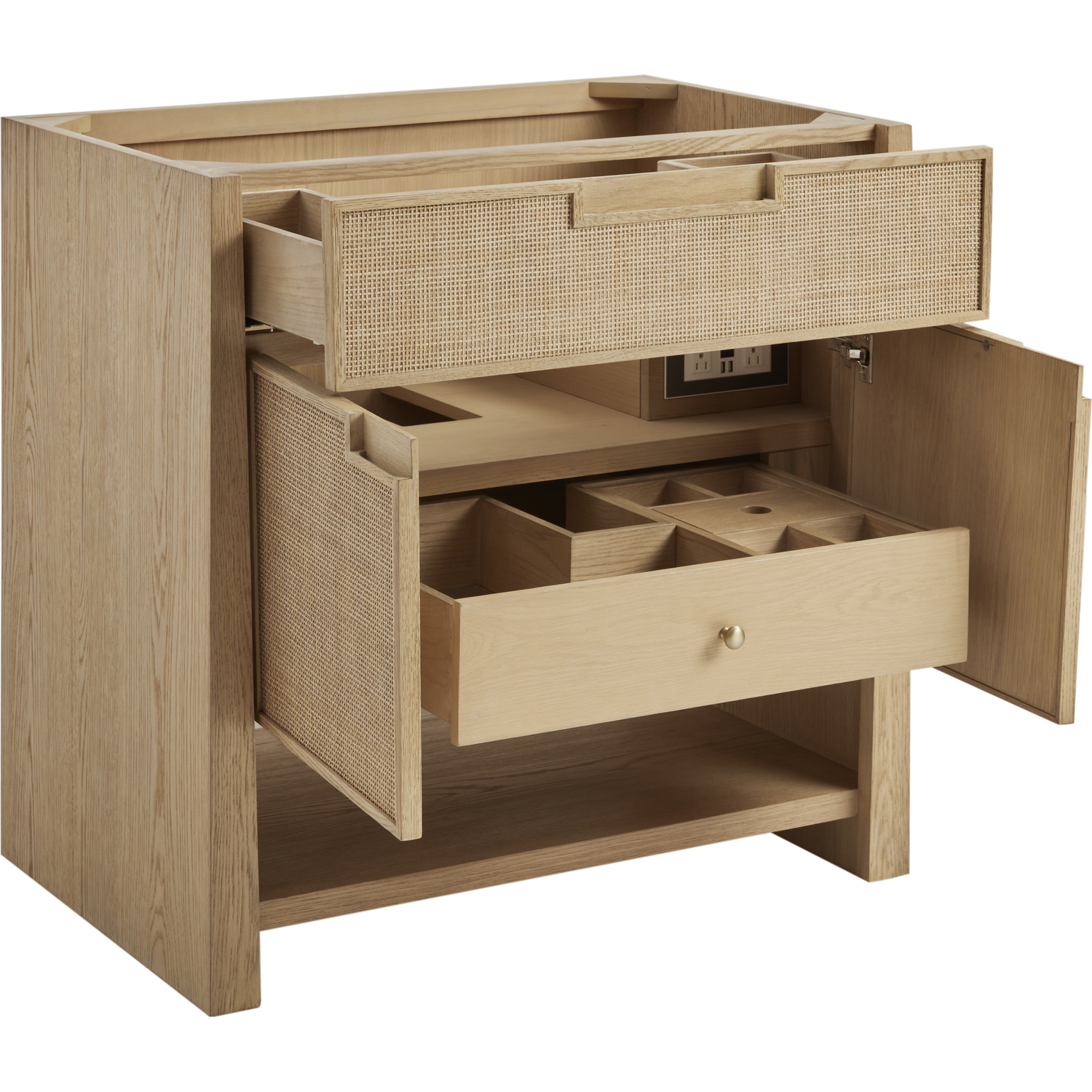 The Solene 36" Single Vanity elegantly weaves together a beautiful blend of natural materials. Framed in solid White Oak, the natural Cane detail and warm Seaside Oak finish make the Solene a stunning centerpiece for your bathroom. The subtle reverse-tapered legs and modern cutout cabinet pulls add visual intrigue to your space. Featuring an integrated USB/120V power unit and removable White Oak drawer organizer, this vanity offers ample storage with its two-door cabinet, full-extension exterior drawer, interior shelf, and internal drawer, in addition to an open lower shelf. Completed with a classic White Zeus Silestone top with a single-hole faucet configuration, backsplash, and undermount sink, the Solene vanity will bring your bathroom to life with its blend of natural elements and contemporary aesthetic.Two-door cabinet with one full-extension external drawer, one internal drawer, and a lower console shelfDrawer boxes feature English Dovetail joinery with premium, soft-close undermount drawer slides; doors feature soft-close, adjustable door hingesSolid White Oak cabinet features a multi-stage premium finish coat to offer UV and moisture resistanceSeaside Oak finishWhite Zeus Silestone top is pre-drilled for a single hole faucet; our 3cm countertops come with white porcelain rectangular sink(s) that ship separately and include mounting brackets for easy installationIntegrated 120V outlet with USB portsDrawers lined with our signature brushed aluminum laminate for easy cleaningRemovable White Oak drawer organizer includedMatching White Zeus 3cm Silestone backsplash & decorative wood backsplash included.Faucet sold separatelyFreestanding vanityRooted in the elegance of Scandinavian simplicity and the craftsmanship of Arts and Crafts design, the Solene Collection showcases a masterful blend of architectural finesse. Built from solid White Oak with White Oak veneers and natural Cane, the Solene weaves together an elegant blend of natural materials. The subtle reverse-tapered legs add visual intrigue, and the natural Cane door and drawer panels utilize modern cutout cabinet pulls. Offered in an elegant Seaside Oak finish and three sizes, the Solene offers generous storage with both exterior and interior drawers. Bring your bathroom to life with the natural elements and contemporary aesthetic of Solene.1 year warranty against manufacturer's defects. We will repair or replace any defective product, if the product is defective in material or workmanship at our discretion. No warranty is expressed or implied regarding damages resulting from consumer misuse.