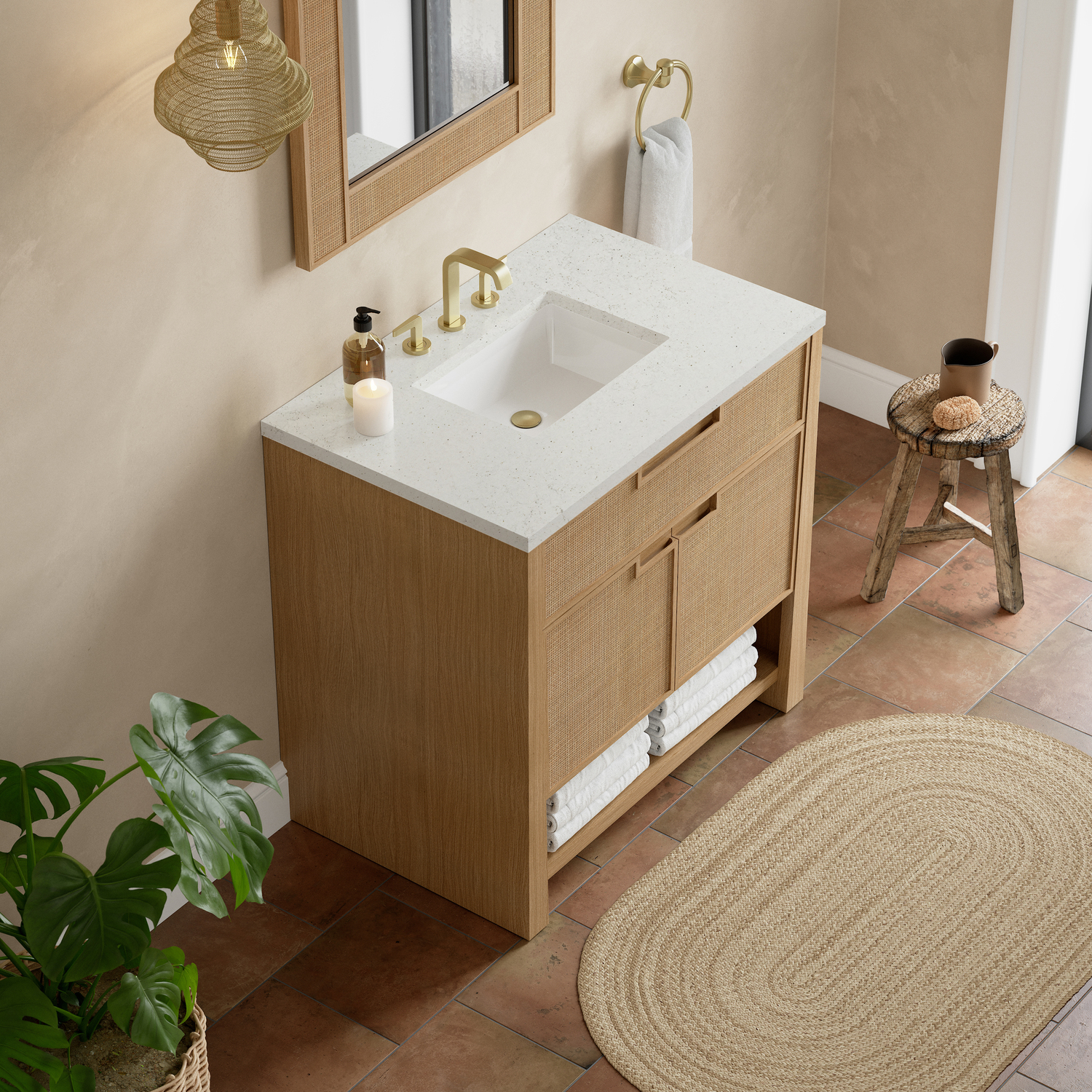 The Solene 36" Single Vanity elegantly weaves together a beautiful blend of natural materials. Framed in solid White Oak, the natural Cane detail and warm Seaside Oak finish make the Solene a stunning centerpiece for your bathroom. The subtle reverse-tapered legs and modern cutout cabinet pulls add visual intrigue to your space. Featuring an integrated USB/120V power unit and removable White Oak drawer organizer, this vanity offers ample storage with its two-door cabinet, full-extension exterior drawer, interior shelf, and internal drawer, in addition to an open lower shelf. Completed with a beautiful suede-finished Lime Delight Silestone top and undermount sink, the Solene vanity will bring your bathroom to life with its blend of natural elements and contemporary aesthetic.Two-door cabinet with one full-extension external drawer, one internal drawer, and a lower console shelfDrawer boxes feature English Dovetail joinery with premium, soft-close undermount drawer slides; doors feature soft-close, adjustable door hingesSolid White Oak cabinet features a multi-stage premium finish coat to offer UV and moisture resistanceSeaside Oak finishCountertop is pre-drilled for an 8" widespread faucet; our 3cm eased edge countertops come with white porcelain rectangular sink(s) that ship separately and include mounting brackets for easy installationIntegrated 120V outlet with USB portsDrawers lined with our signature brushed aluminum laminate for easy cleaningRemovable White Oak drawer organizer includedFreestanding vanityFaucet sold separatelyRooted in the elegance of Scandinavian simplicity and the craftsmanship of Arts and Crafts design, the Solene Collection showcases a masterful blend of architectural finesse. Built from solid White Oak with White Oak veneers and natural Cane, the Solene weaves together an elegant blend of natural materials. The subtle reverse-tapered legs add visual intrigue, and the natural Cane door and drawer panels utilize modern cutout cabinet pulls. Offered in an elegant Seaside Oak finish and three sizes, the Solene offers generous storage with both exterior and interior drawers. Bring your bathroom to life with the natural elements and contemporary aesthetic of Solene.1 year warranty against manufacturer's defects. We will repair or replace any defective product, if the product is defective in material or workmanship at our discretion. No warranty is expressed or implied regarding damages resulting from consumer misuse.