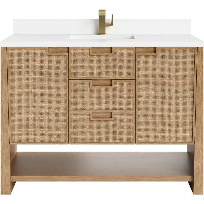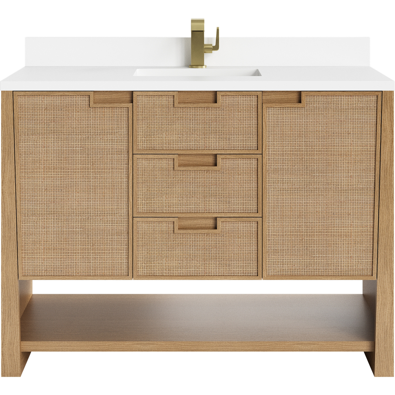The Solene 48" Single Vanity elegantly weaves together a beautiful blend of natural materials. Framed in solid White Oak, the natural Cane detail and warm Seaside Oak finish make the Solene a stunning centerpiece for your bathroom. The subtle reverse-tapered legs and modern cutout cabinet pulls add visual intrigue to your space. Featuring an integrated USB/120V power unit and removable White Oak drawer organizer, this vanity offers ample storage with its two full-extension drawers, one tip-out drawer, and two single cabinets with interior shelving and two internal drawers, in addition to an open lower shelf. Completed with a classic White Zeus Silestone top with a single-hole faucet configuration, backsplash, and undermount sink, the Solene vanity will bring your bathroom to life with its blend of natural elements and contemporary aesthetic.Two full-extension exterior drawers and one top-row tip-out drawer; two single cabinet doors, two internal drawers, and a lower console shelfDrawer boxes feature English Dovetail joinery with premium, soft-close undermount drawer slides; doors feature soft-close, adjustable door hingesSolid White Oak cabinet features a multi-stage premium finish coat to offer UV and moisture resistanceSeaside Oak finishWhite Zeus Silestone top is pre-drilled for a single hole faucet; our 3cm countertops come with white porcelain rectangular sink(s) that ship separately and include mounting brackets for easy installationIntegrated 120V outlet with USB portsDrawers lined with our signature brushed aluminum laminate for easy cleaningRemovable White Oak drawer organizer includedMatching White Zeus 3cm Silestone backsplash & decorative wood backsplash included.Faucet sold separatelyFreestanding vanityRooted in the elegance of Scandinavian simplicity and the craftsmanship of Arts and Crafts design, the Solene Collection showcases a masterful blend of architectural finesse. Built from solid White Oak with White Oak veneers and natural Cane, the Solene weaves together an elegant blend of natural materials. The subtle reverse-tapered legs add visual intrigue, and the natural Cane door and drawer panels utilize modern cutout cabinet pulls. Offered in an elegant Seaside Oak finish and three sizes, the Solene offers generous storage with both exterior and interior drawers. Bring your bathroom to life with the natural elements and contemporary aesthetic of Solene.1 year warranty against manufacturer's defects. We will repair or replace any defective product, if the product is defective in material or workmanship at our discretion. No warranty is expressed or implied regarding damages resulting from consumer misuse.