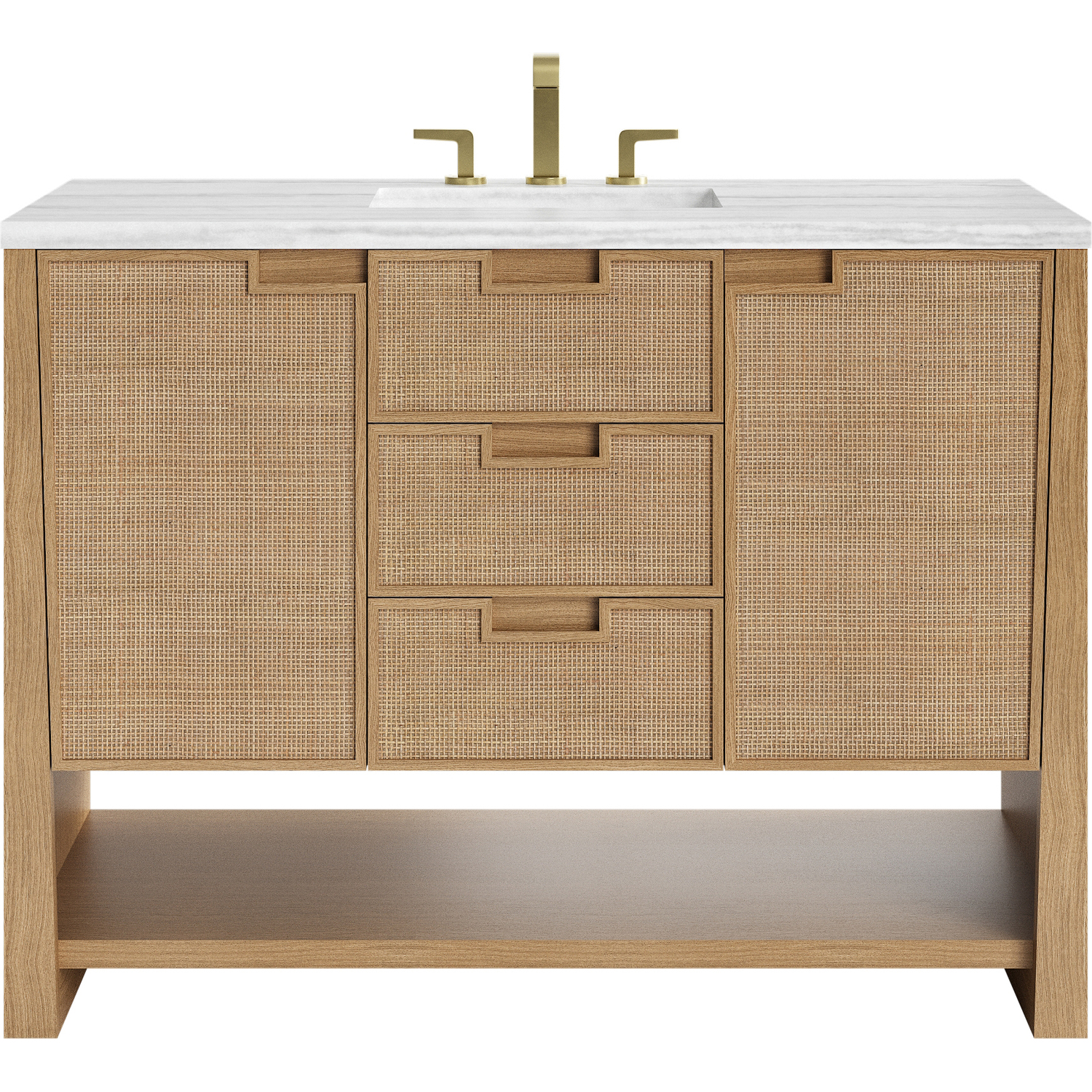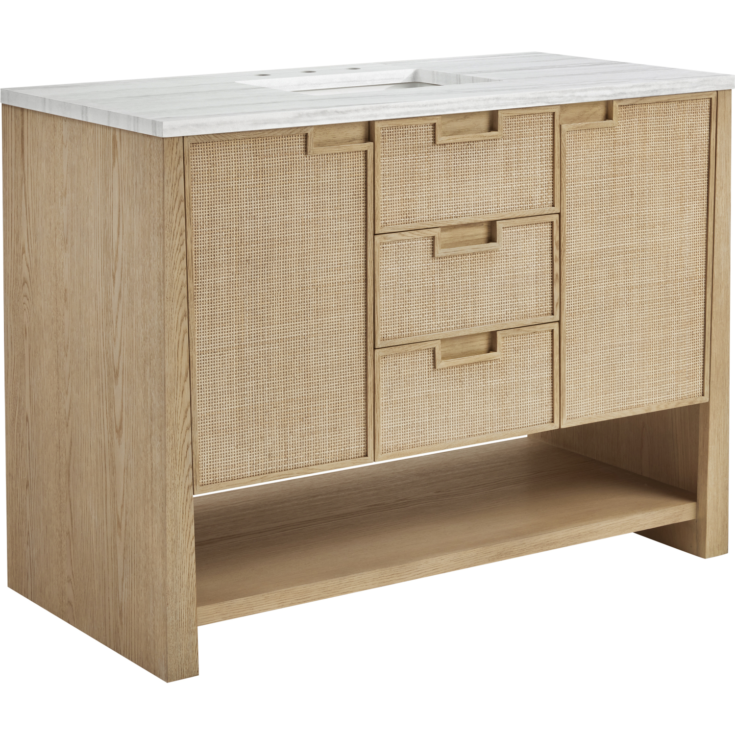 The Solene 48" Single Vanity elegantly weaves together a beautiful blend of natural materials. Framed in solid White Oak, the natural Cane detail and warm Seaside Oak finish make the Solene a stunning centerpiece for your bathroom. The subtle reverse-tapered legs and modern cutout cabinet pulls add visual intrigue to your space. Featuring an integrated USB/120V power unit and removable White Oak drawer organizer, this vanity offers ample storage with its two full-extension drawers, one tip-out drawer, and two single cabinets with interior shelving and two internal drawers, in addition to an open lower shelf. Completed with a modern Arctic Fall Solid Surface top and undermount sink, the Solene vanity will bring your bathroom to life with its blend of natural elements and contemporary aesthetic.Two full-extension exterior drawers and one top-row tip-out drawer; two single cabinet doors, two internal drawers, and a lower console shelfDrawer boxes feature English Dovetail joinery with premium, soft-close undermount drawer slides; doors feature soft-close, adjustable door hingesSolid White Oak cabinet features a multi-stage premium finish coat to offer UV and moisture resistanceSeaside Oak finishCountertop is pre-drilled for an 8" widespread faucet; our 3cm eased edge countertops come with white porcelain rectangular sink(s) that ship separately and include mounting brackets for easy installationIntegrated 120V outlet with USB portsDrawers lined with our signature brushed aluminum laminate for easy cleaningRemovable White Oak drawer organizer includedFreestanding vanityFaucet sold separatelyRooted in the elegance of Scandinavian simplicity and the craftsmanship of Arts and Crafts design, the Solene Collection showcases a masterful blend of architectural finesse. Built from solid White Oak with White Oak veneers and natural Cane, the Solene weaves together an elegant blend of natural materials. The subtle reverse-tapered legs add visual intrigue, and the natural Cane door and drawer panels utilize modern cutout cabinet pulls. Offered in an elegant Seaside Oak finish and three sizes, the Solene offers generous storage with both exterior and interior drawers. Bring your bathroom to life with the natural elements and contemporary aesthetic of Solene.1 year warranty against manufacturer's defects. We will repair or replace any defective product, if the product is defective in material or workmanship at our discretion. No warranty is expressed or implied regarding damages resulting from consumer misuse.