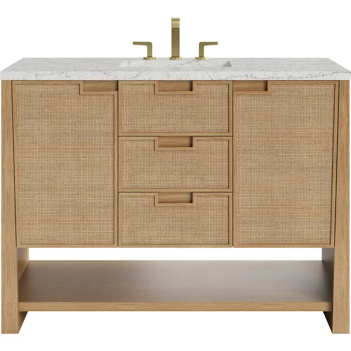 The Solene 48" Single Vanity by James Martin Vanities elegantly weaves together a beautiful blend of natural materials. Framed in solid White Oak, the natural Cane detail and warm Seaside Oak finish make the Solene a stunning centerpiece for your bathroom. The subtle reverse-tapered legs and modern cutout cabinet pulls add visual intrigue to your space. Featuring an integrated USB/120V power unit and removable White Oak drawer organizer, this vanity offers ample storage with its two full-extension drawers, one tip-out drawer, and two single cabinets with interior shelving and two internal drawers, in addition to an open lower shelf. Completed with a luminous Eternal Jasmine Pearl Silestone® top and undermount sink, the Solene vanity will bring your bathroom to life with its blend of natural elements and contemporary aesthetic. This unit is enabled with FreePower wireless charging; featuring a single-device charger seamlessly embedded into the countertop, indicated by a light-up halo to the left of the sink. Designed for modern living, FreePower offers convenient, integrated, wireless charging when and where you need it.Two full-extension exterior drawers and one top-row tip-out drawer; two single cabinet doors, two internal drawers, and a lower console shelfDrawer boxes feature English Dovetail joinery with premium, soft-close undermount drawer slides; doors feature soft-close, adjustable door hingesSolid White Oak cabinet features a multi-stage premium finish coat to offer UV and moisture resistanceSeaside Oak finish, sans hardwareCountertop is pre-drilled for an 8" widespread faucet; our 3cm eased edge countertops come with white porcelain rectangular sink(s) that ship separately and include mounting brackets for easy installationIntegrated 120V outlet with USB portsDrawers lined with our signature brushed aluminum laminate for easy cleaningRemovable White Oak drawer organizer includedFreestanding vanityFreePower Wireless Charging; single-device unit left of sinkFaucet sold separatelyMatching stone backsplash available as add-on purchaseRooted in the elegance of Scandinavian simplicity and the craftsmanship of Arts and Crafts design, the Solene Collection by James Martin Vanities showcases a masterful blend of architectural finesse. Built from solid White Oak with White Oak veneers and natural Cane, the Solene weaves together an elegant blend of natural materials. The subtle reverse-tapered legs add visual intrigue, and the natural Cane door and drawer panels utilize modern cutout cabinet pulls. Offered in an elegant Seaside Oak finish and three sizes, the Solene offers generous storage with both exterior and interior drawers. Bring your bathroom to life with the natural elements and contemporary aesthetic of Solene.1 year warranty against manufacturer's defects. We will repair or replace any defective product, if the product is defective in material or workmanship at our discretion. No warranty is expressed or implied regarding damages resulting from consumer misuse.