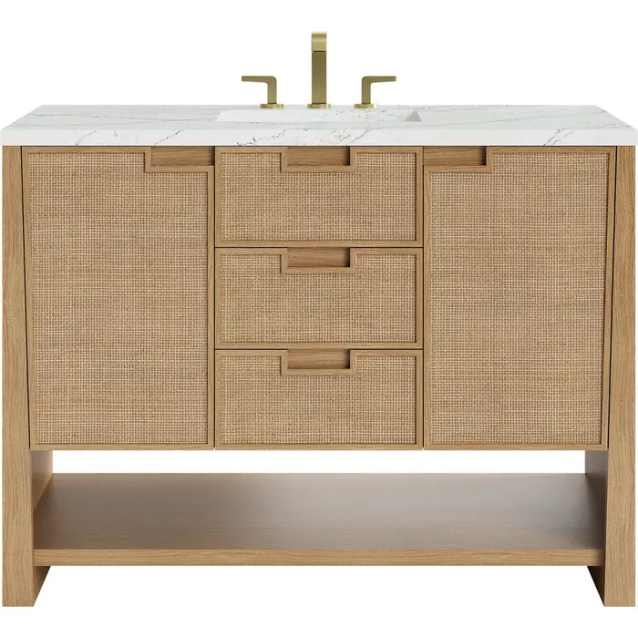 The Solene 48" Single Vanity by James Martin Vanities elegantly weaves together a beautiful blend of natural materials. Framed in solid White Oak, the natural Cane detail and warm Seaside Oak finish make the Solene a stunning centerpiece for your bathroom. The subtle reverse-tapered legs and modern cutout cabinet pulls add visual intrigue to your space. Featuring an integrated USB/120V power unit and removable White Oak drawer organizer, this vanity offers ample storage with its two full-extension drawers, one tip-out drawer, and two single cabinets with interior shelving and two internal drawers, in addition to an open lower shelf. Completed with a striking Ethereal Noctis Silestone® top and undermount sink, the Solene vanity will bring your bathroom to life with its blend of natural elements and contemporary aesthetic. This unit is enabled with FreePower wireless charging; featuring a single-device charger seamlessly embedded into the countertop, indicated by a light-up halo to the left of the sink. Designed for modern living, FreePower offers convenient, integrated, wireless charging when and where you need it.Two full-extension exterior drawers and one top-row tip-out drawer; two single cabinet doors, two internal drawers, and a lower console shelfDrawer boxes feature English Dovetail joinery with premium, soft-close undermount drawer slides; doors feature soft-close, adjustable door hingesSolid White Oak cabinet features a multi-stage premium finish coat to offer UV and moisture resistanceSeaside Oak finish, sans hardwareCountertop is pre-drilled for an 8" widespread faucet; our 3cm eased edge countertops come with white porcelain rectangular sink(s) that ship separately and include mounting brackets for easy installationIntegrated 120V outlet with USB portsDrawers lined with our signature brushed aluminum laminate for easy cleaningRemovable White Oak drawer organizer includedFreestanding vanityFreePower Wireless Charging; single-device unit left of sinkFaucet sold separatelyMatching stone backsplash available as add-on purchaseRooted in the elegance of Scandinavian simplicity and the craftsmanship of Arts and Crafts design, the Solene Collection by James Martin Vanities showcases a masterful blend of architectural finesse. Built from solid White Oak with White Oak veneers and natural Cane, the Solene weaves together an elegant blend of natural materials. The subtle reverse-tapered legs add visual intrigue, and the natural Cane door and drawer panels utilize modern cutout cabinet pulls. Offered in an elegant Seaside Oak finish and three sizes, the Solene offers generous storage with both exterior and interior drawers. Bring your bathroom to life with the natural elements and contemporary aesthetic of Solene.1 year warranty against manufacturer's defects. We will repair or replace any defective product, if the product is defective in material or workmanship at our discretion. No warranty is expressed or implied regarding damages resulting from consumer misuse.