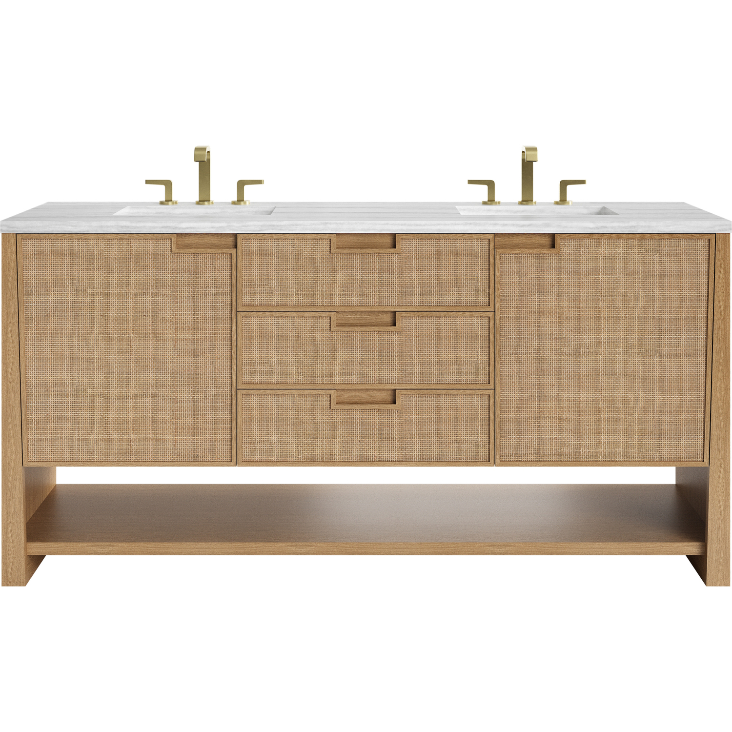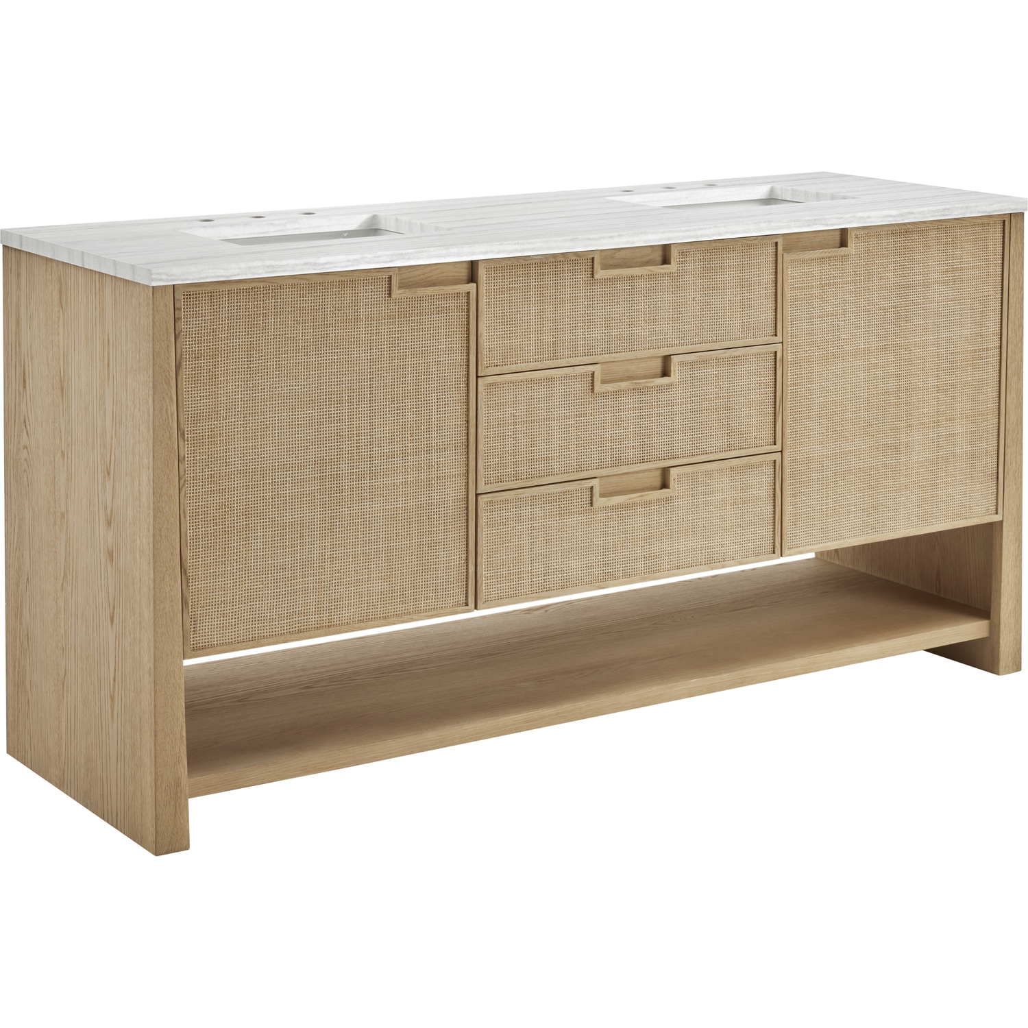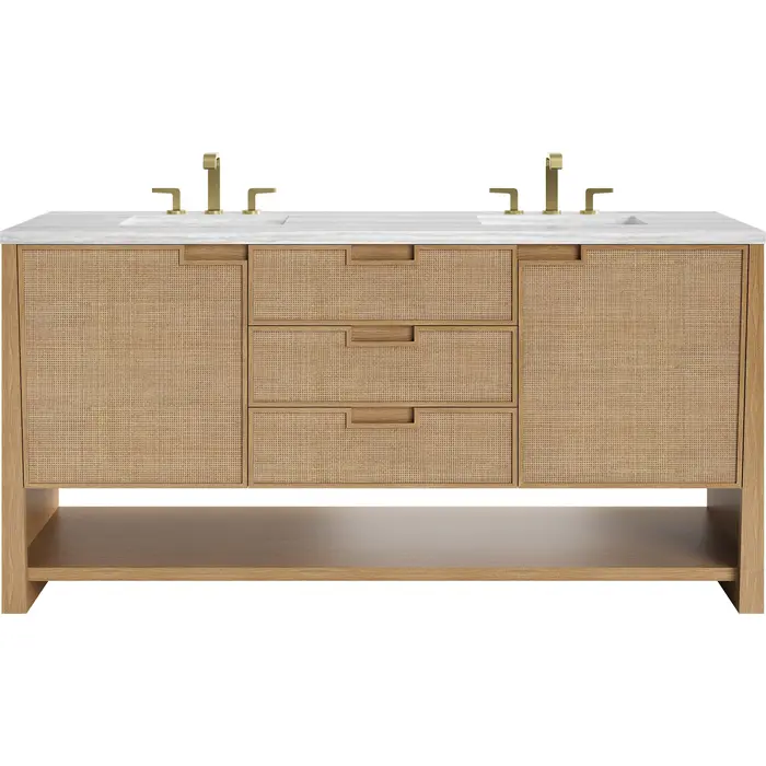 The Solene 72" Double Vanity elegantly weaves together a beautiful blend of natural materials. Framed in solid White Oak, the natural Cane detail and warm Seaside Oak finish make the Solene a stunning centerpiece for your bathroom. The subtle reverse-tapered legs and modern cutout cabinet pulls add visual intrigue to your space. Featuring two integrated USB/120V power units and a removable White Oak drawer organizer, this vanity offers ample storage with its three full-extension drawers and two cabinet doors with interior shelving and two internal drawers, in addition to an open lower shelf. Completed with a modern Arctic Fall Solid Surface top and undermount sinks, the Solene vanity will bring your bathroom to life with its blend of natural elements and contemporary aesthetic.Three full-extension drawers, two single-door cabinets opening to reveal internal drawers, and a lower console shelfDrawer boxes feature English Dovetail joinery with premium, soft-close undermount drawer slides; doors feature soft-close, adjustable door hingesSolid White Oak cabinet features a multi-stage premium finish coat to offer UV and moisture resistanceSeaside Oak finishCountertop is pre-drilled for an 8" widespread faucet; our 3cm eased edge countertops come with white porcelain rectangular sink(s) that ship separately and include mounting brackets for easy installationTwo integrated 120V outlets with USB portsDrawers lined with our signature brushed aluminum laminate for easy cleaningRemovable White Oak drawer organizer includedFreestanding vanityFaucets sold separatelyRooted in the elegance of Scandinavian simplicity and the craftsmanship of Arts and Crafts design, the Solene Collection showcases a masterful blend of architectural finesse. Built from solid White Oak with White Oak veneers and natural Cane, the Solene weaves together an elegant blend of natural materials. The subtle reverse-tapered legs add visual intrigue, and the natural Cane door and drawer panels utilize modern cutout cabinet pulls. Offered in an elegant Seaside Oak finish and three sizes, the Solene offers generous storage with both exterior and interior drawers. Bring your bathroom to life with the natural elements and contemporary aesthetic of Solene.1 year warranty against manufacturer's defects. We will repair or replace any defective product, if the product is defective in material or workmanship at our discretion. No warranty is expressed or implied regarding damages resulting from consumer misuse.