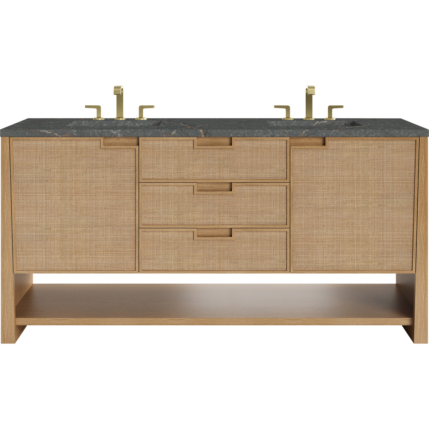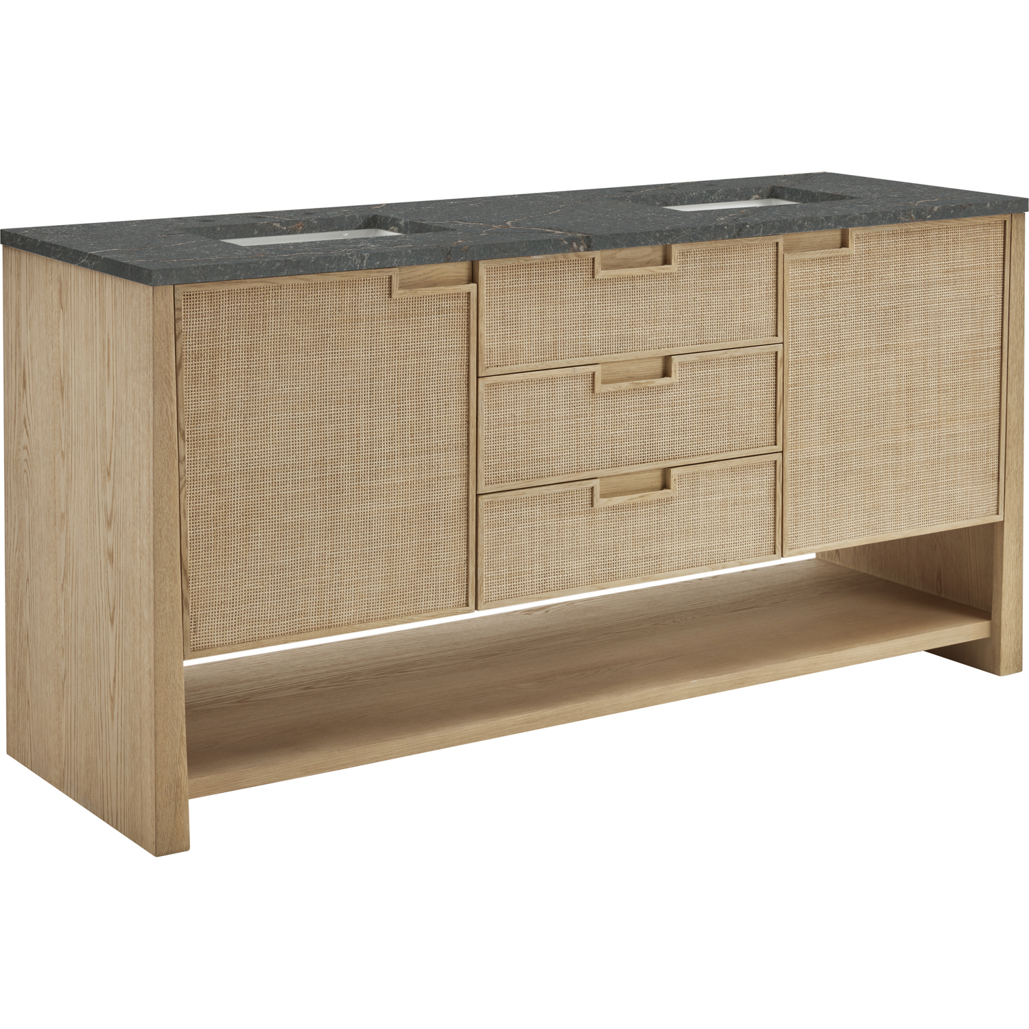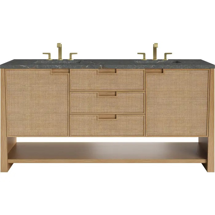 The Solene 72" Double Vanity elegantly weaves together a beautiful blend of natural materials. Framed in solid White Oak, the natural Cane detail and warm Seaside Oak finish make the Solene a stunning centerpiece for your bathroom. The subtle reverse-tapered legs and modern cutout cabinet pulls add visual intrigue to your space. Featuring two integrated USB/120V power units and a removable White Oak drawer organizer, this vanity offers ample storage with its three full-extension drawers and two cabinet doors with interior shelving and two internal drawers, in addition to an open lower shelf. Completed with a gorgeous Parisien Bleu Silestone top and undermount sinks, the Solene vanity will bring your bathroom to life with its blend of natural elements and contemporary aesthetic.Three full-extension drawers, two single-door cabinets opening to reveal internal drawers, and a lower console shelfDrawer boxes feature English Dovetail joinery with premium, soft-close undermount drawer slides; doors feature soft-close, adjustable door hingesSolid White Oak cabinet features a multi-stage premium finish coat to offer UV and moisture resistanceSeaside Oak finishCountertop is pre-drilled for an 8" widespread faucet; our 3cm eased edge countertops come with white porcelain rectangular sink(s) that ship separately and include mounting brackets for easy installationTwo integrated 120V outlets with USB portsDrawers lined with our signature brushed aluminum laminate for easy cleaningRemovable White Oak drawer organizer includedFreestanding vanityFaucets sold separatelyRooted in the elegance of Scandinavian simplicity and the craftsmanship of Arts and Crafts design, the Solene Collection showcases a masterful blend of architectural finesse. Built from solid White Oak with White Oak veneers and natural Cane, the Solene weaves together an elegant blend of natural materials. The subtle reverse-tapered legs add visual intrigue, and the natural Cane door and drawer panels utilize modern cutout cabinet pulls. Offered in an elegant Seaside Oak finish and three sizes, the Solene offers generous storage with both exterior and interior drawers. Bring your bathroom to life with the natural elements and contemporary aesthetic of Solene.1 year warranty against manufacturer's defects. We will repair or replace any defective product, if the product is defective in material or workmanship at our discretion. No warranty is expressed or implied regarding damages resulting from consumer misuse.