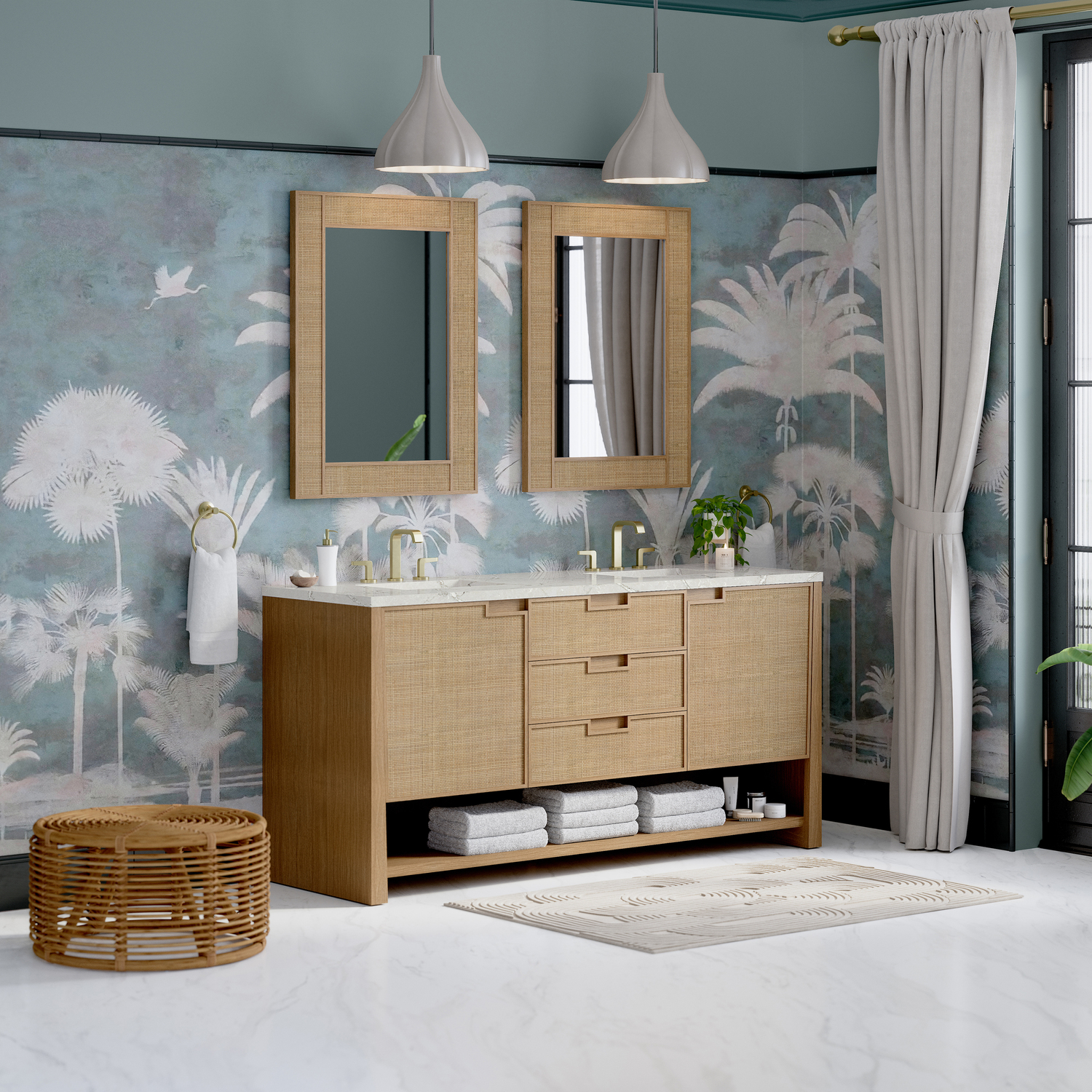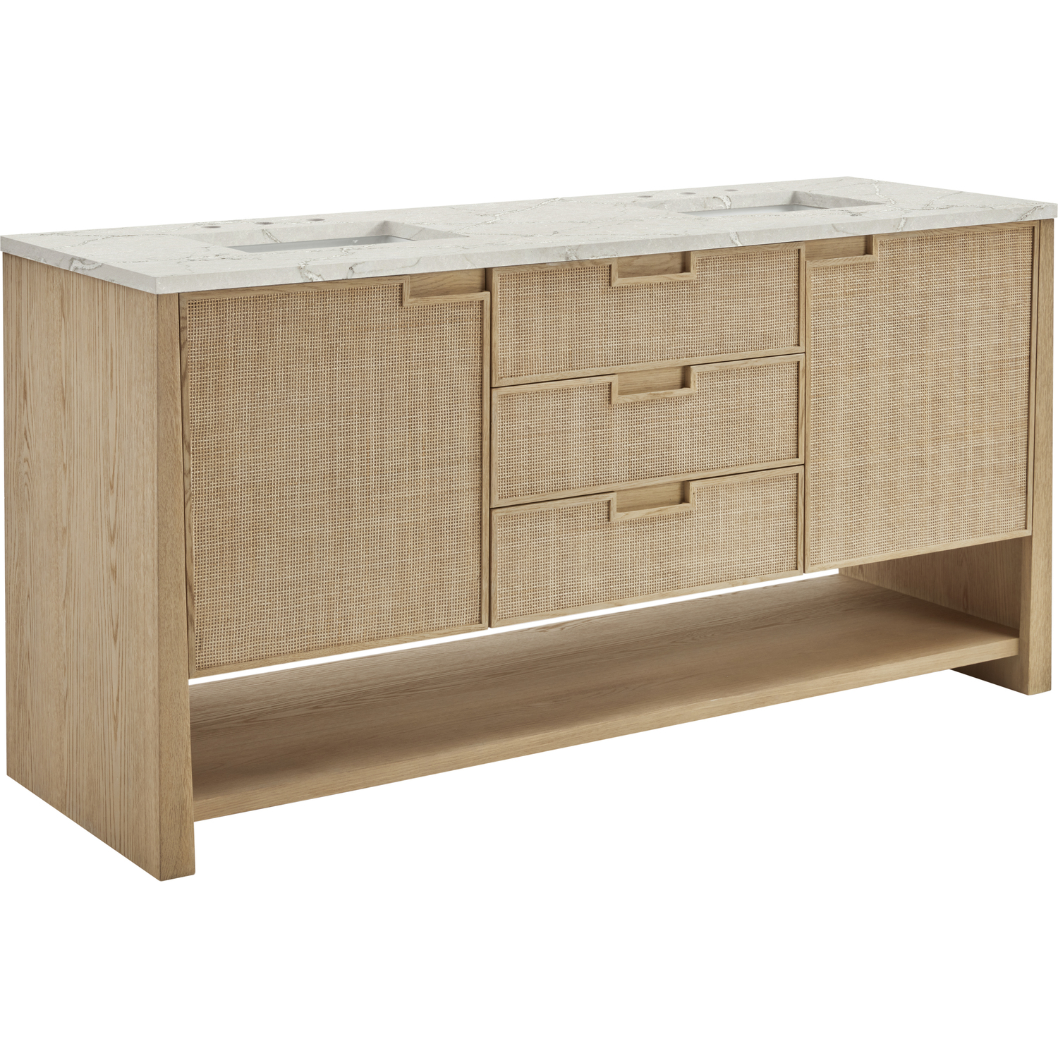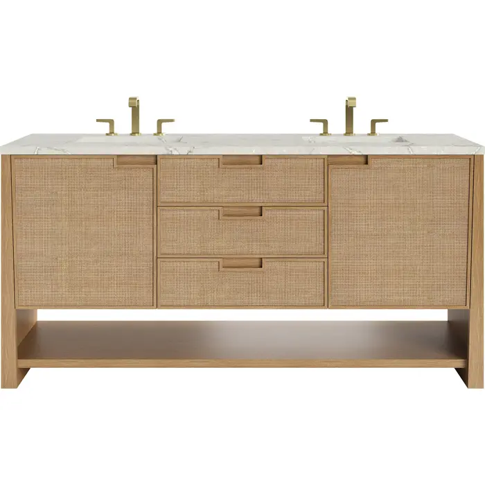 The Solene 72" Double Vanity elegantly weaves together a beautiful blend of natural materials. Framed in solid White Oak, the natural Cane detail and warm Seaside Oak finish make the Solene a stunning centerpiece for your bathroom. The subtle reverse-tapered legs and modern cutout cabinet pulls add visual intrigue to your space. Featuring two integrated USB/120V power units and a removable White Oak drawer organizer, this vanity offers ample storage with its three full-extension drawers and two cabinet doors with interior shelving and two internal drawers, in addition to an open lower shelf. Completed with a beautiful Victorian Silver Silestone top and undermount sinks, the Solene vanity will bring your bathroom to life with its blend of natural elements and contemporary aesthetic.Three full-extension drawers, two single-door cabinets opening to reveal internal drawers, and a lower console shelfDrawer boxes feature English Dovetail joinery with premium, soft-close undermount drawer slides; doors feature soft-close, adjustable door hingesSolid White Oak cabinet features a multi-stage premium finish coat to offer UV and moisture resistanceSeaside Oak finishCountertop is pre-drilled for an 8" widespread faucet; our 3cm eased edge countertops come with white porcelain rectangular sink(s) that ship separately and include mounting brackets for easy installationTwo integrated 120V outlets with USB portsDrawers lined with our signature brushed aluminum laminate for easy cleaningRemovable White Oak drawer organizer includedFreestanding vanityFaucets sold separatelyRooted in the elegance of Scandinavian simplicity and the craftsmanship of Arts and Crafts design, the Solene Collection showcases a masterful blend of architectural finesse. Built from solid White Oak with White Oak veneers and natural Cane, the Solene weaves together an elegant blend of natural materials. The subtle reverse-tapered legs add visual intrigue, and the natural Cane door and drawer panels utilize modern cutout cabinet pulls. Offered in an elegant Seaside Oak finish and three sizes, the Solene offers generous storage with both exterior and interior drawers. Bring your bathroom to life with the natural elements and contemporary aesthetic of Solene.1 year warranty against manufacturer's defects. We will repair or replace any defective product, if the product is defective in material or workmanship at our discretion. No warranty is expressed or implied regarding damages resulting from consumer misuse.