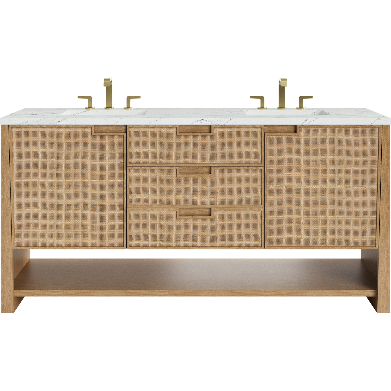 The Solene 72" Double Vanity by James Martin Vanities elegantly weaves together a beautiful blend of natural materials. Framed in solid White Oak, the natural Cane detail and warm Seaside Oak finish make the Solene a stunning centerpiece for your bathroom. The subtle reverse-tapered legs and modern cutout cabinet pulls add visual intrigue to your space. Featuring two integrated USB/120V power units and a removable White Oak drawer organizer, this vanity offers ample storage with its three full-extension drawers and two cabinet doors with interior shelving and two internal drawers, in addition to an open lower shelf. Completed with a striking Ethereal Noctis Silestone® top and undermount sinks, the Solene vanity will bring your bathroom to life with its blend of natural elements and contemporary aesthetic. This unit is enabled with FreePower wireless charging; featuring a two-device charger seamlessly embedded into the countertop, indicated by a light-up halo in between the sinks. Designed for modern living, FreePower offers convenient, integrated, wireless charging when and where you need it.Three full-extension drawers, two single-door cabinets opening to reveal internal drawers, and a lower console shelfDrawer boxes feature English Dovetail joinery with premium, soft-close undermount drawer slides; doors feature soft-close, adjustable door hingesSolid White Oak cabinet features a multi-stage premium finish coat to offer UV and moisture resistanceSeaside Oak finish, sans hardwareCountertop is pre-drilled for 8" widespread faucets; our 3cm eased edge countertops come with white porcelain rectangular sink(s) that ship separately and include mounting brackets for easy installationTwo integrated 120V outlets with USB portsDrawers lined with our signature brushed aluminum laminate for easy cleaningRemovable White Oak drawer organizer includedFreestanding vanityFreePower Wireless Charging; two-device unit in between sinksFaucets sold separatelyMatching stone backsplash available as add-on purchaseRooted in the elegance of Scandinavian simplicity and the craftsmanship of Arts and Crafts design, the Solene Collection by James Martin Vanities showcases a masterful blend of architectural finesse. Built from solid White Oak with White Oak veneers and natural Cane, the Solene weaves together an elegant blend of natural materials. The subtle reverse-tapered legs add visual intrigue, and the natural Cane door and drawer panels utilize modern cutout cabinet pulls. Offered in an elegant Seaside Oak finish and three sizes, the Solene offers generous storage with both exterior and interior drawers. Bring your bathroom to life with the natural elements and contemporary aesthetic of Solene.1 year warranty against manufacturer's defects. We will repair or replace any defective product, if the product is defective in material or workmanship at our discretion. No warranty is expressed or implied regarding damages resulting from consumer misuse.