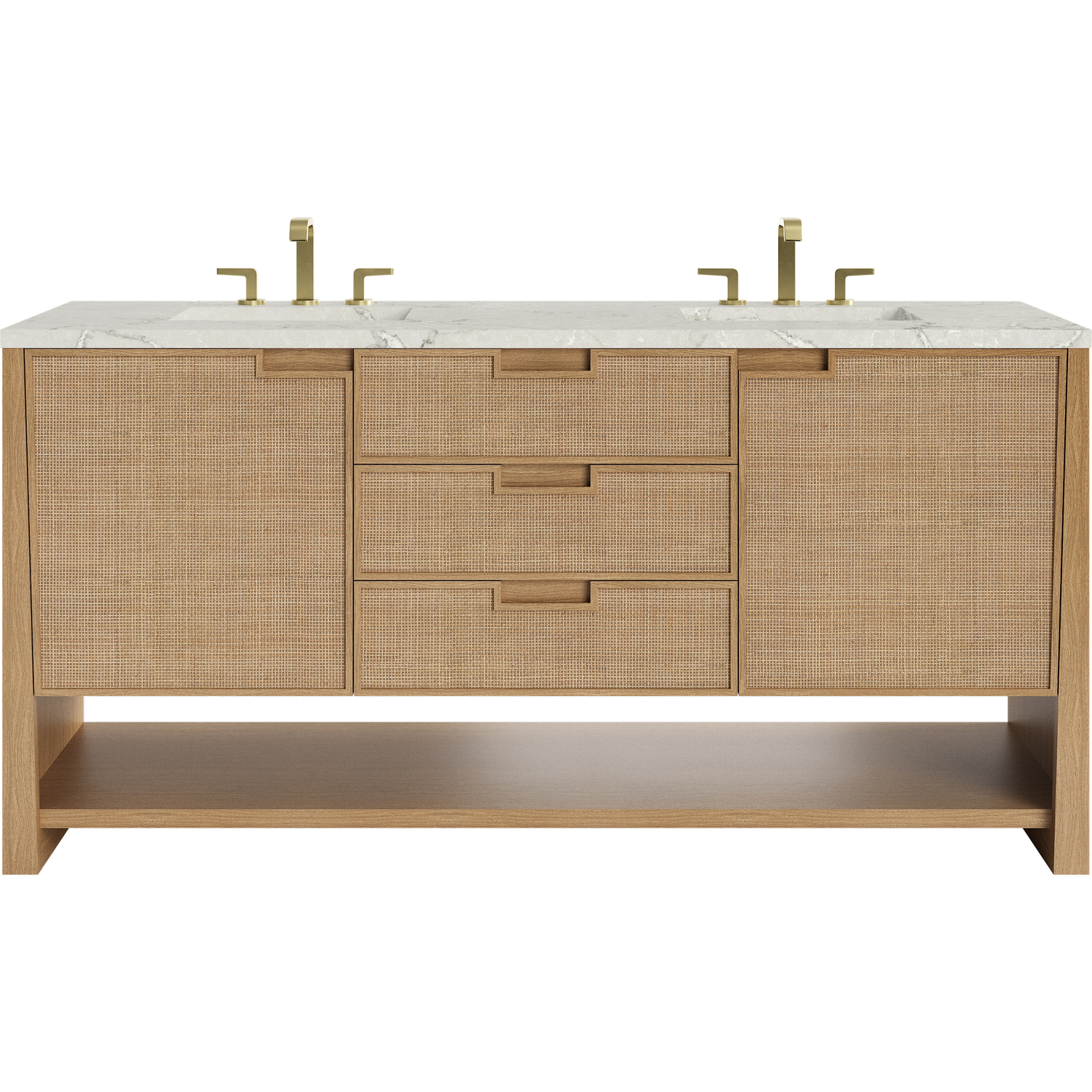 The Solene 72" Double Vanity by James Martin Vanities elegantly weaves together a beautiful blend of natural materials. Framed in solid White Oak, the natural Cane detail and warm Seaside Oak finish make the Solene a stunning centerpiece for your bathroom. The subtle reverse-tapered legs and modern cutout cabinet pulls add visual intrigue to your space. Featuring two integrated USB/120V power units and a removable White Oak drawer organizer, this vanity offers ample storage with its three full-extension drawers and two cabinet doors with interior shelving and two internal drawers, in addition to an open lower shelf. Completed with a beautiful Victorian Silver Silestone® top and undermount sinks, the Solene vanity will bring your bathroom to life with its blend of natural elements and contemporary aesthetic. This unit is enabled with FreePower wireless charging; featuring a two-device charger seamlessly embedded into the countertop, indicated by a light-up halo in between the sinks. Designed for modern living, FreePower offers convenient, integrated, wireless charging when and where you need it.Three full-extension drawers, two single-door cabinets opening to reveal internal drawers, and a lower console shelfDrawer boxes feature English Dovetail joinery with premium, soft-close undermount drawer slides; doors feature soft-close, adjustable door hingesSolid White Oak cabinet features a multi-stage premium finish coat to offer UV and moisture resistanceSeaside Oak finish, sans hardwareCountertop is pre-drilled for 8" widespread faucets; our 3cm eased edge countertops come with white porcelain rectangular sink(s) that ship separately and include mounting brackets for easy installationTwo integrated 120V outlets with USB portsDrawers lined with our signature brushed aluminum laminate for easy cleaningRemovable White Oak drawer organizer includedFreestanding vanityFreePower Wireless Charging; two-device unit in between sinksFaucets sold separatelyMatching stone backsplash available as add-on purchaseRooted in the elegance of Scandinavian simplicity and the craftsmanship of Arts and Crafts design, the Solene Collection by James Martin Vanities showcases a masterful blend of architectural finesse. Built from solid White Oak with White Oak veneers and natural Cane, the Solene weaves together an elegant blend of natural materials. The subtle reverse-tapered legs add visual intrigue, and the natural Cane door and drawer panels utilize modern cutout cabinet pulls. Offered in an elegant Seaside Oak finish and three sizes, the Solene offers generous storage with both exterior and interior drawers. Bring your bathroom to life with the natural elements and contemporary aesthetic of Solene.1 year warranty against manufacturer's defects. We will repair or replace any defective product, if the product is defective in material or workmanship at our discretion. No warranty is expressed or implied regarding damages resulting from consumer misuse.